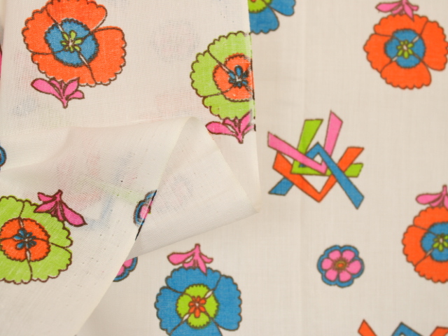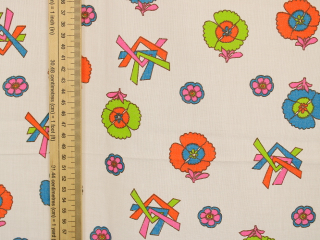 未使用生地。水通ししていません。透けのあるやわらかな薄手地です。おそらくコットン製。柄サイズ、生地感については画像をご参照下さい。1m定規をあてています。