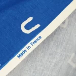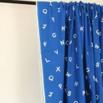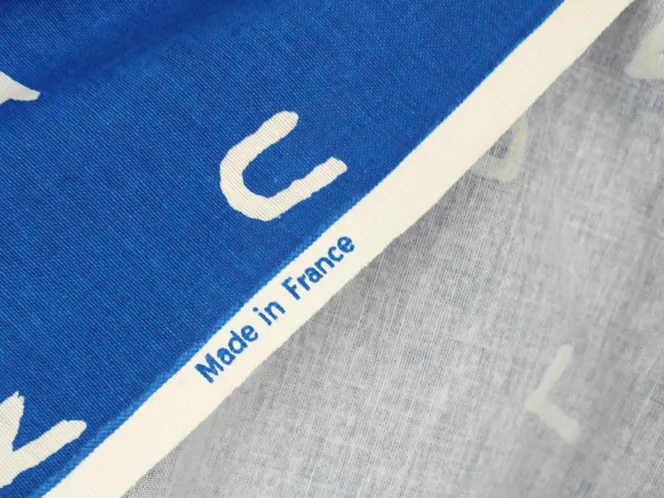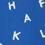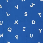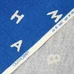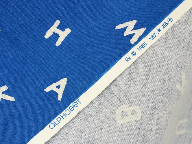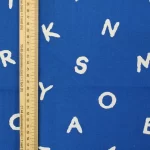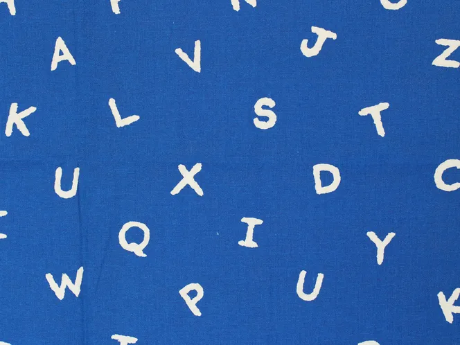 手描き調のシンプルなアルファベット柄ファブリック。青地プリントは自然な色むらがあり、デニムのような質感があります。