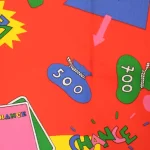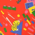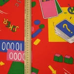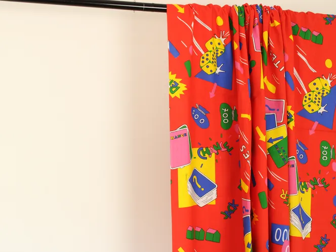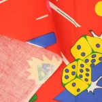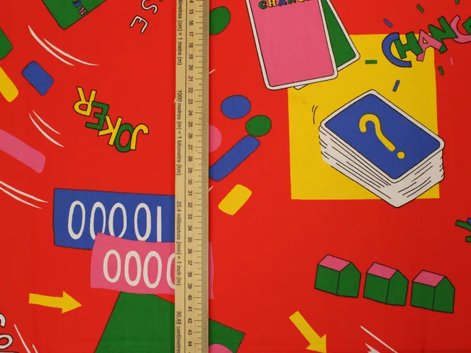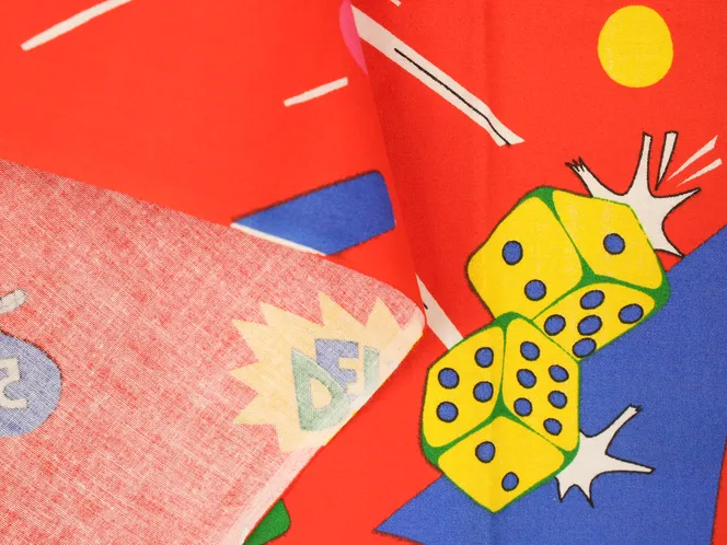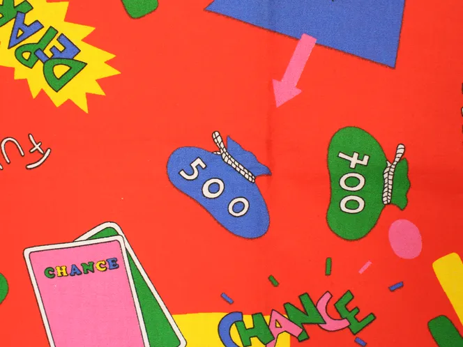 真っ赤な背景のカジノ柄ファブリック。ポップな絵柄とロゴが可愛いデザインです。