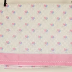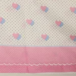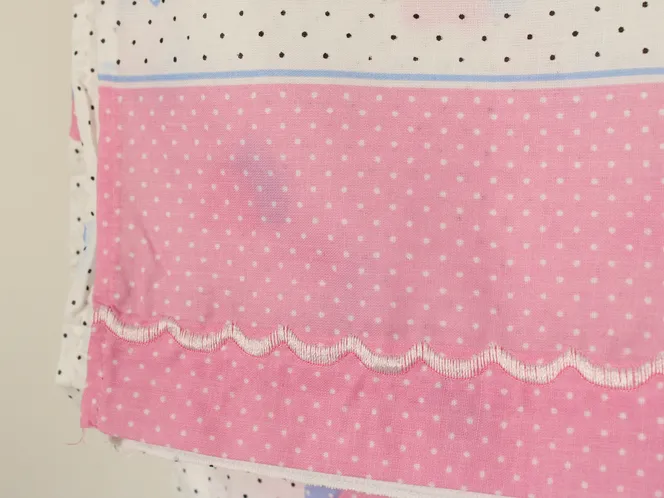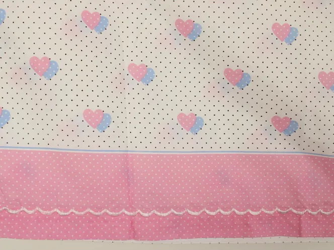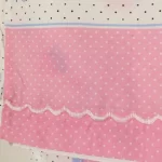 一端がシーツの裾そのままで、ピンク地にスカラップ刺繍が施されています。ピンクが手前のバージョンです。