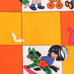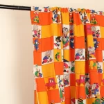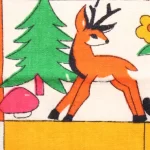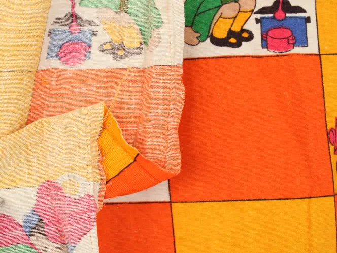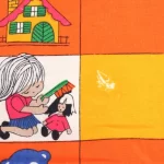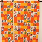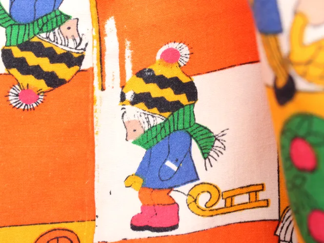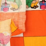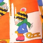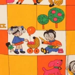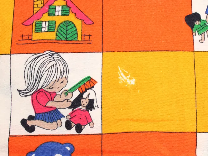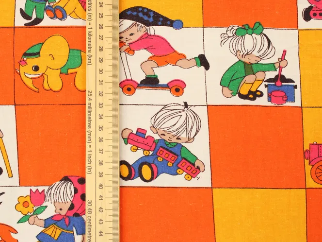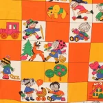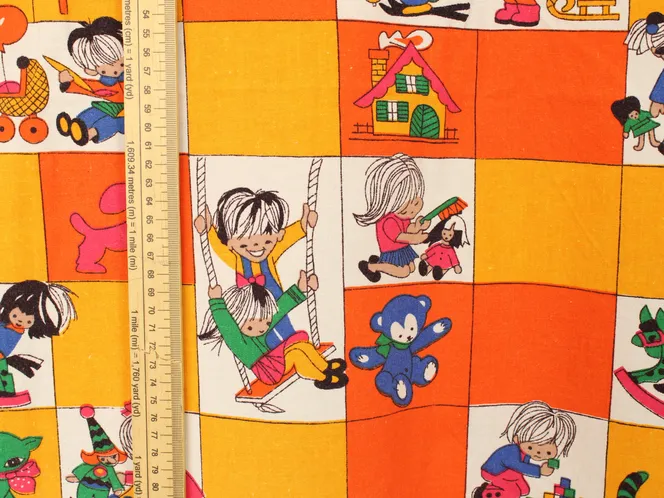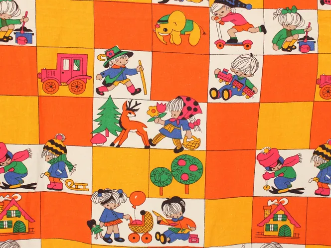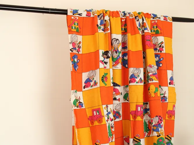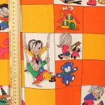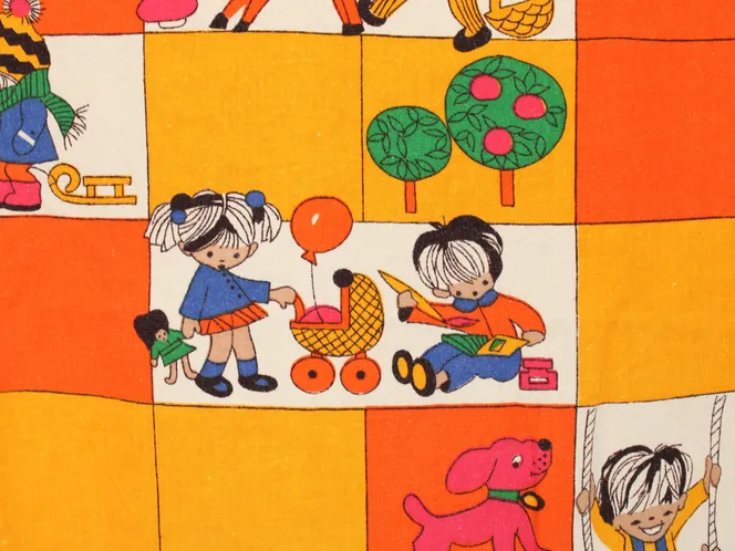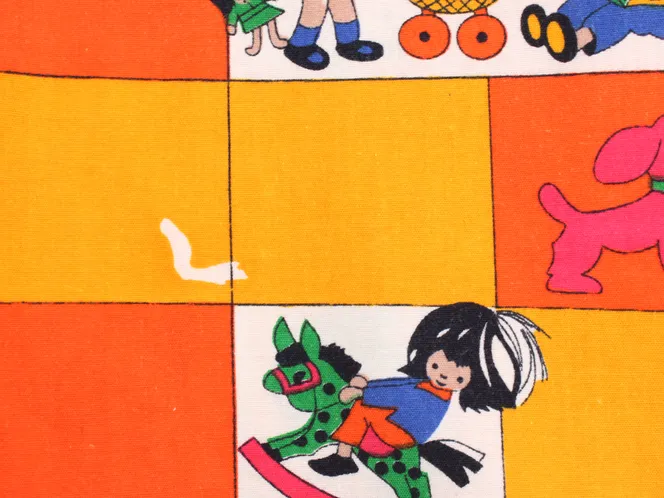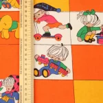 子供と動物、おもちゃなどが描かれたファブリック。