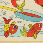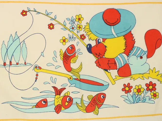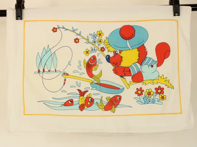 魚釣りをする動物(りす?)柄のピローカバーです。