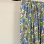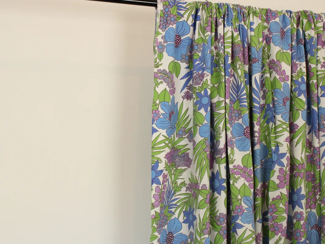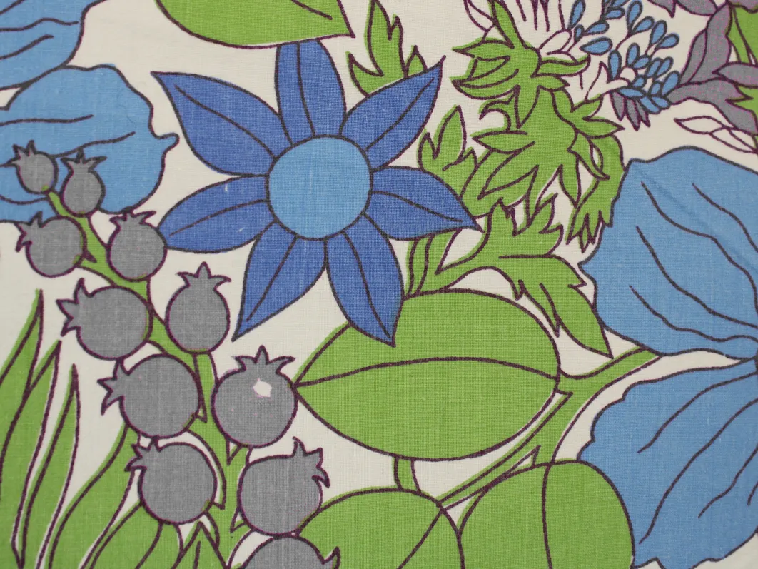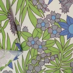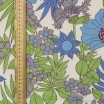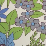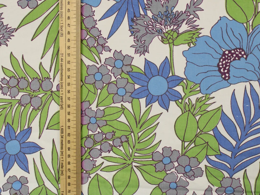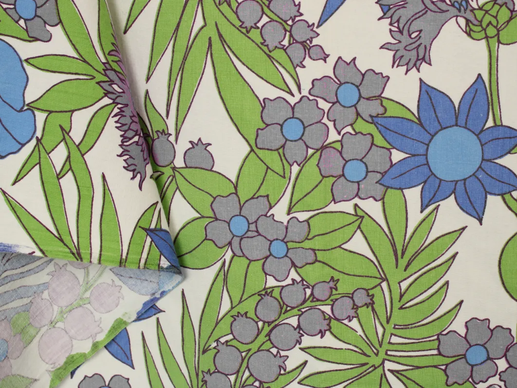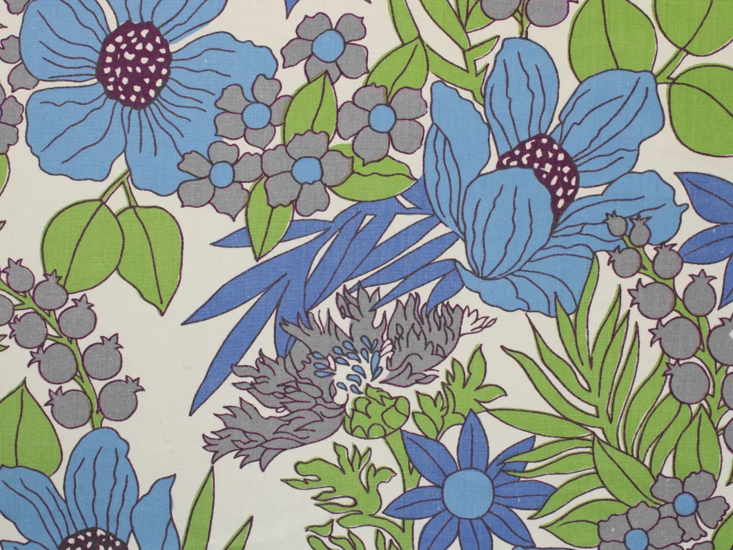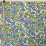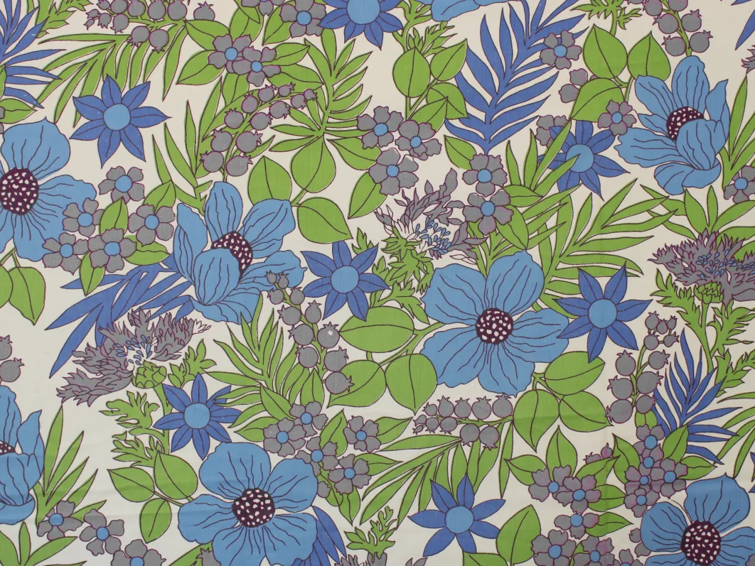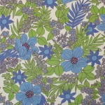 鮮やかな青と紫の花々と緑の葉が印象的な、パワーのあるデザイン。
