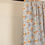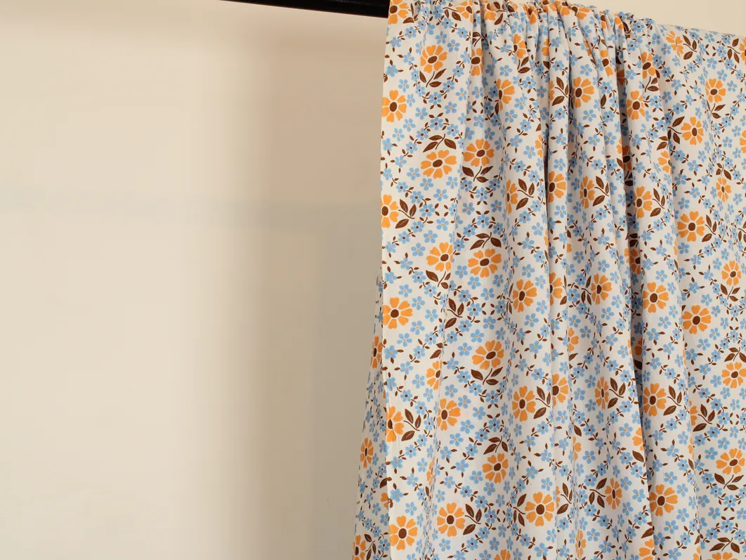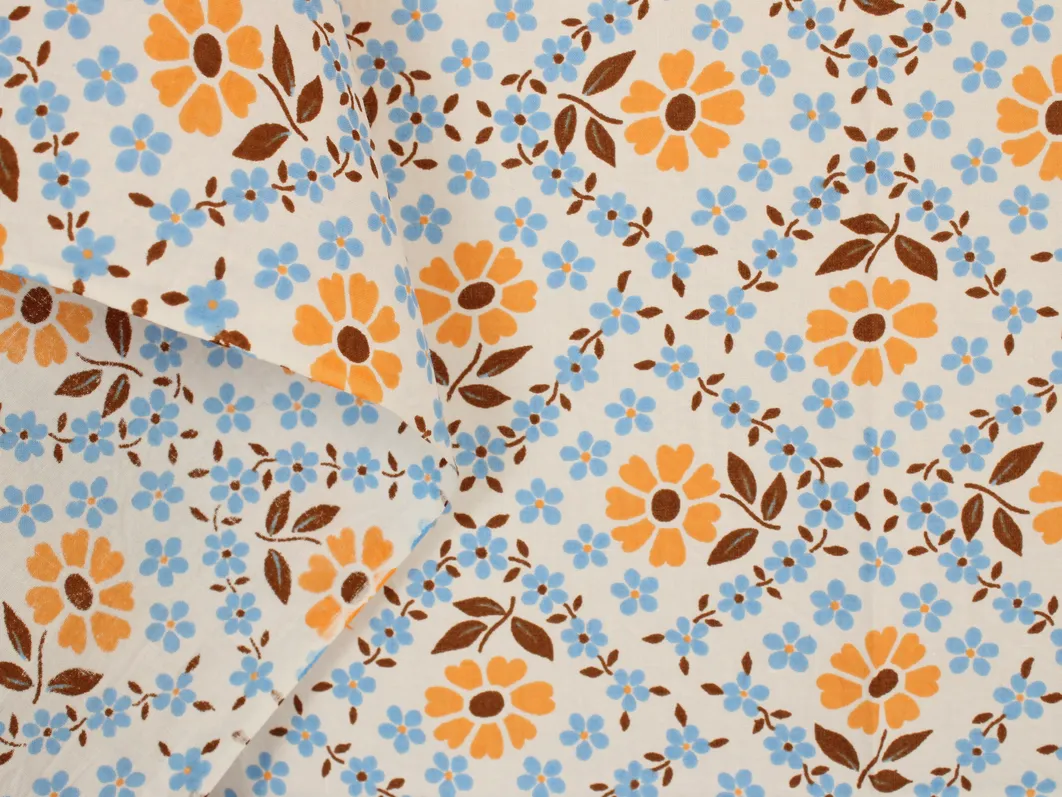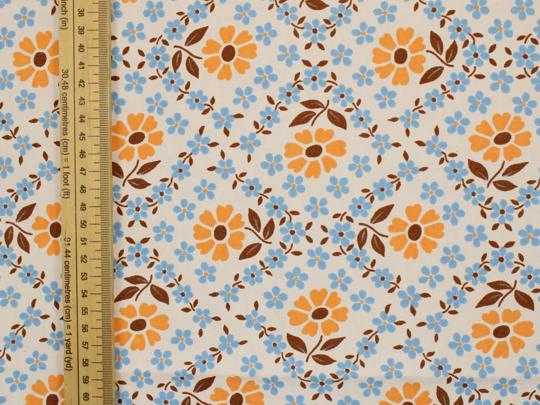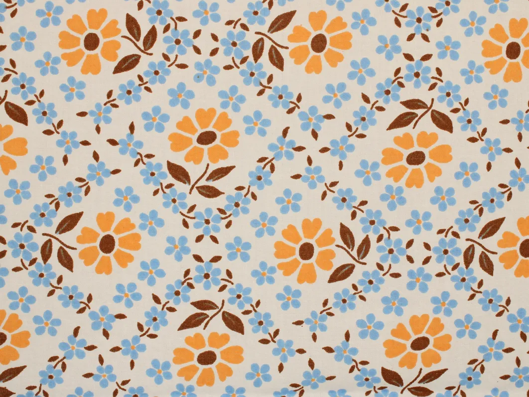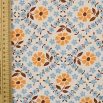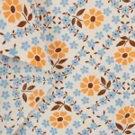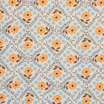 柔らかなオレンジ色の花を囲むように、水色の小花が格子状に並んだデザイン。