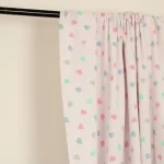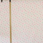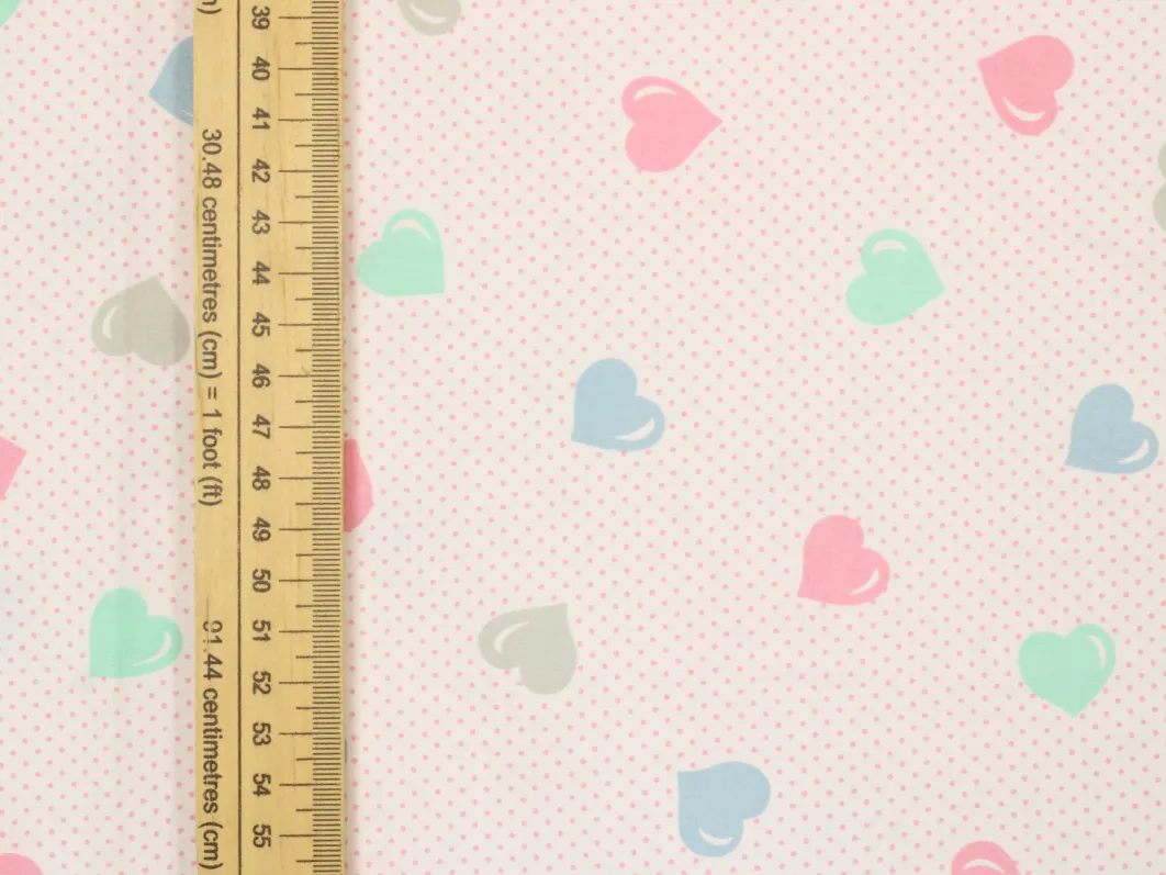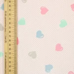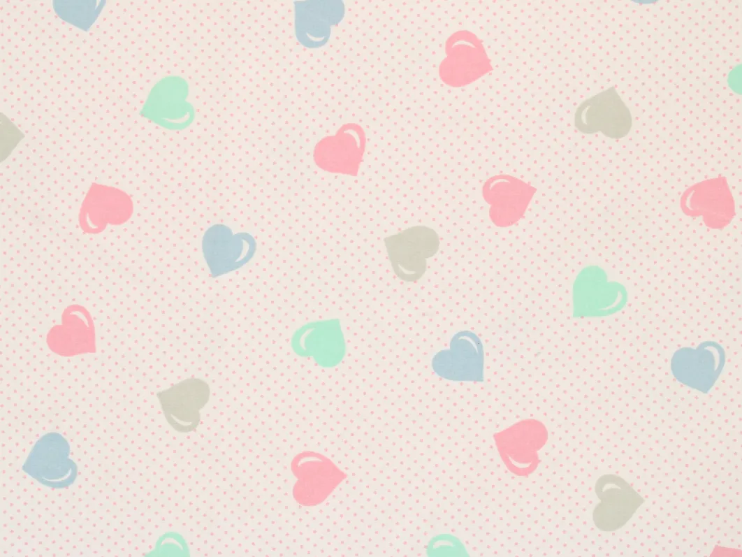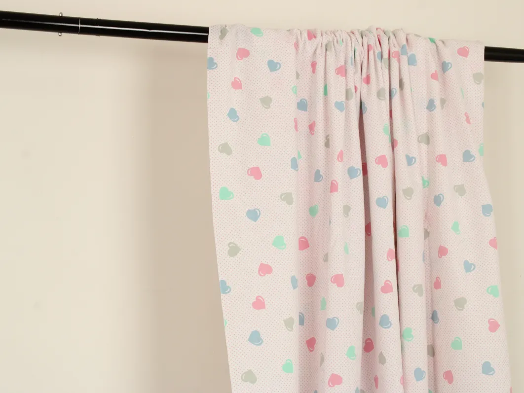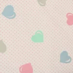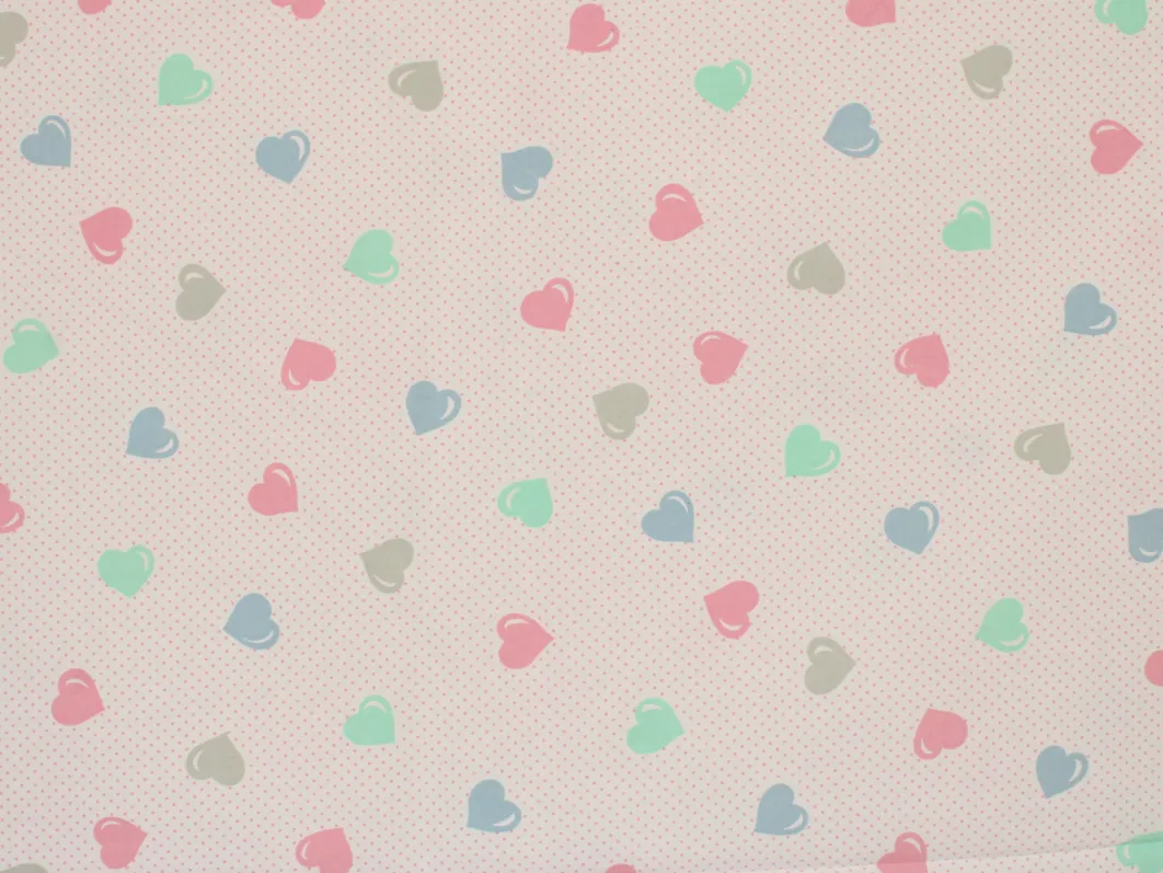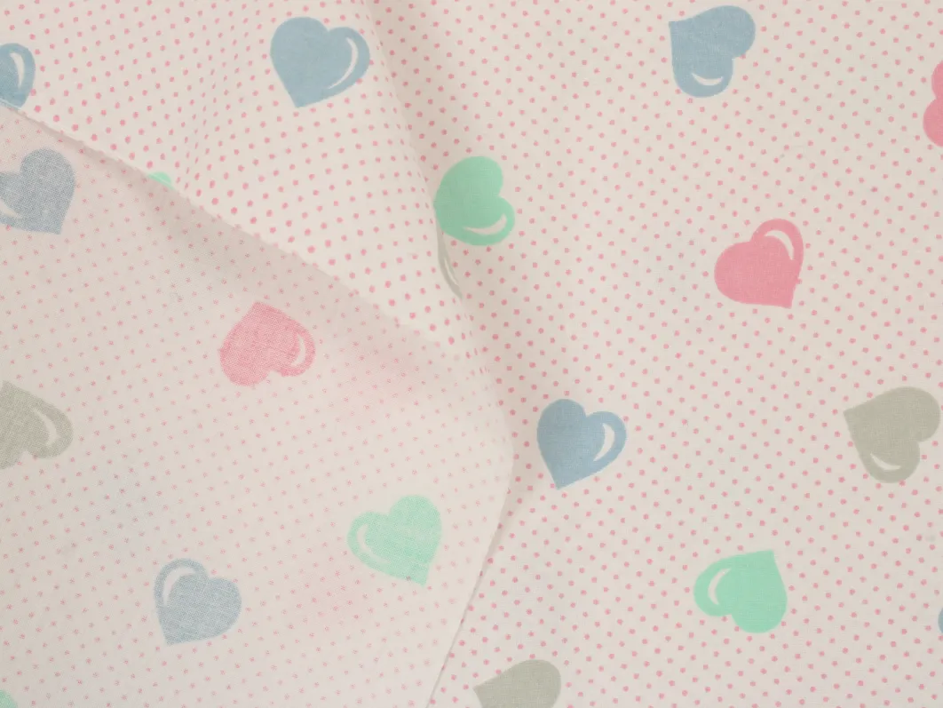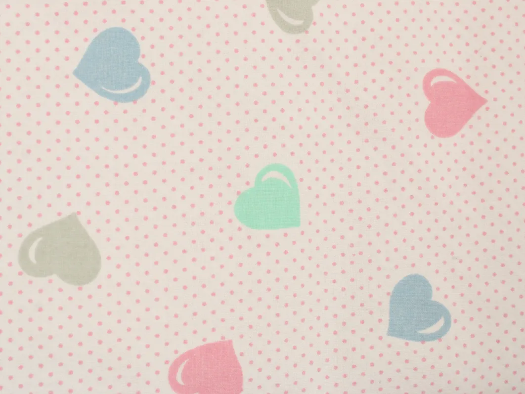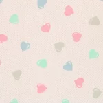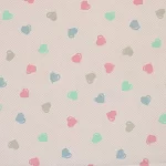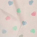 ピンクのドット地に、パステルカラーのハート柄。