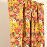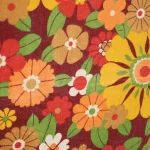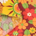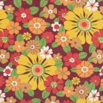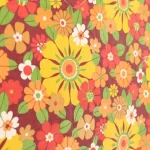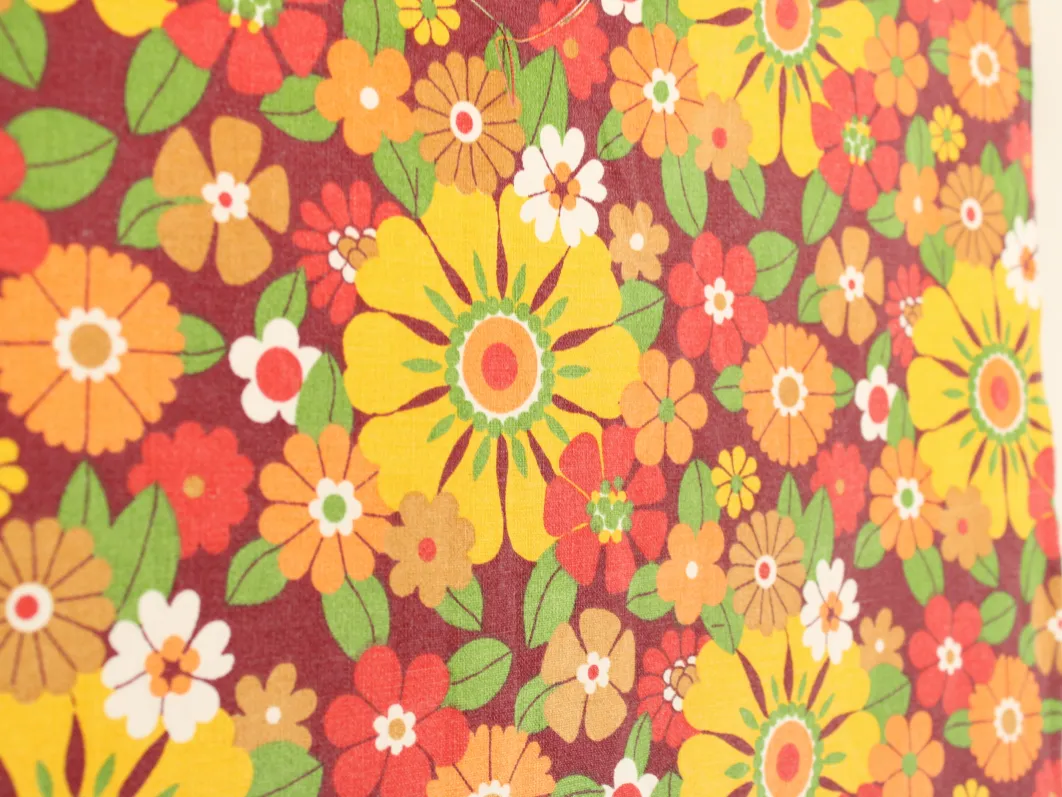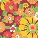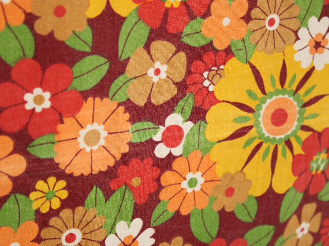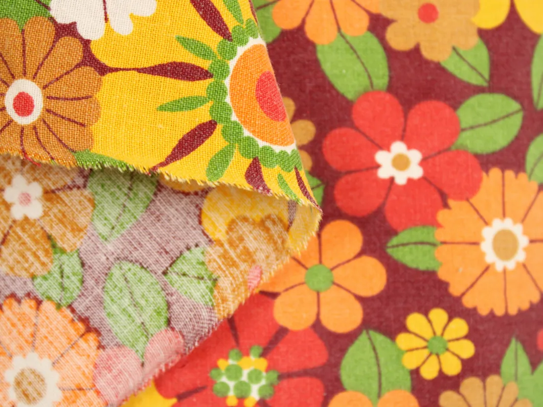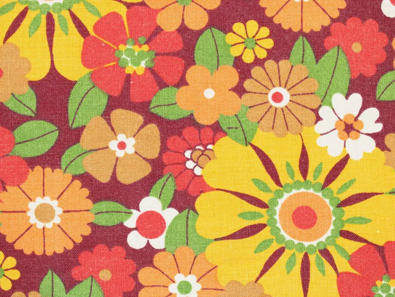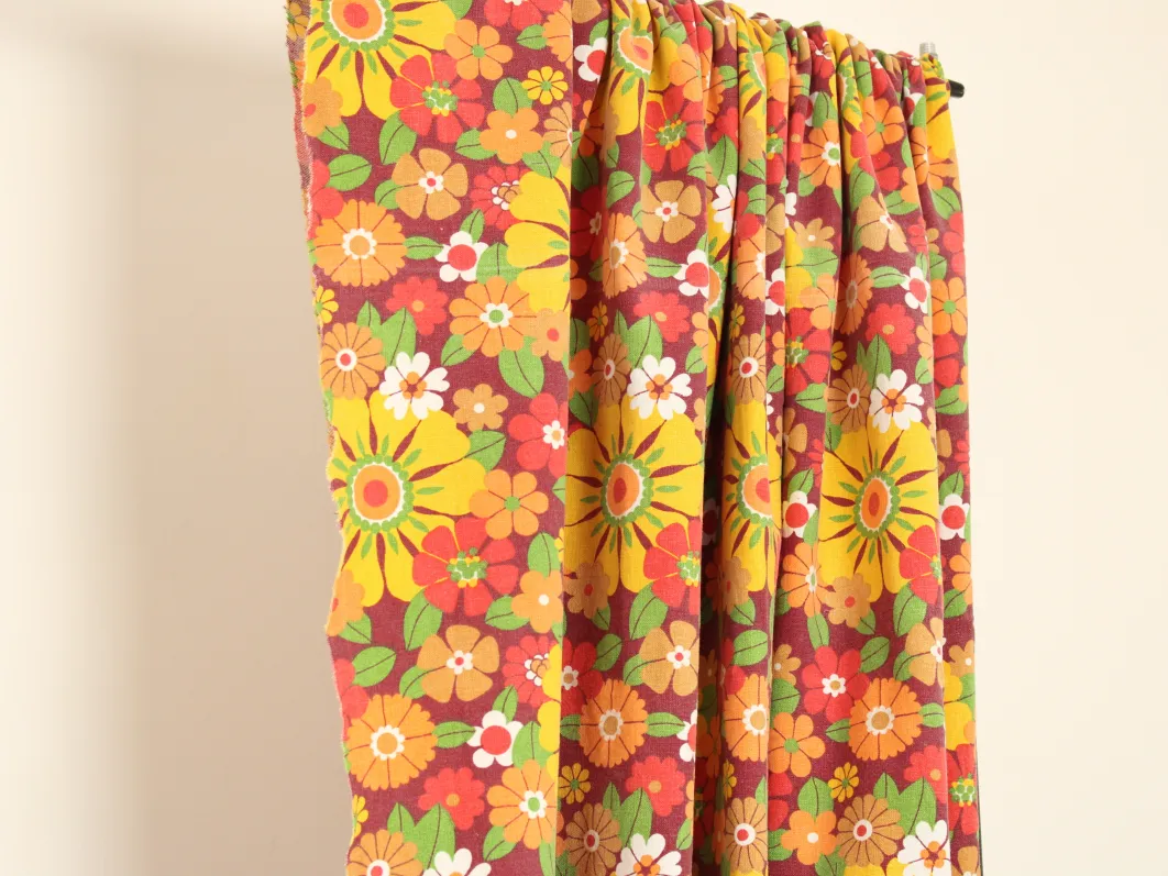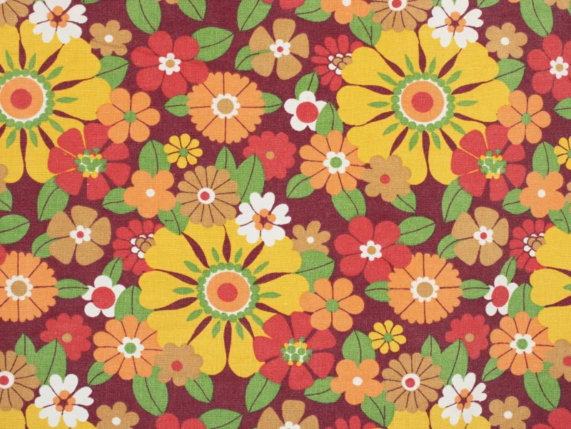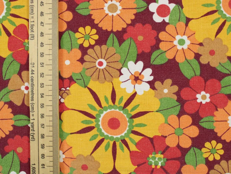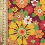 濃い赤色の背景に、黄色やオレンジの暖色がカラフルな花柄ファブリックです。