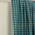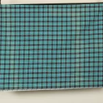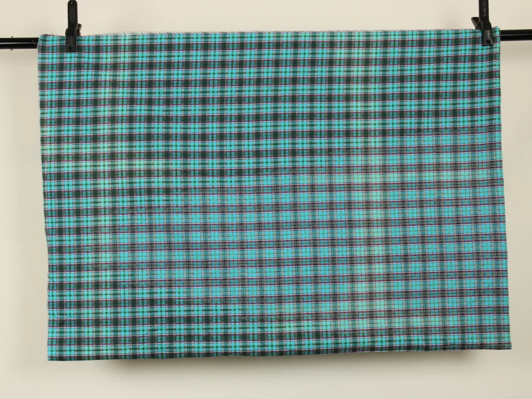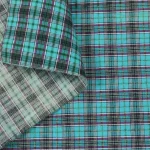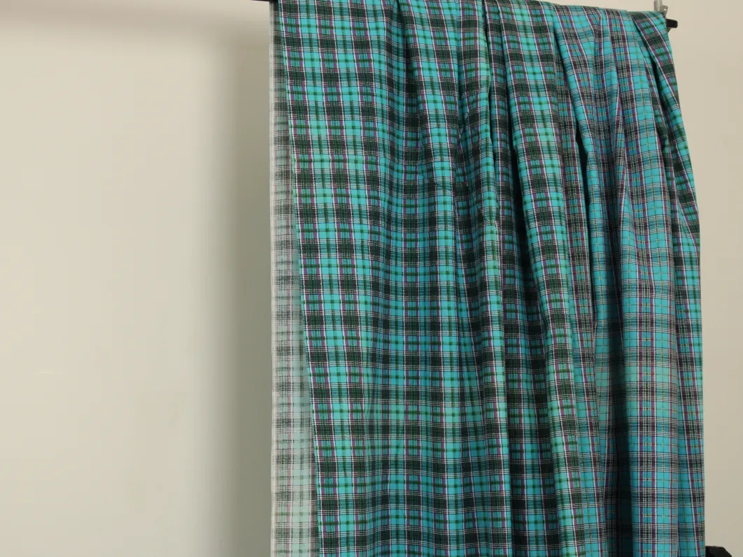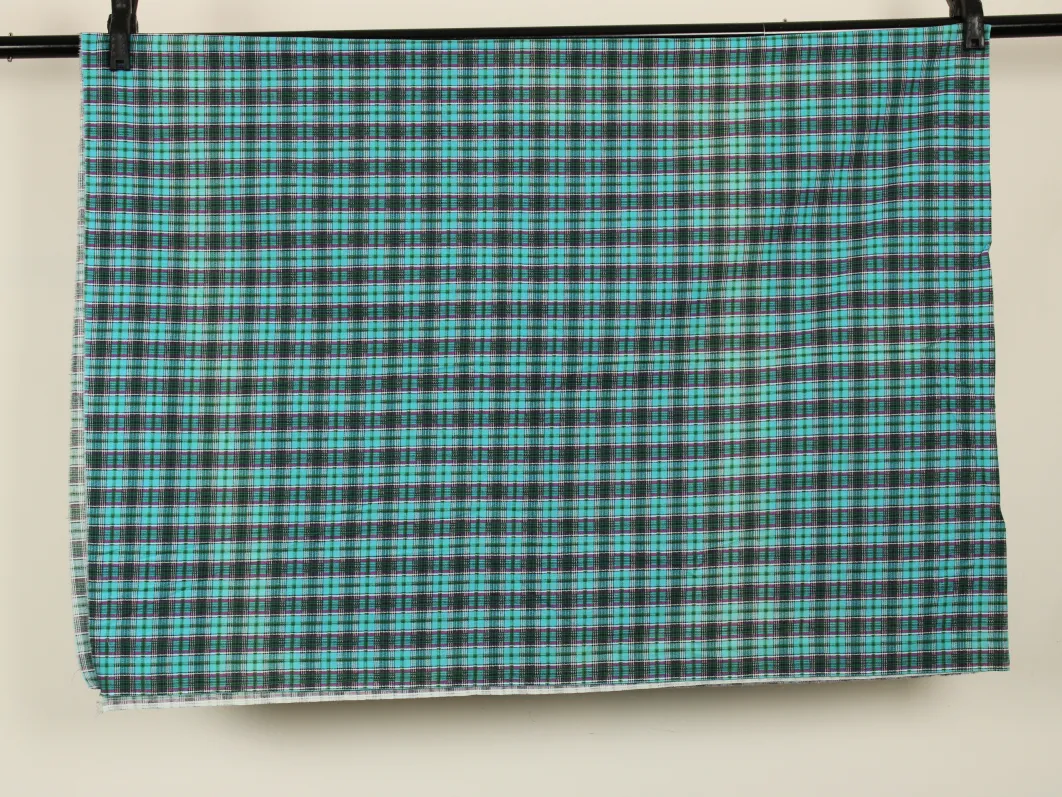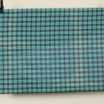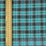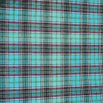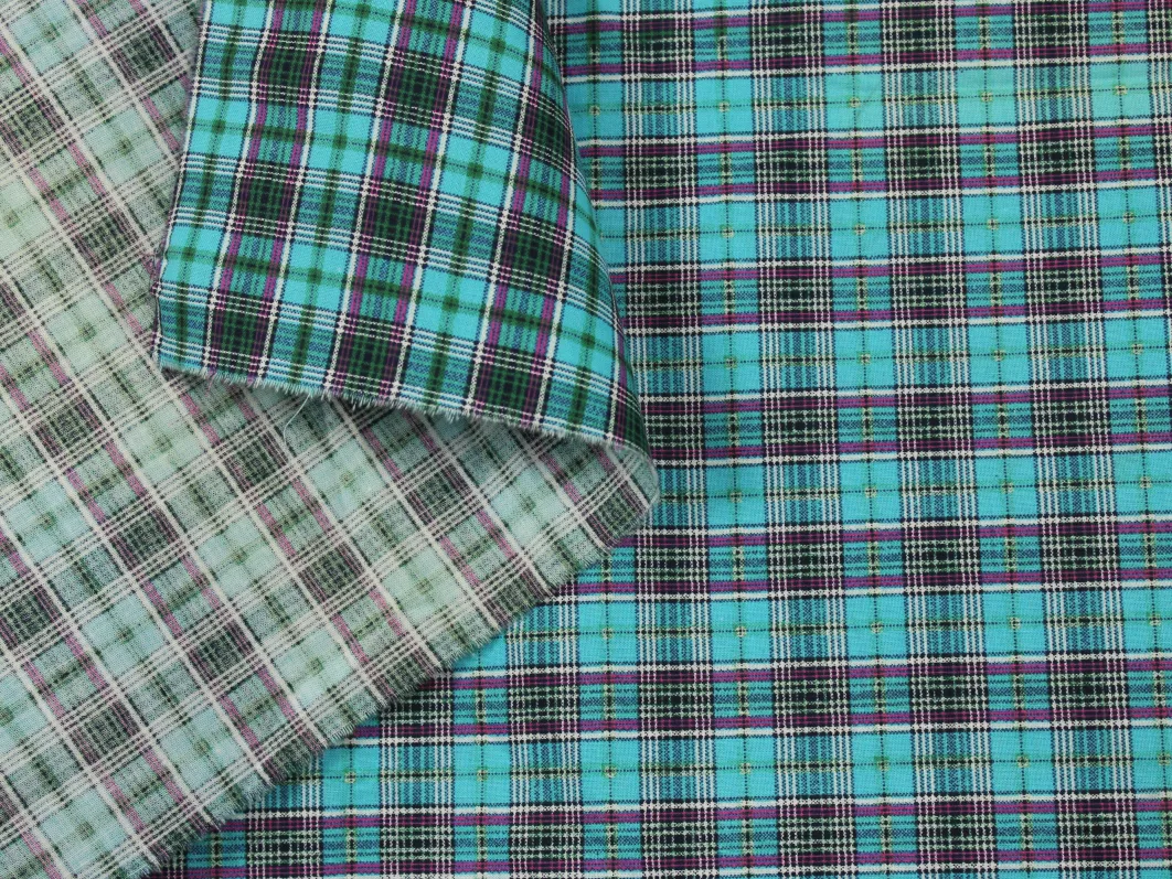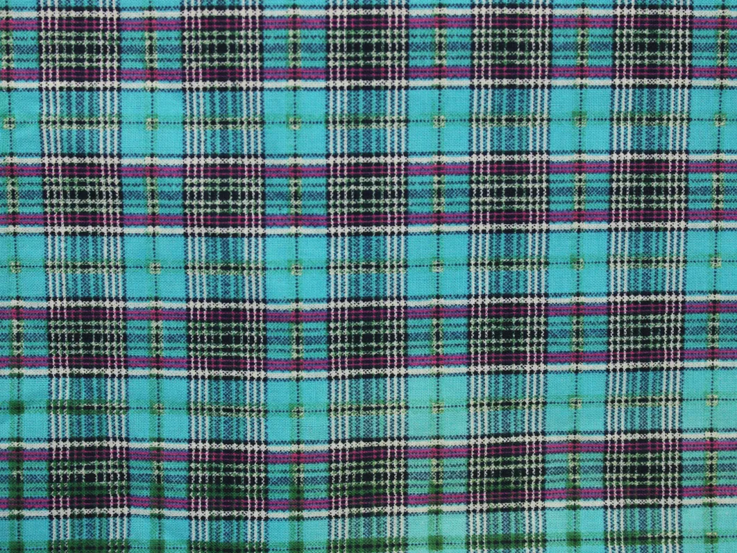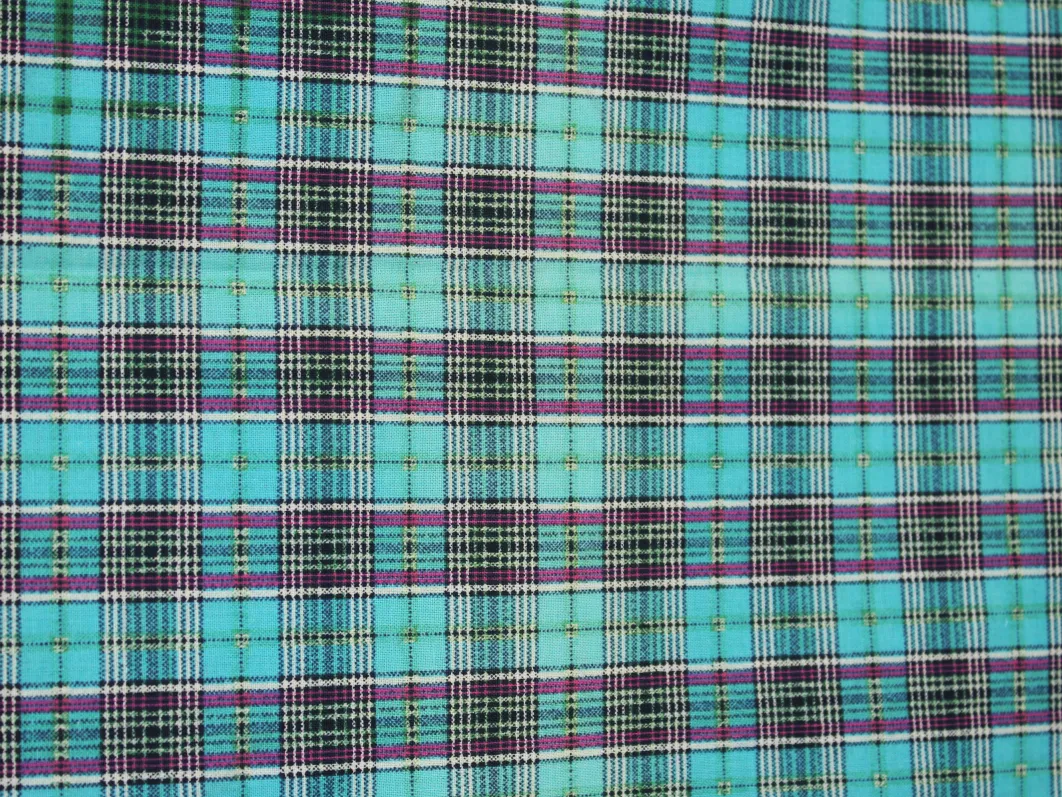 ターコイズブルー、紫、緑、白のタータンチェック。