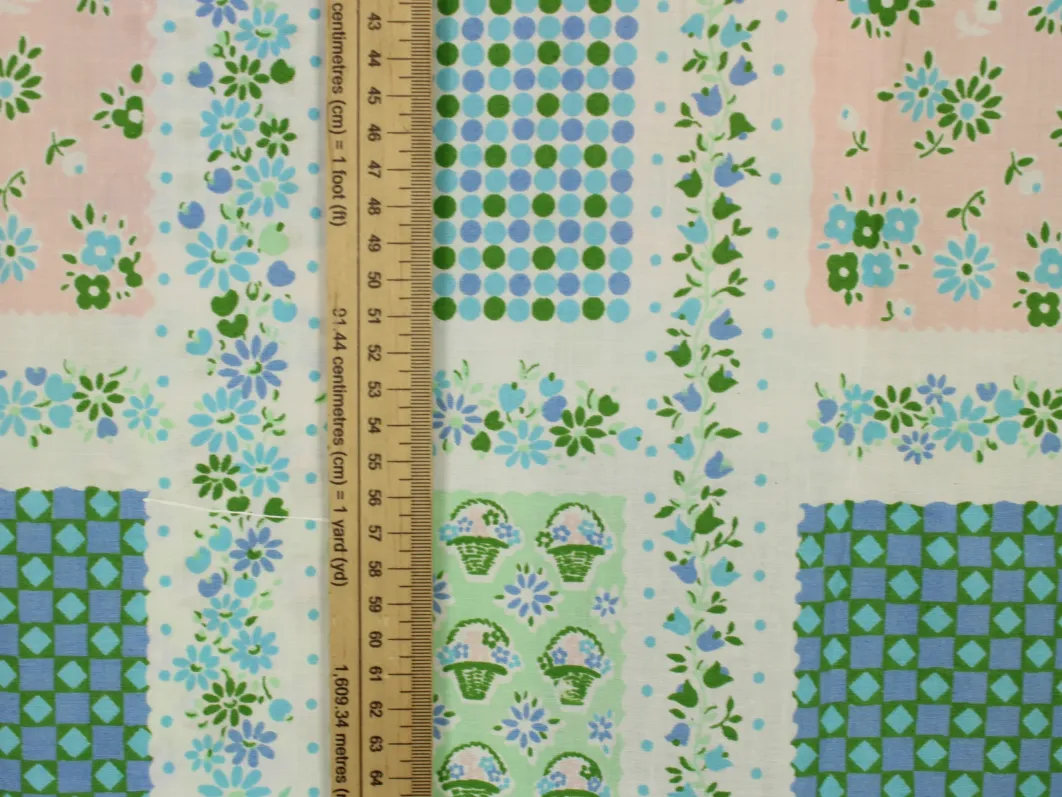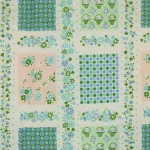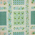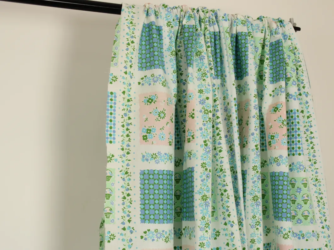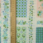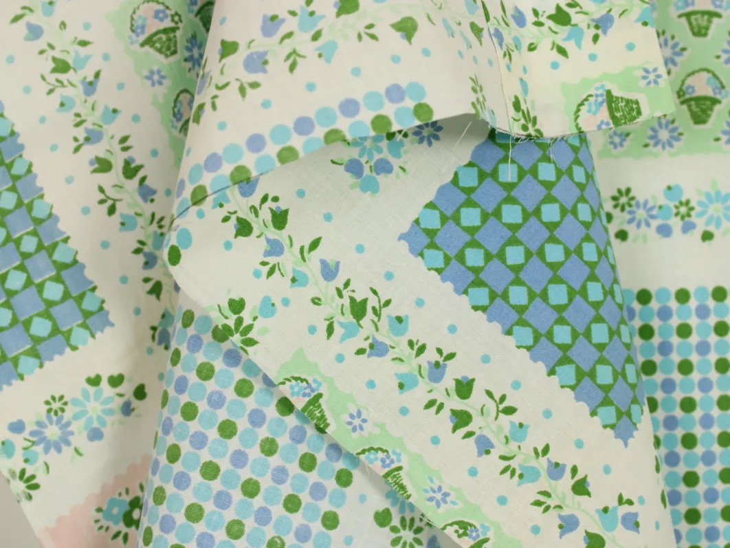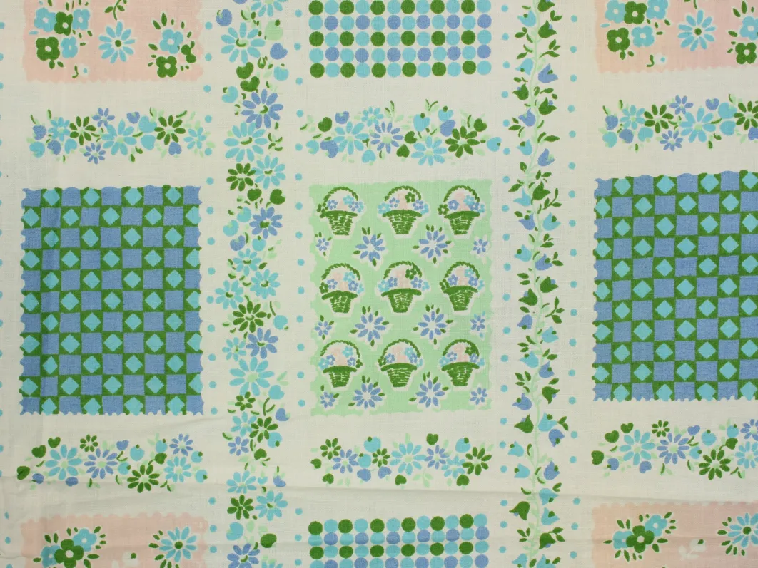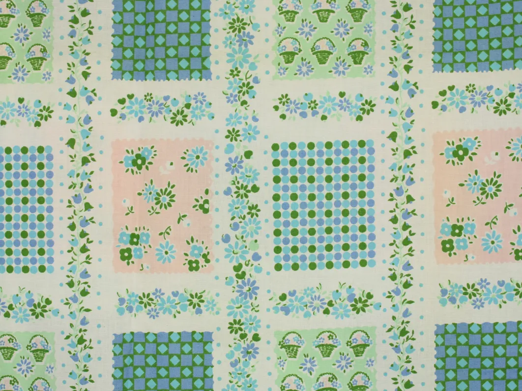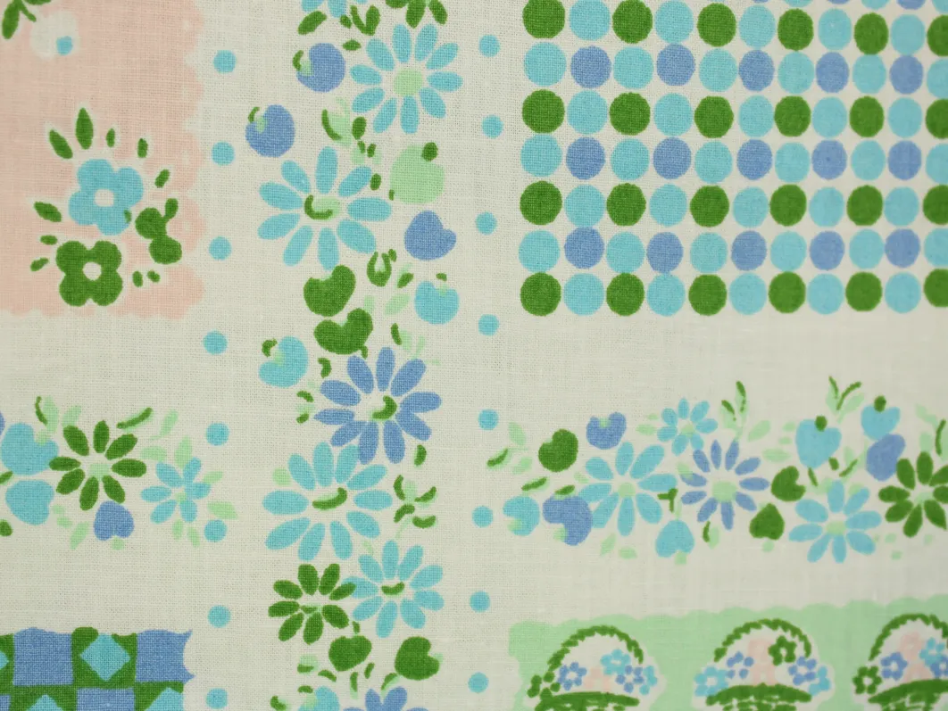 小さな花カゴやドット、小花がパネル状に並んだ、可愛らしいデザイン。