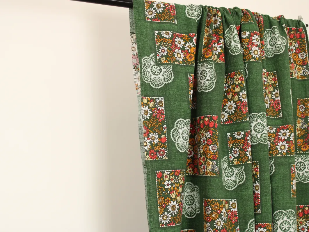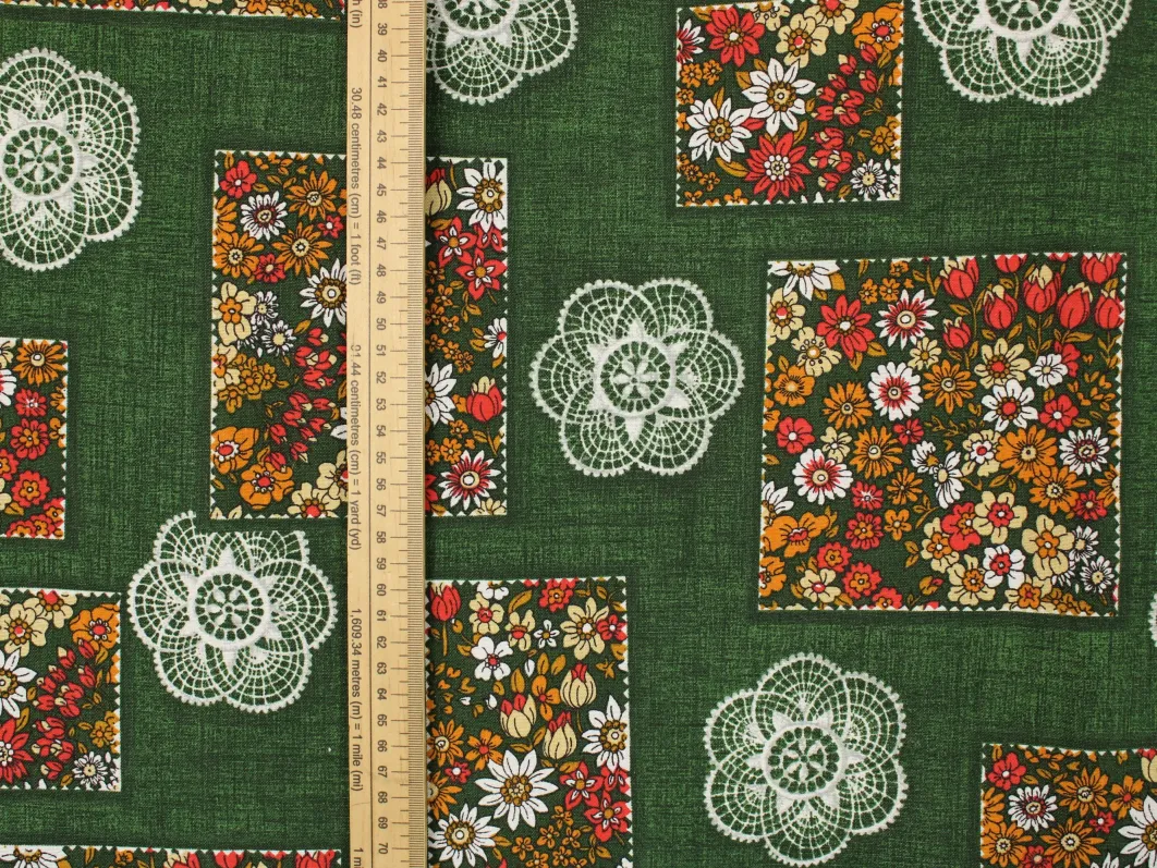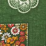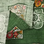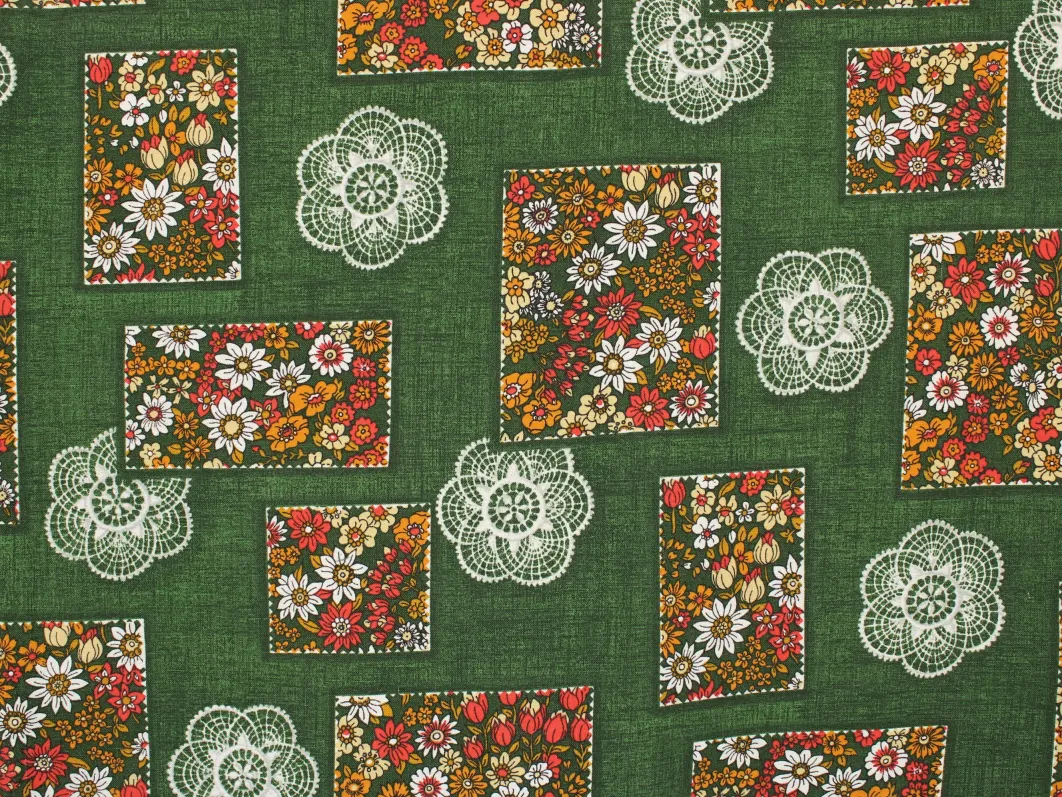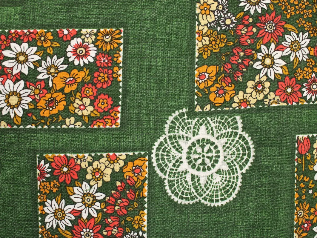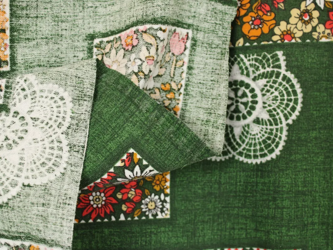 濃緑地に小花柄とレースドイリーがパッチされたようなデザイン。