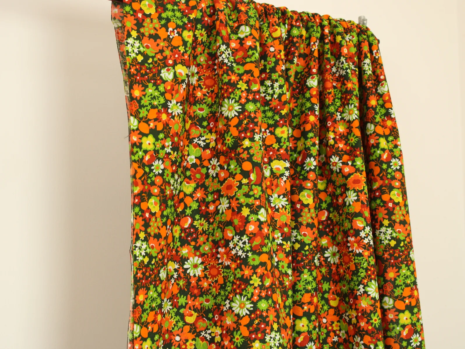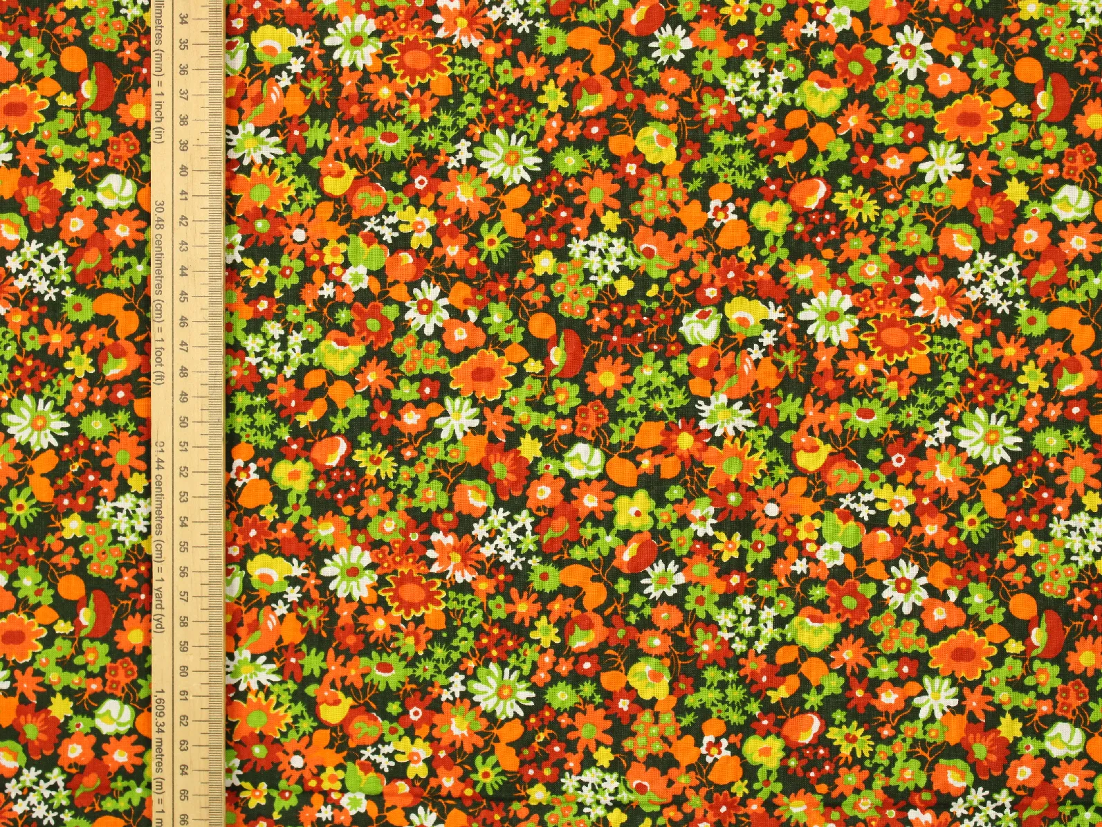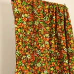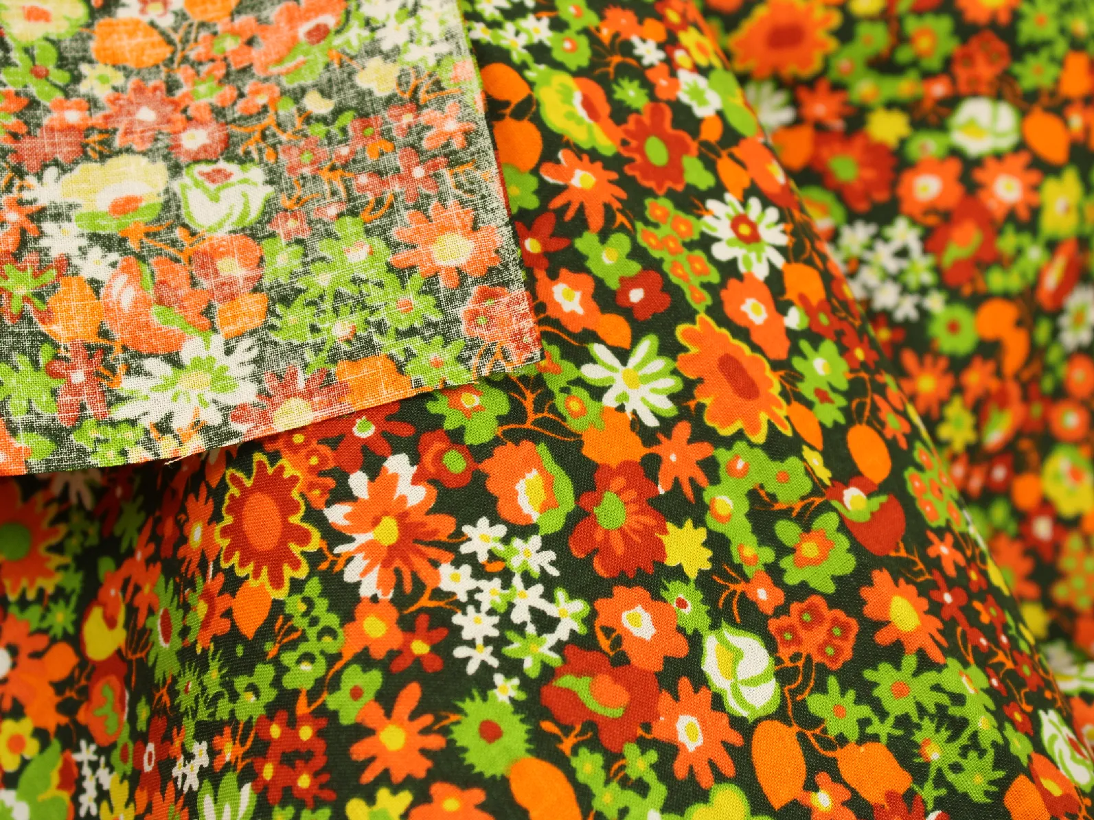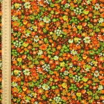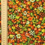 深緑地にオレンジや赤のカラフルな花々。