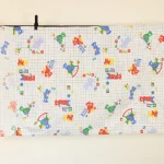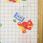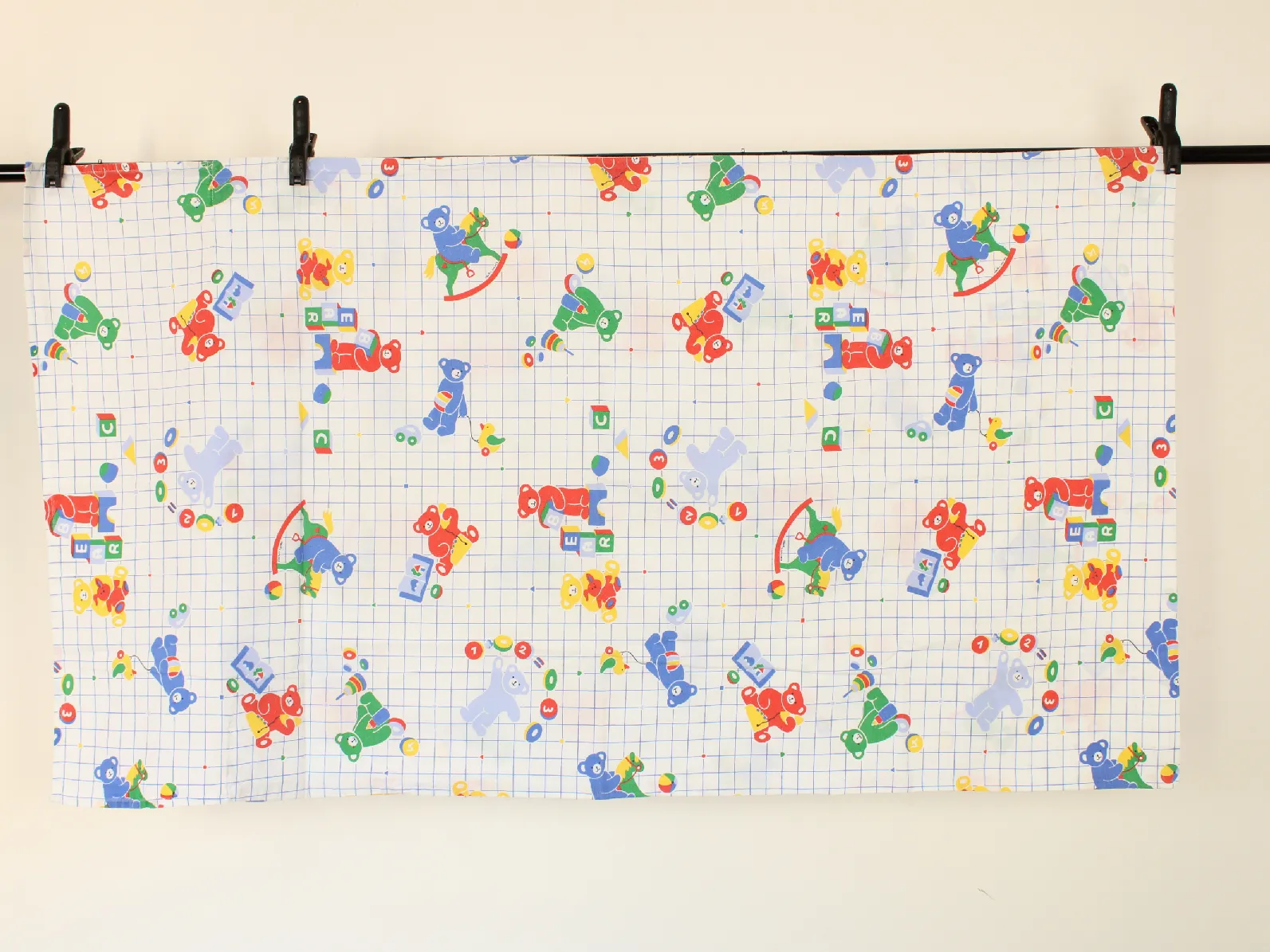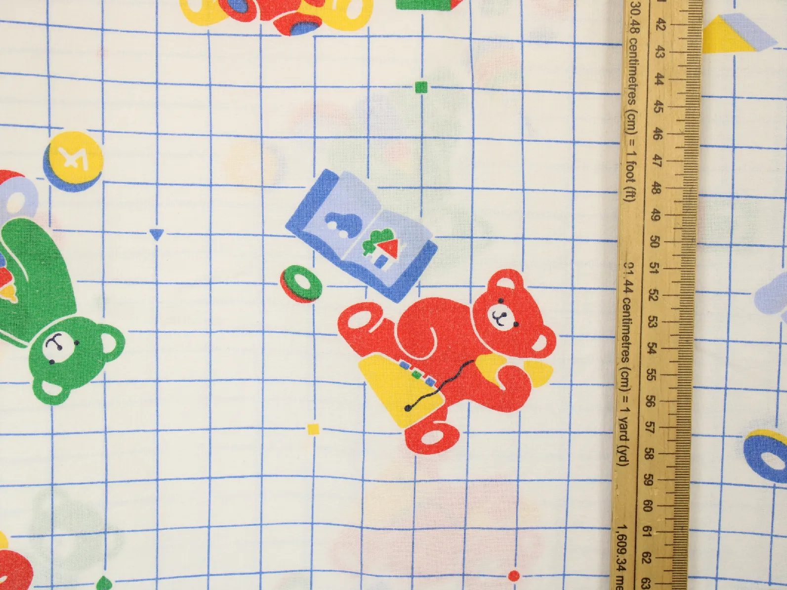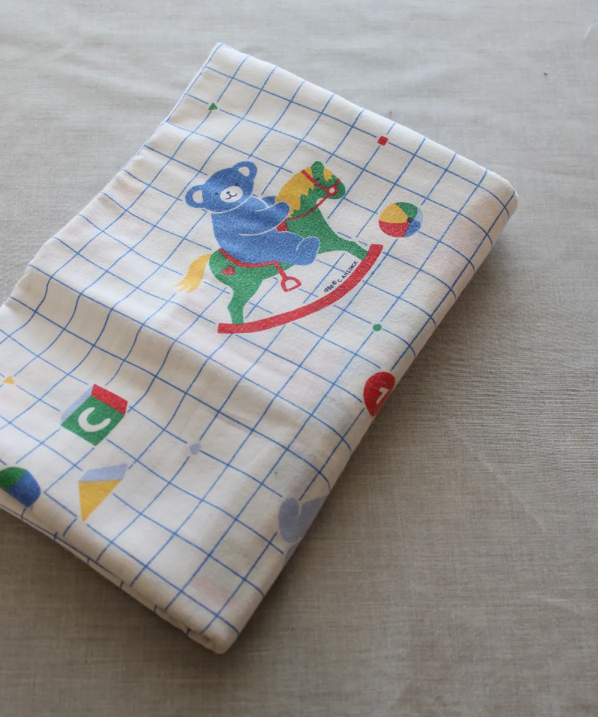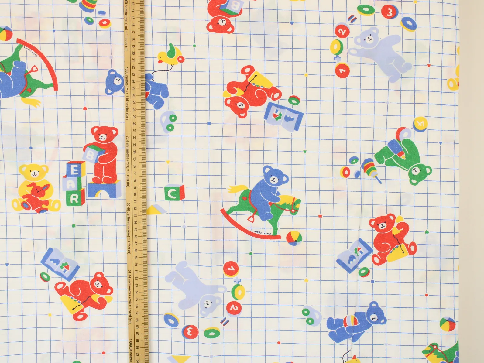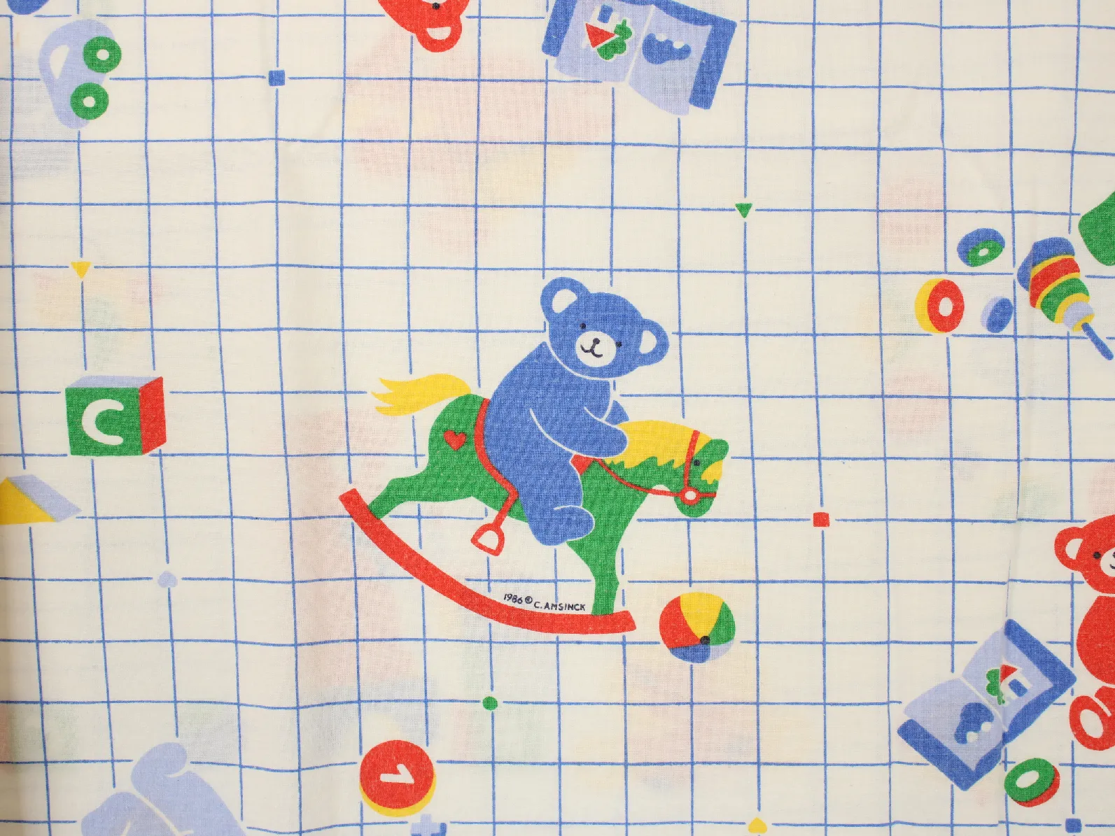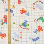 青のグリッド地におもちゃとクマさん。