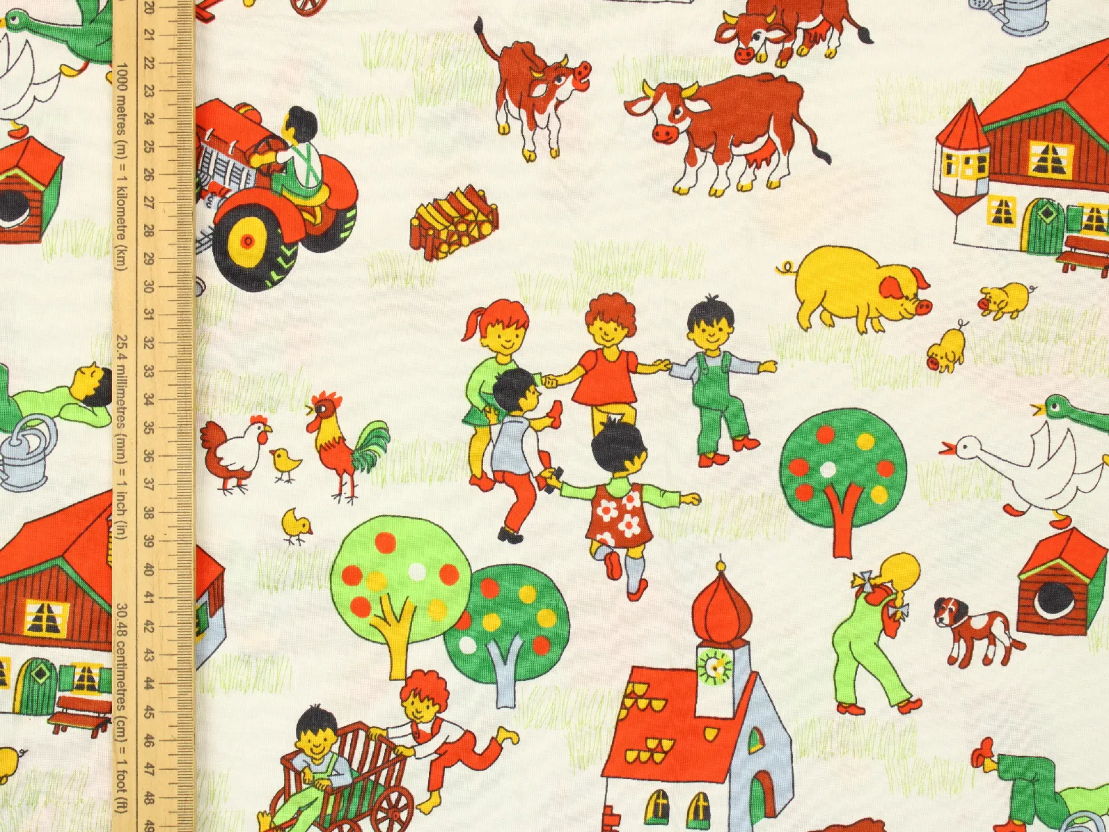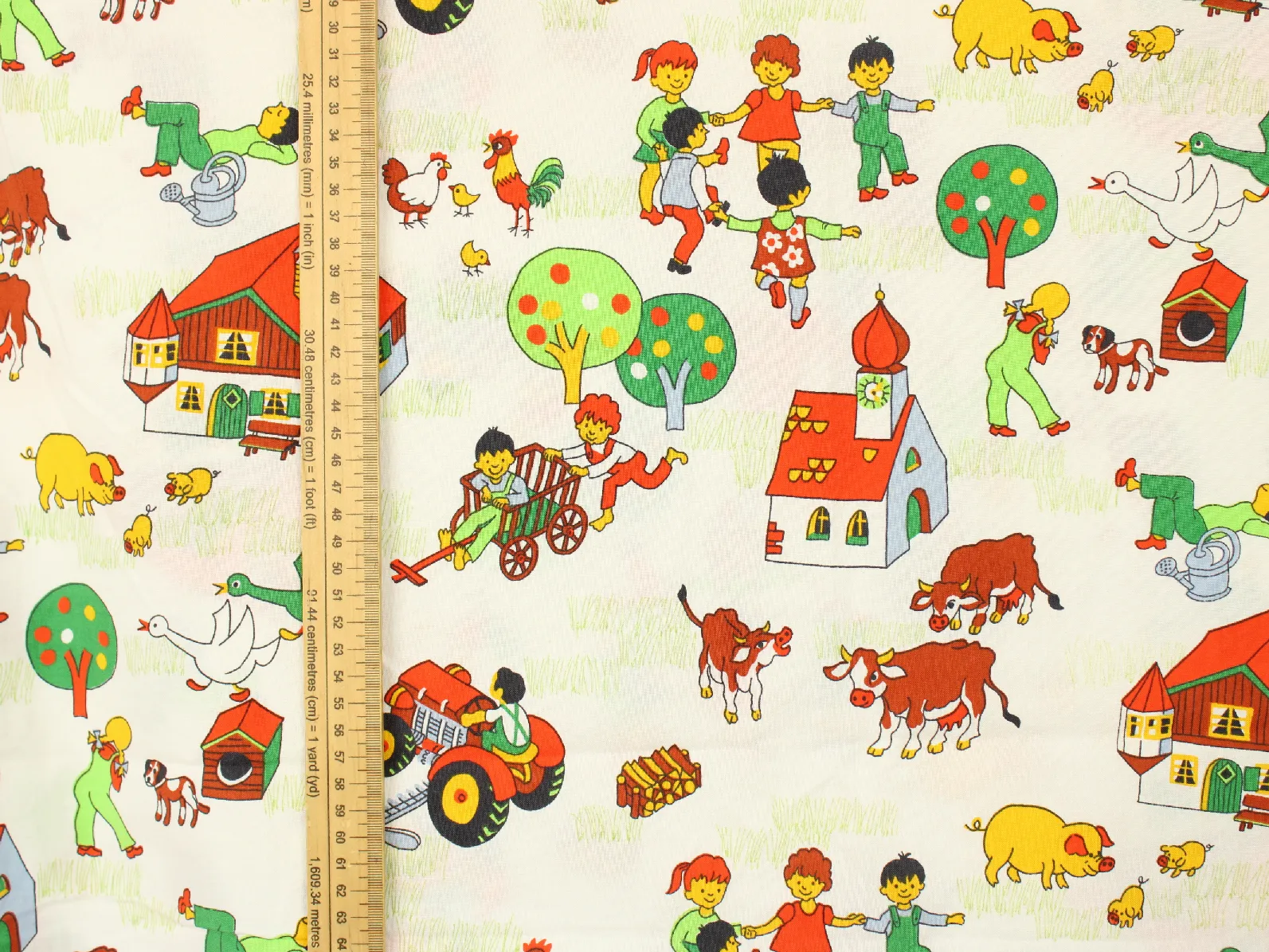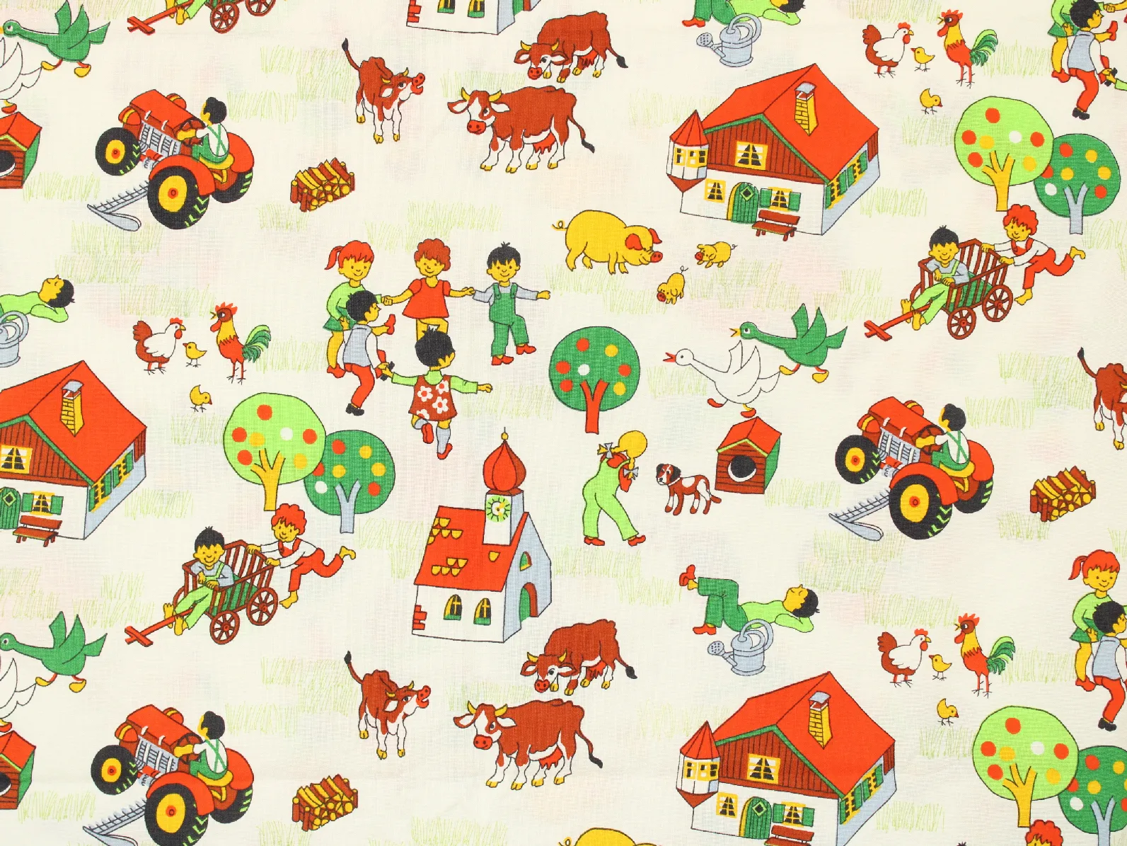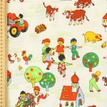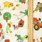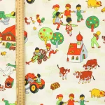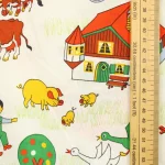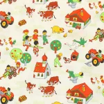 たくさんの動物たちと子供たち、乗り物や建物が描かれた牧場柄。