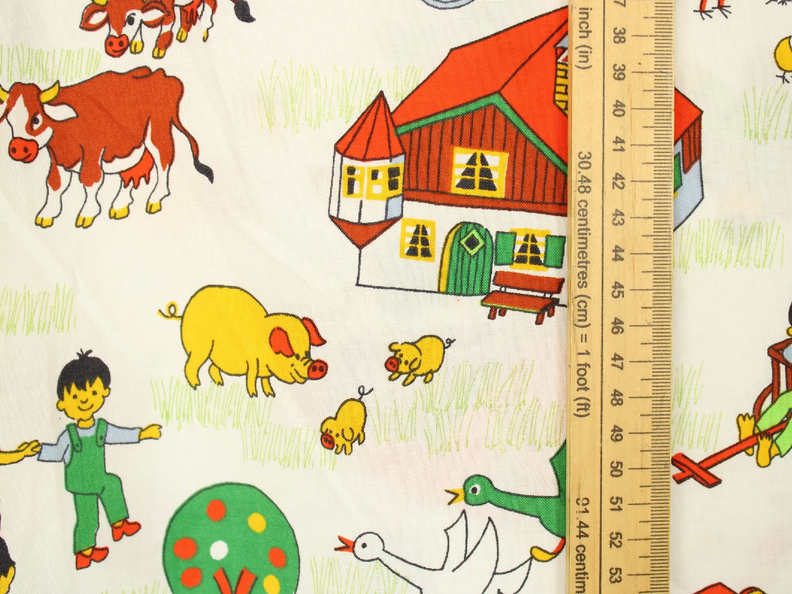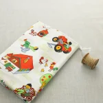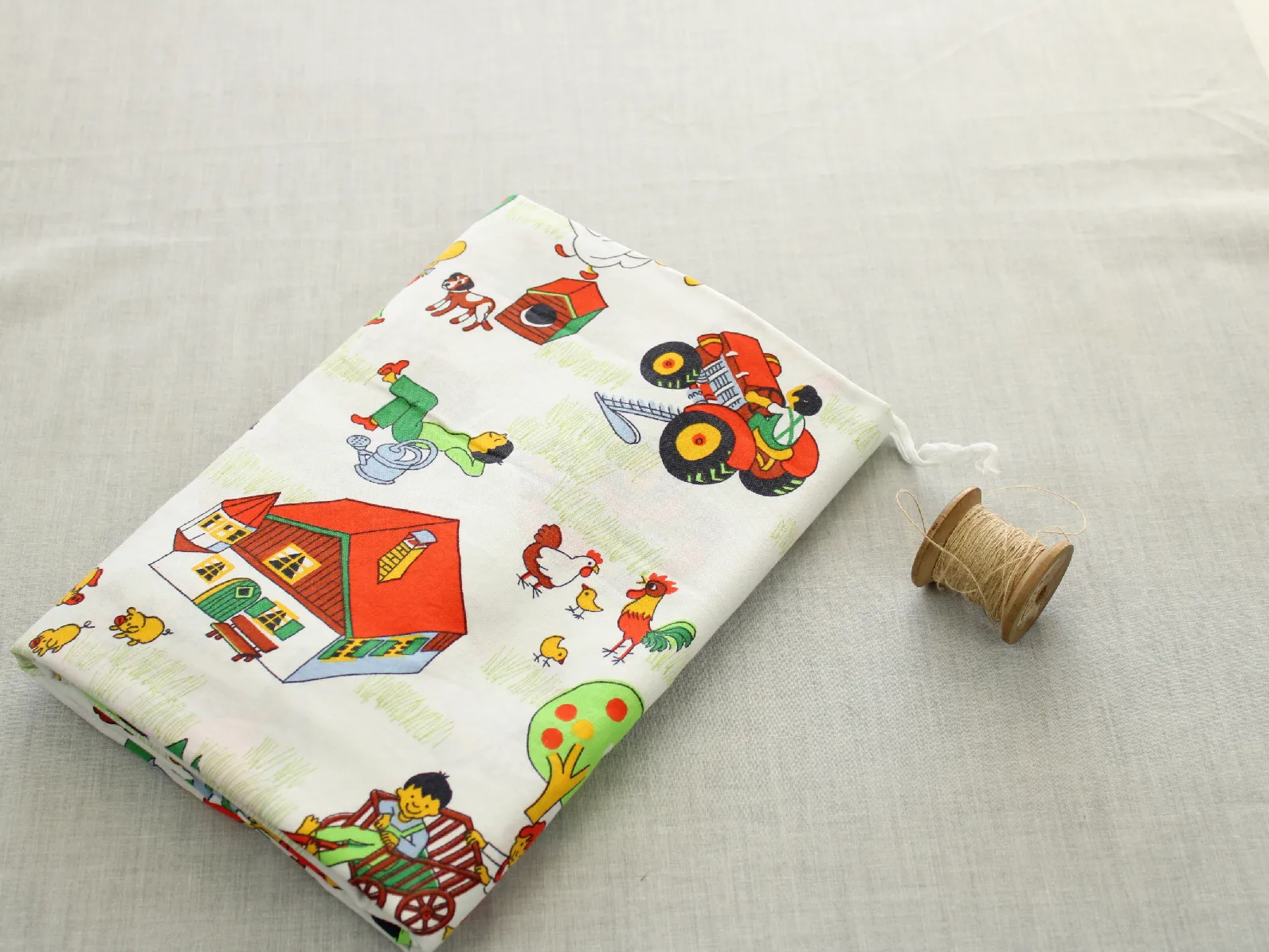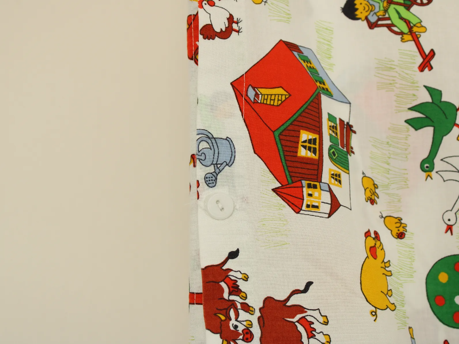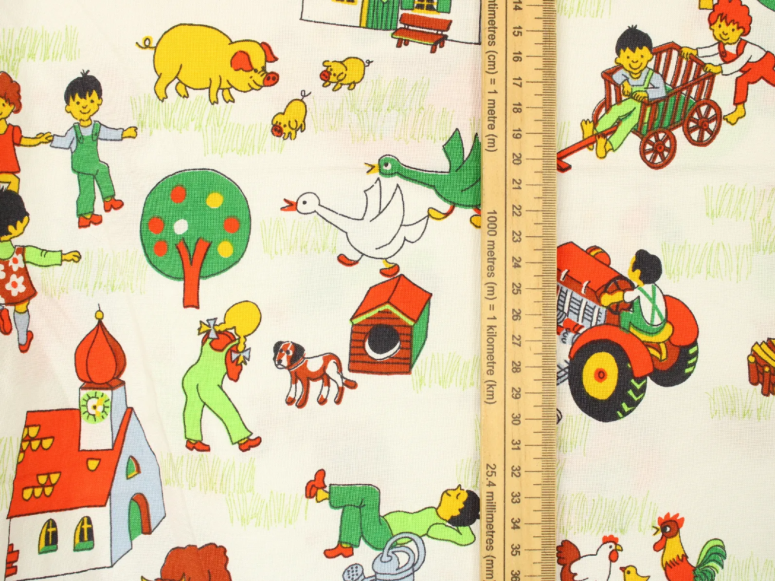 たくさんの動物たちと子供たち、乗り物や建物が描かれた牧場柄。