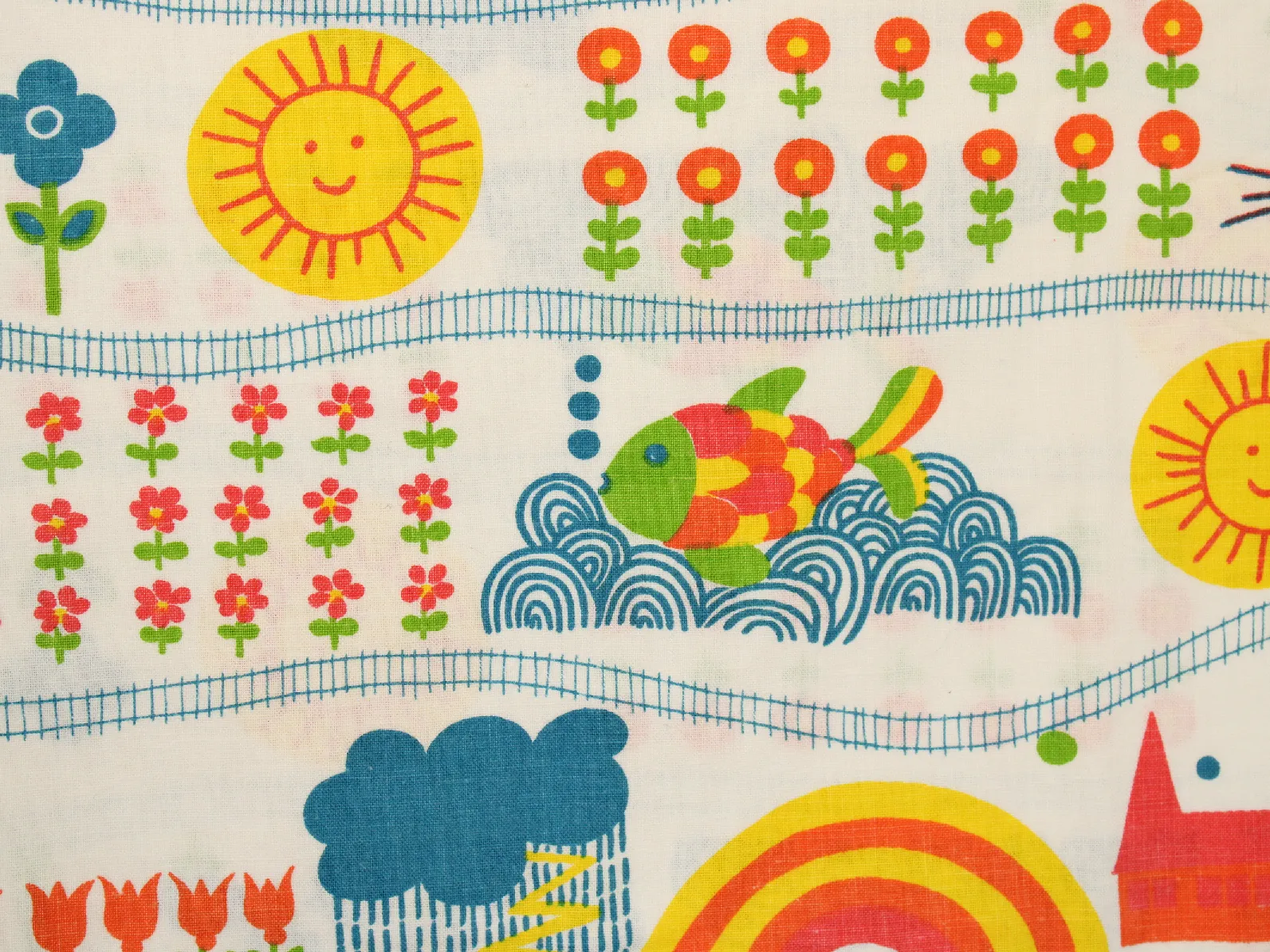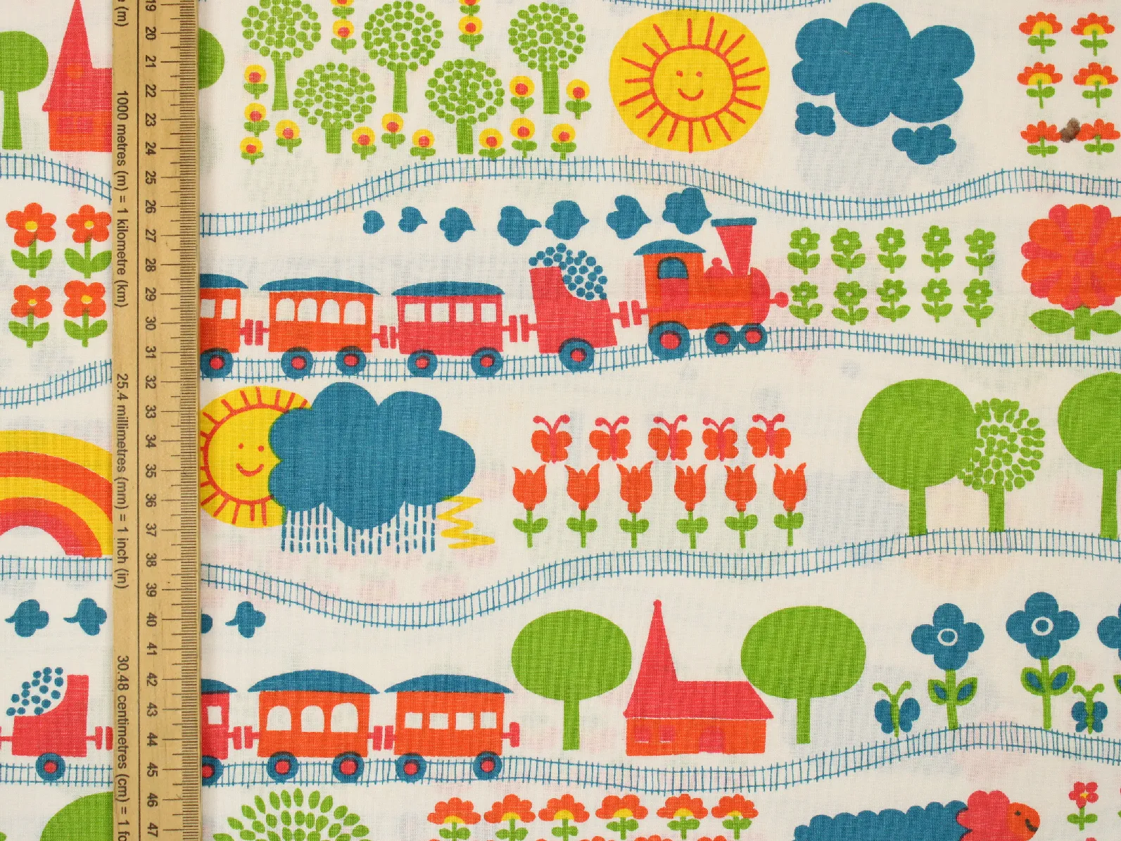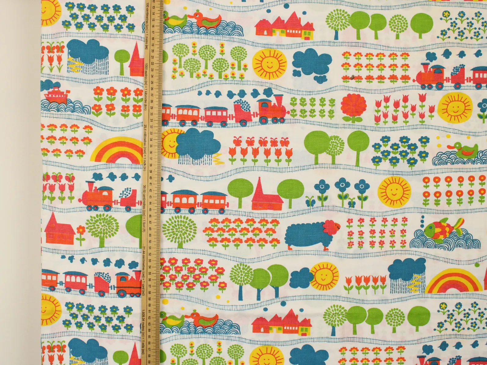 花や動物、野山の風景と機関車の絵柄です。