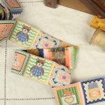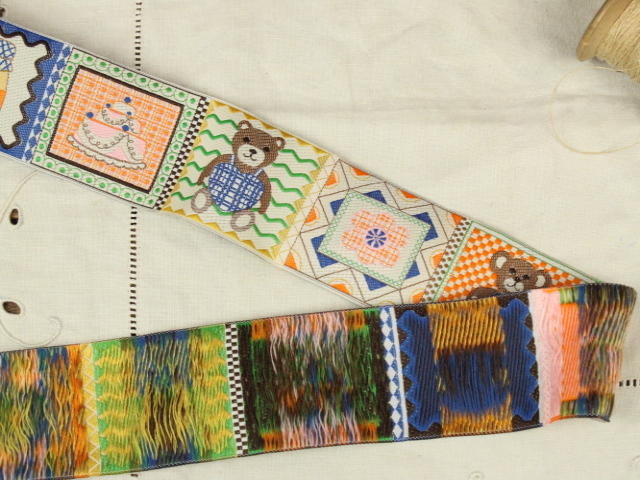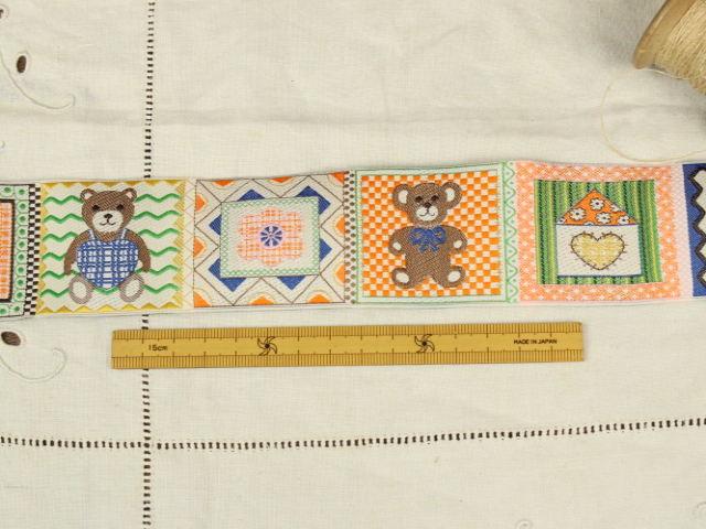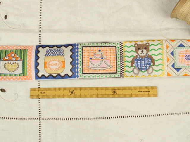 クマやおうち、ケーキなどカラフルで可愛い6種類の絵柄が刺繍された幅の広いリボンです。