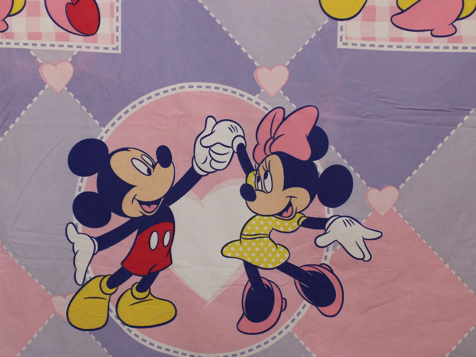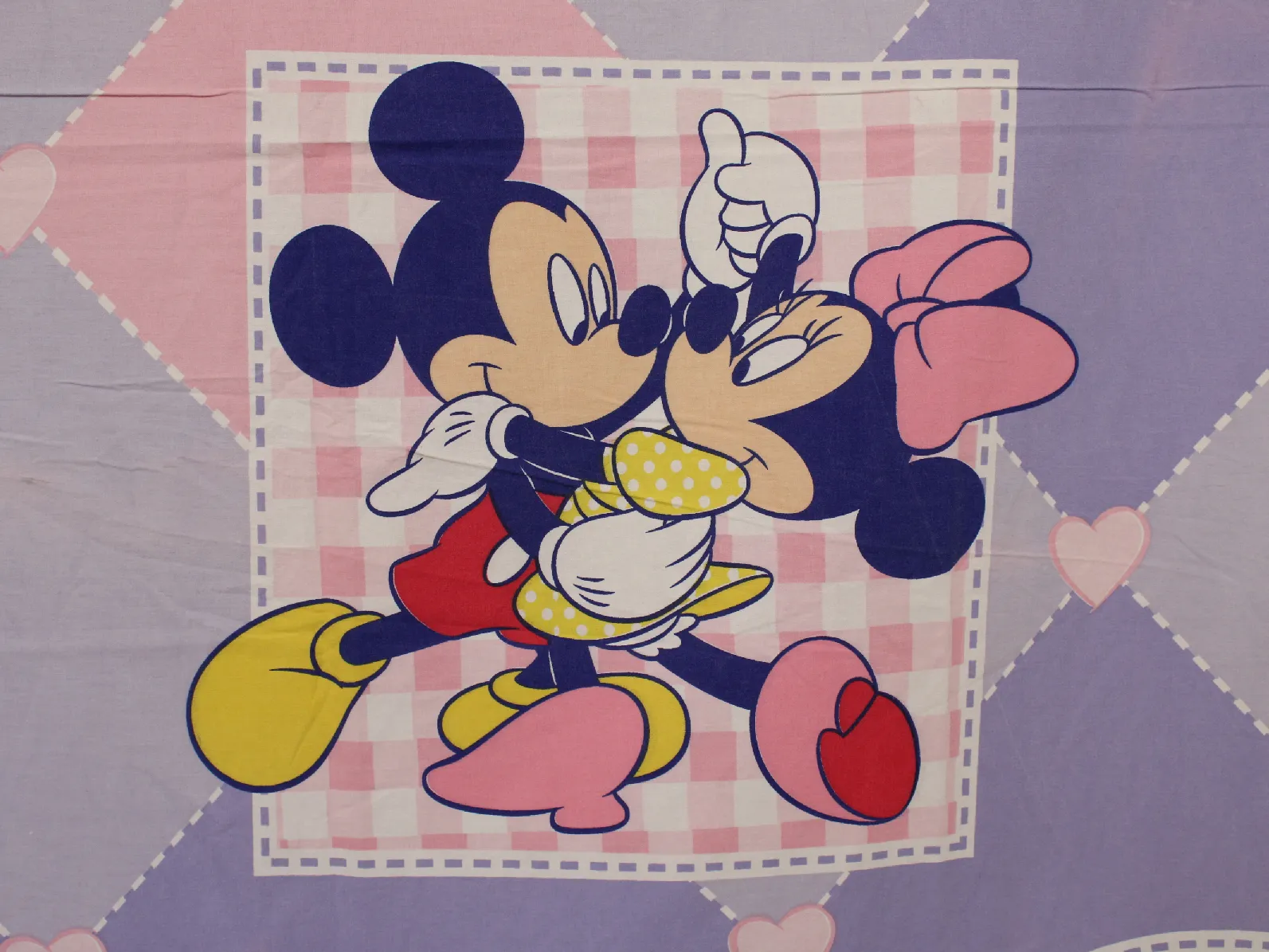 ピンクと紫のチェック模様のミッキー&ミニーのダンス柄。