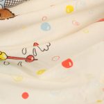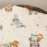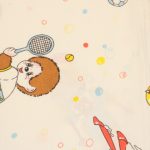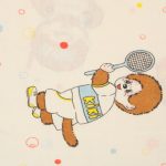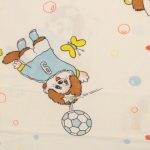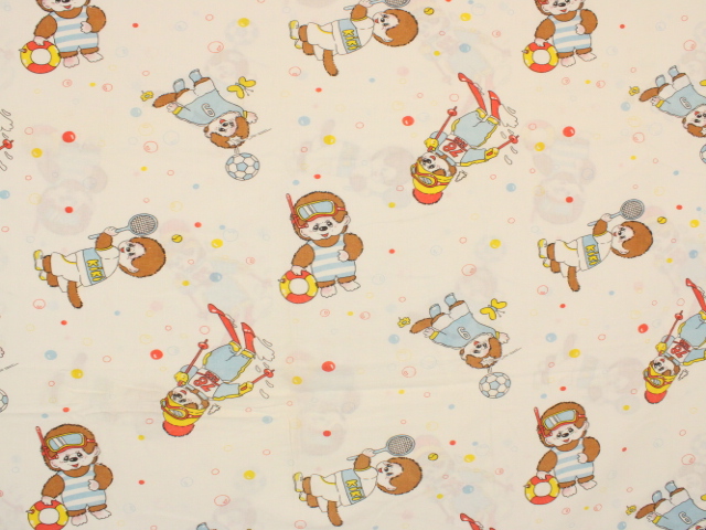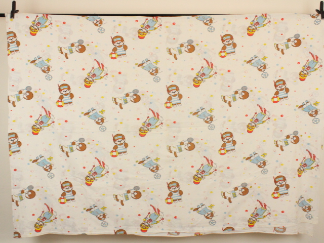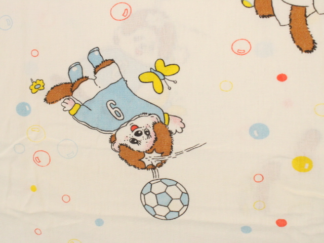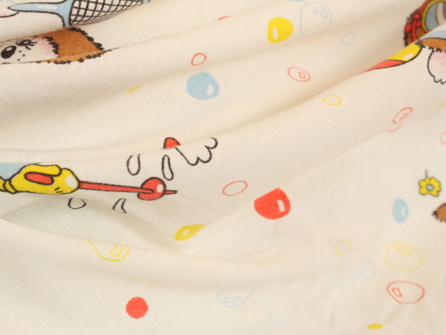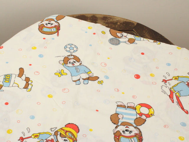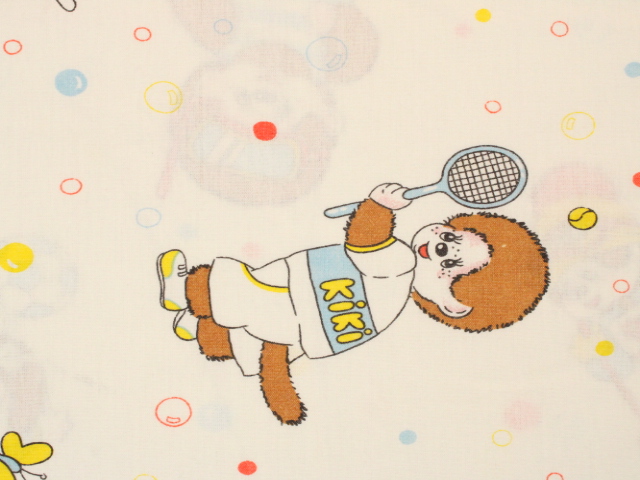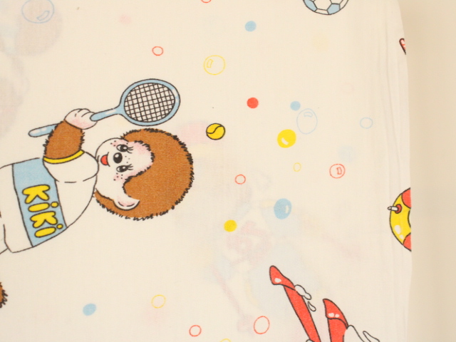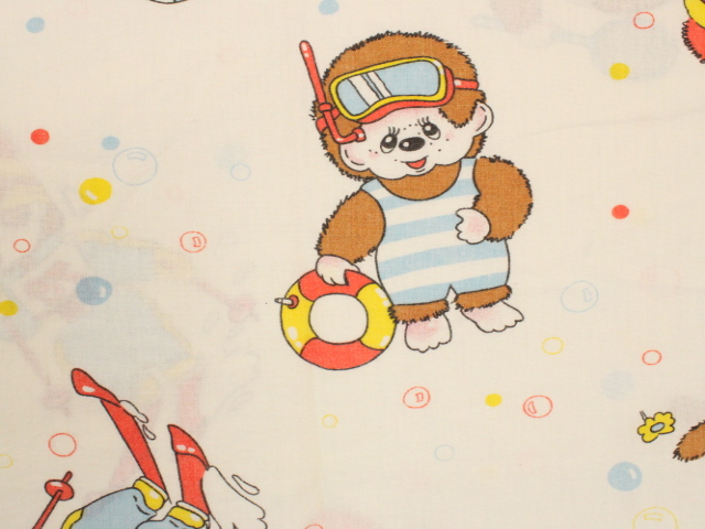カラフルなシャボン玉がレトロ可愛い、モンチッチのフラットシーツです。色々なスポーツをするモンチッチが描かれています。シーツは1枚もの。全体画像(1,2枚め)はそれぞれシーツを2つ折りにして撮影しています。