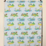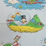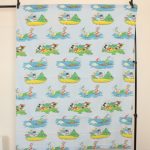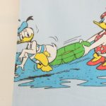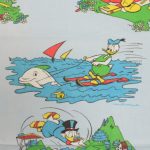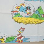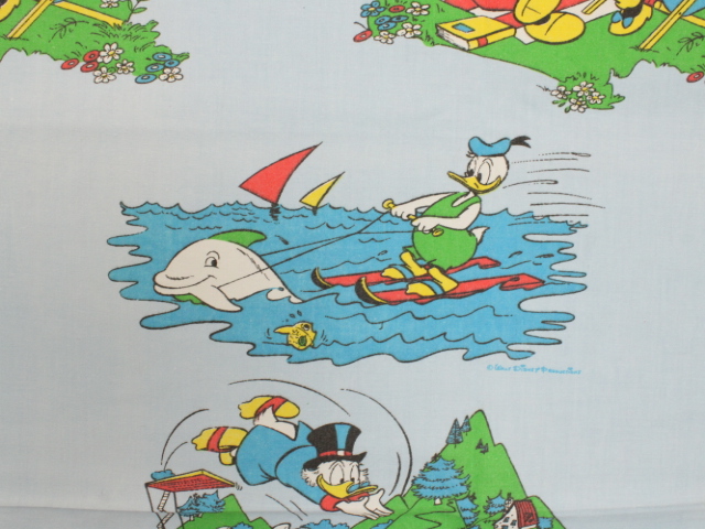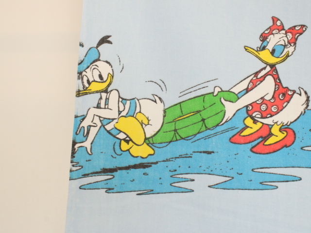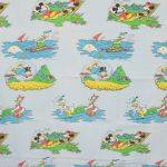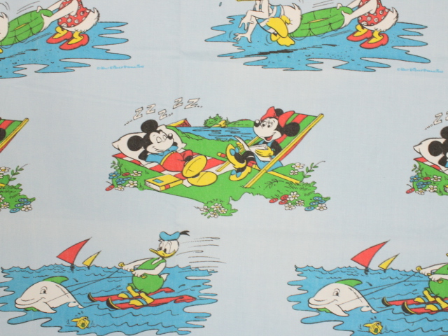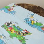 湖畔でバカンスを過ごしているようなミッキー、ミニーとドナルド、デイジー。ベビーサイズのフラットシーツです。画像1枚めが全体です。