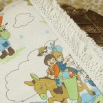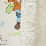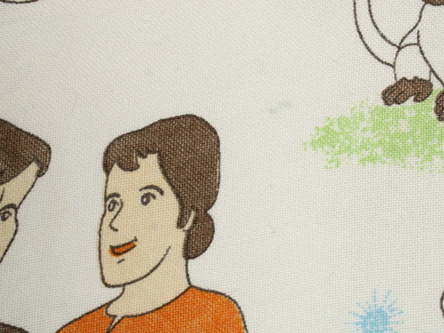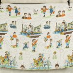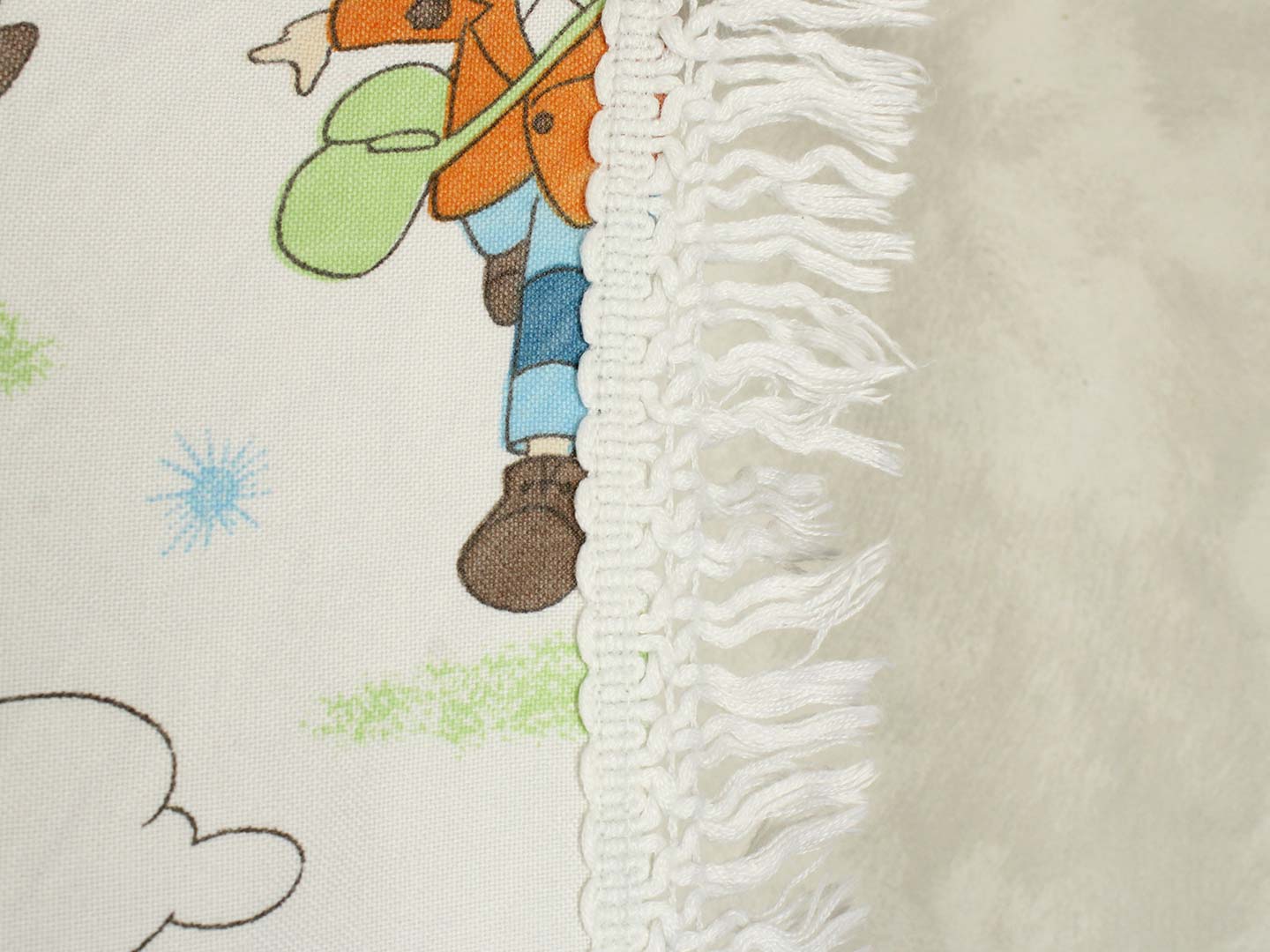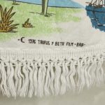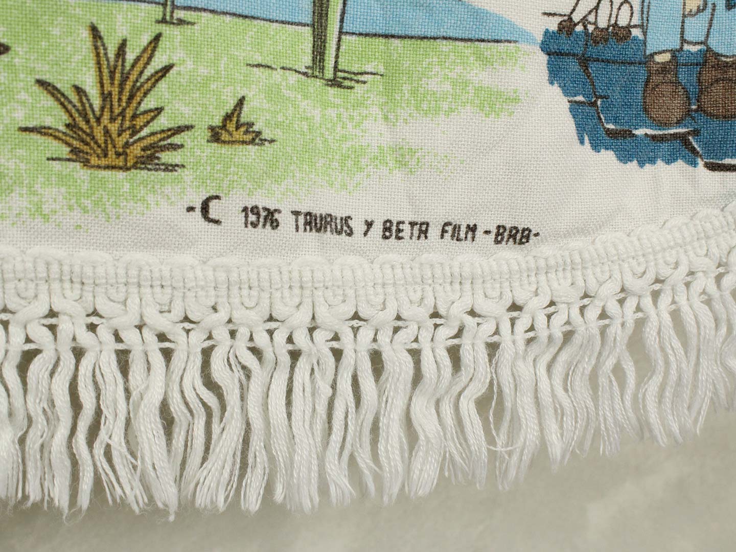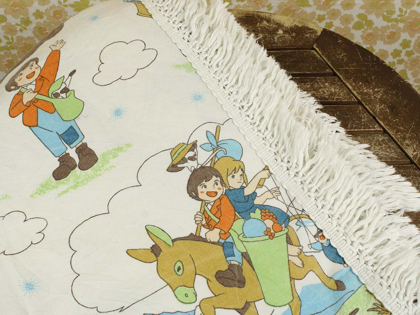 名作アニメ、母をたずねて三千里のキャラクターたちが描かれたベッドカバーです。ベッドの頭側にあたる部分以外にフリンジが付いており、下端の2つの角は丸くなっています。全体画像(画像1,2)はそれぞれカバーを2つに折って撮影しています。厚みがあり柔らかな手触りの素材(おそらく化繊製)です。軽い伸縮性があります。