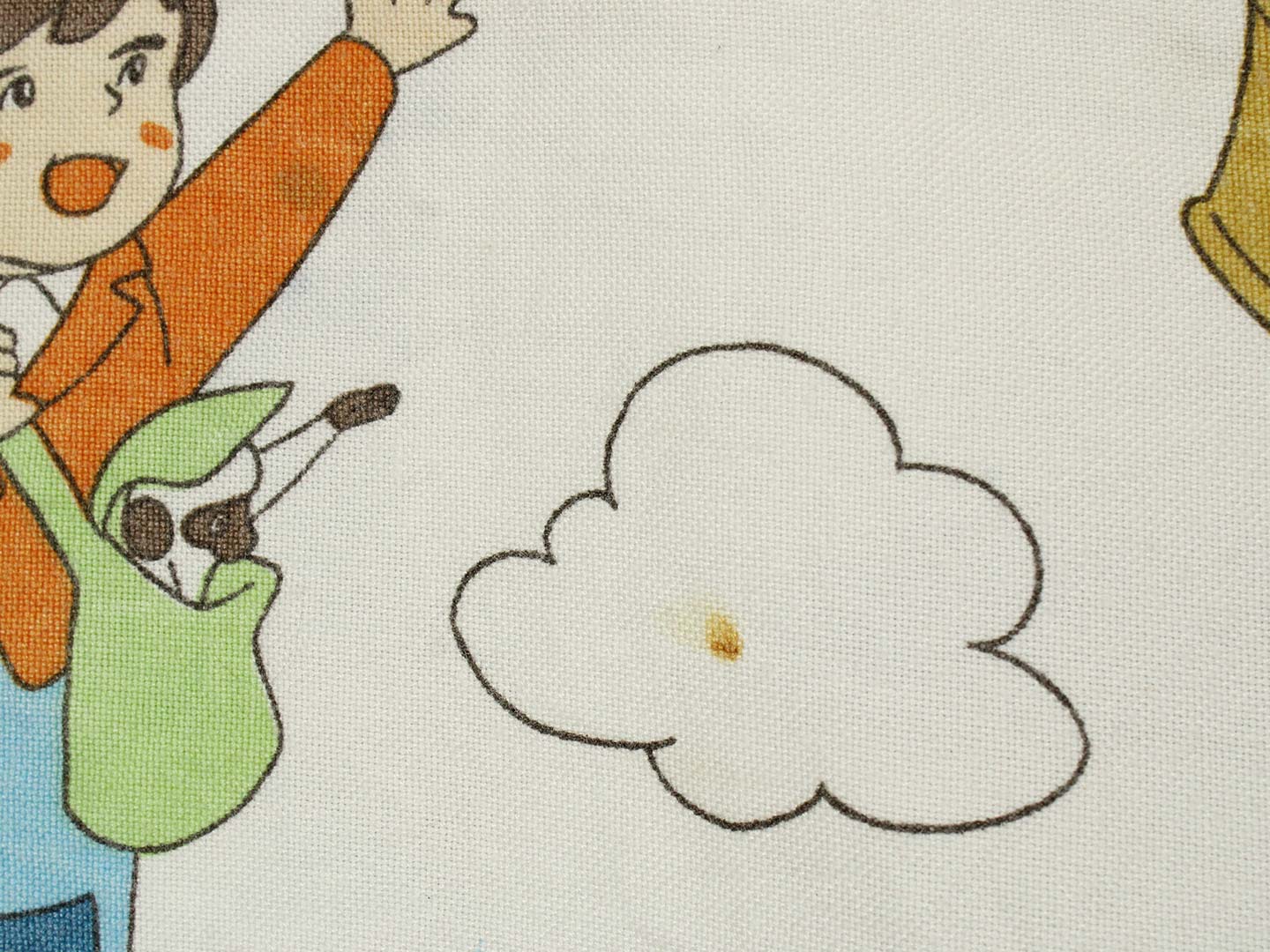 中古品。全体的な色落ち、しわ、生地表面の擦れがあります。複数ヶ所に汚れがあります。