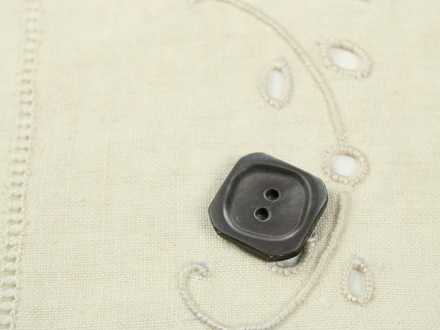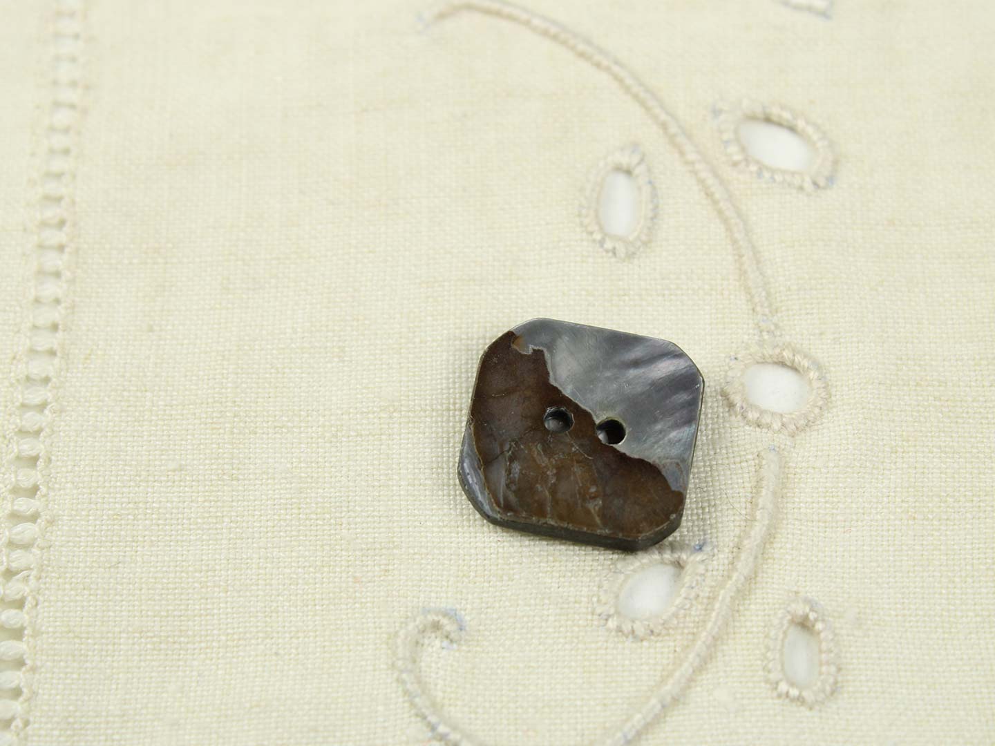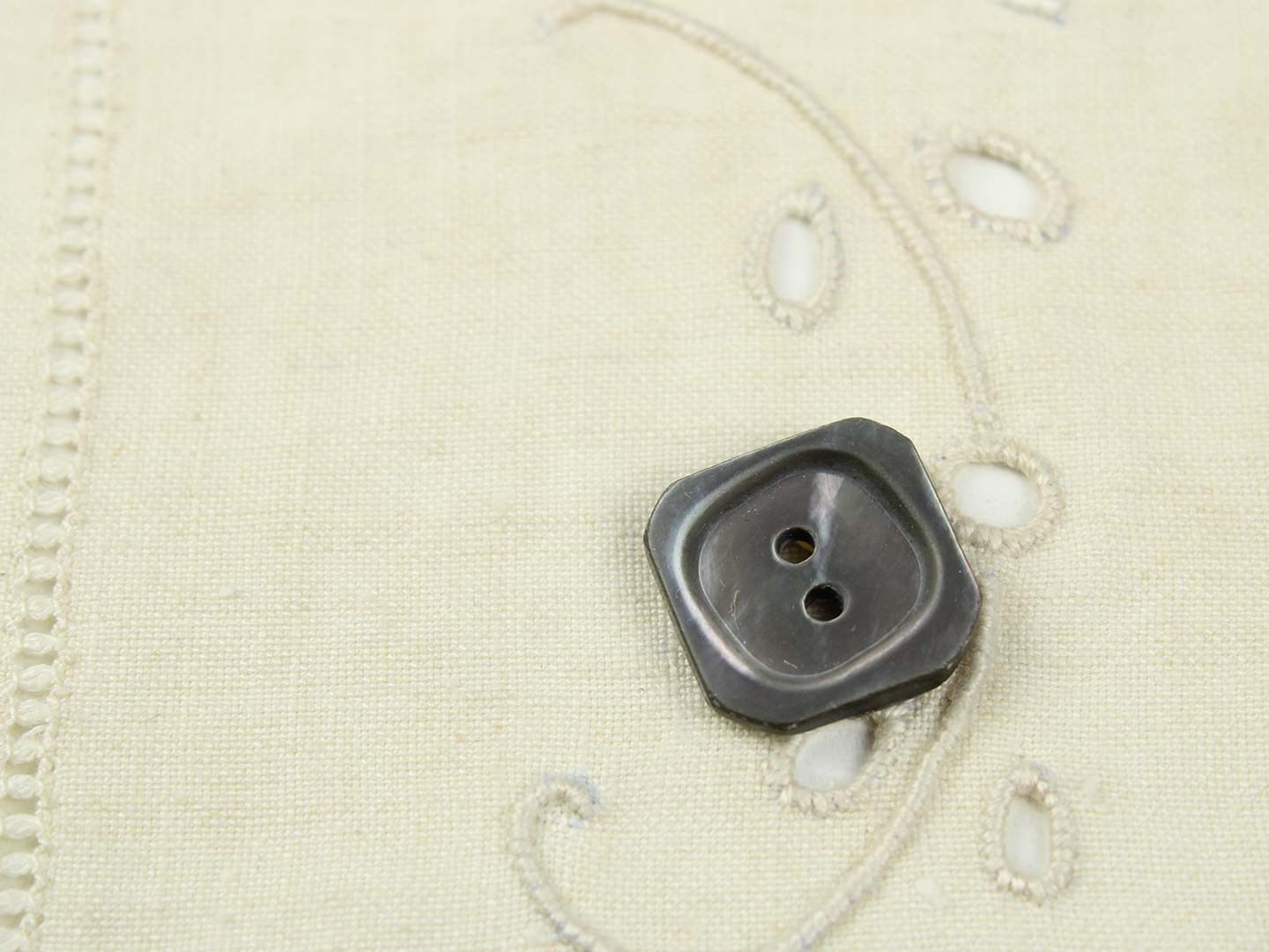 丸みのある四角形の2つ穴シェルボタン。虹色を含む明るい白の光沢。