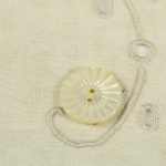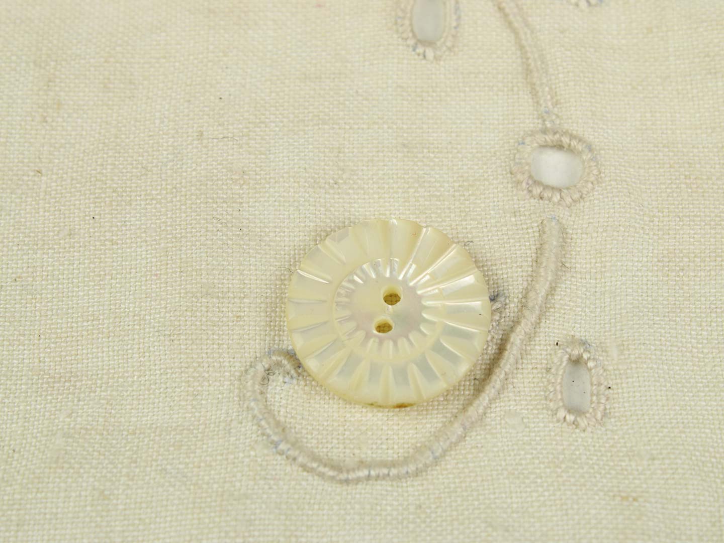 花のような美しい幾何学的な彫り模様の入った、円形の2つ穴シェルボタンです。柔らかな白い光沢。