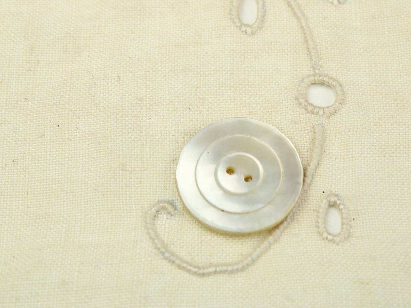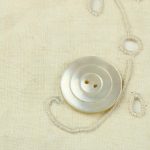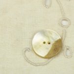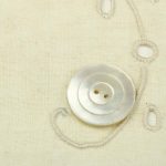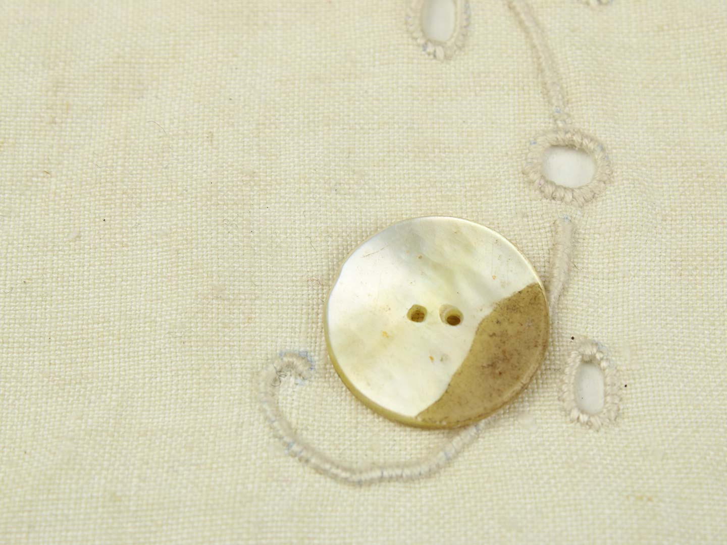 美しい幾何学的な彫り模様の入った、円形の2つ穴シェルボタンです。虹色を含む明るくメタリックな光沢。