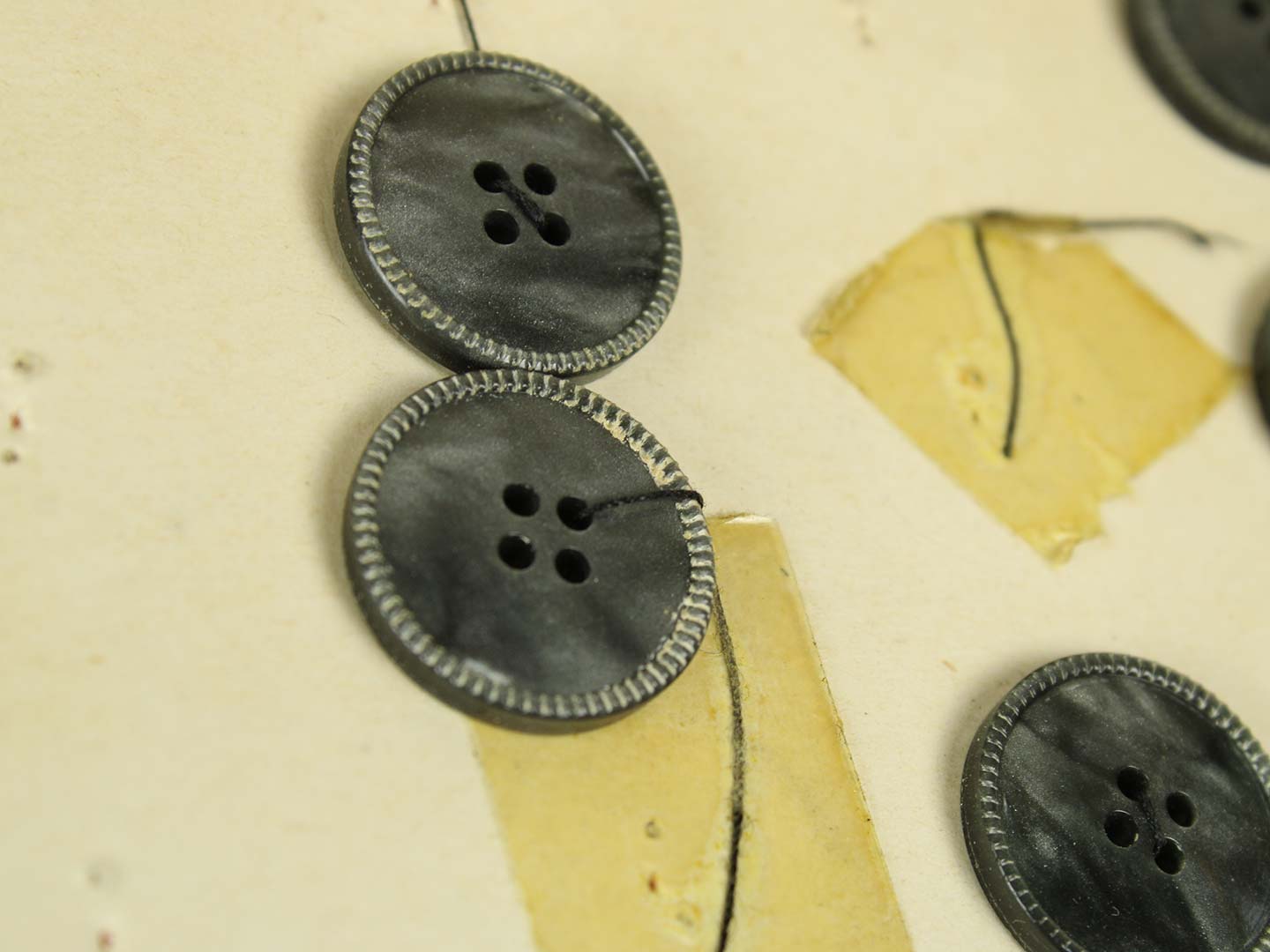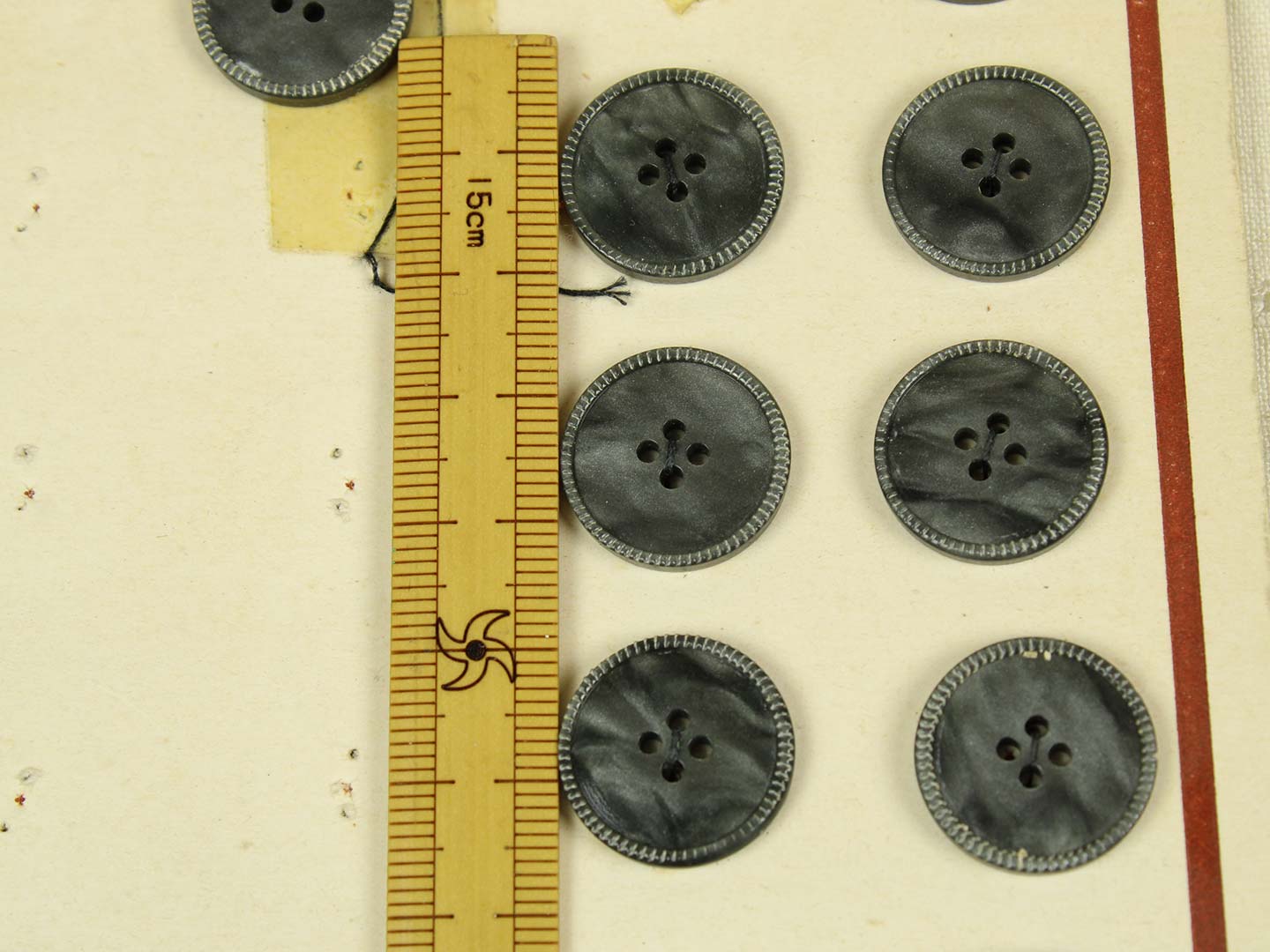 経年による台紙の折れ、変色、ボタンには若干の汚れがあります。