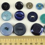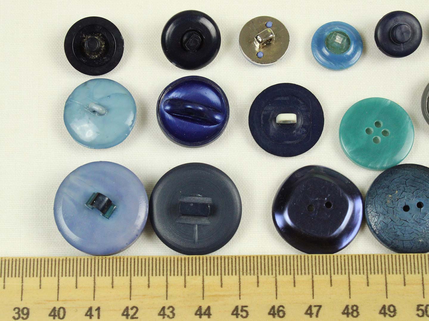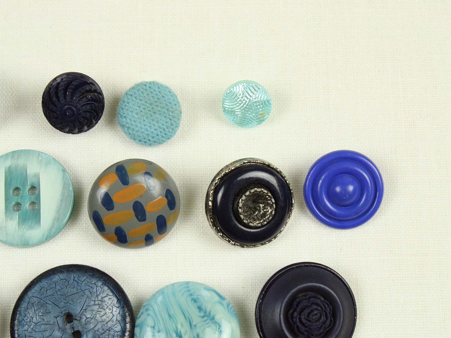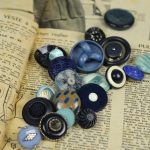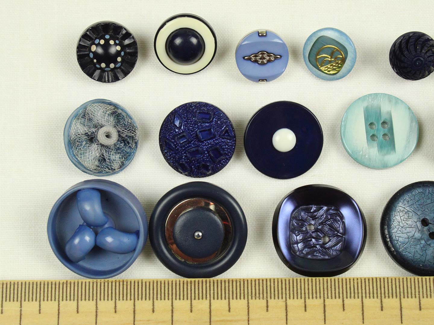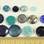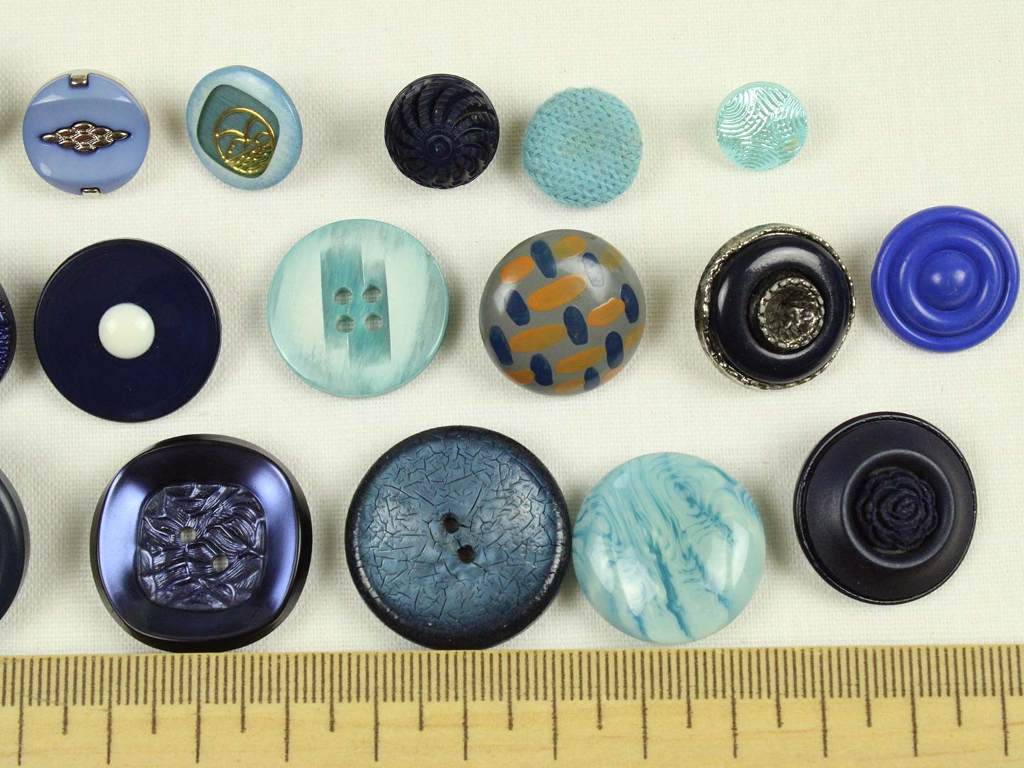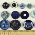 様々な大きさ、形の青い樹脂製ヴィンテージボタン(一部金属メッキ)。全て異なる20個セットです。