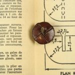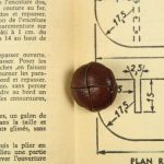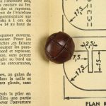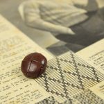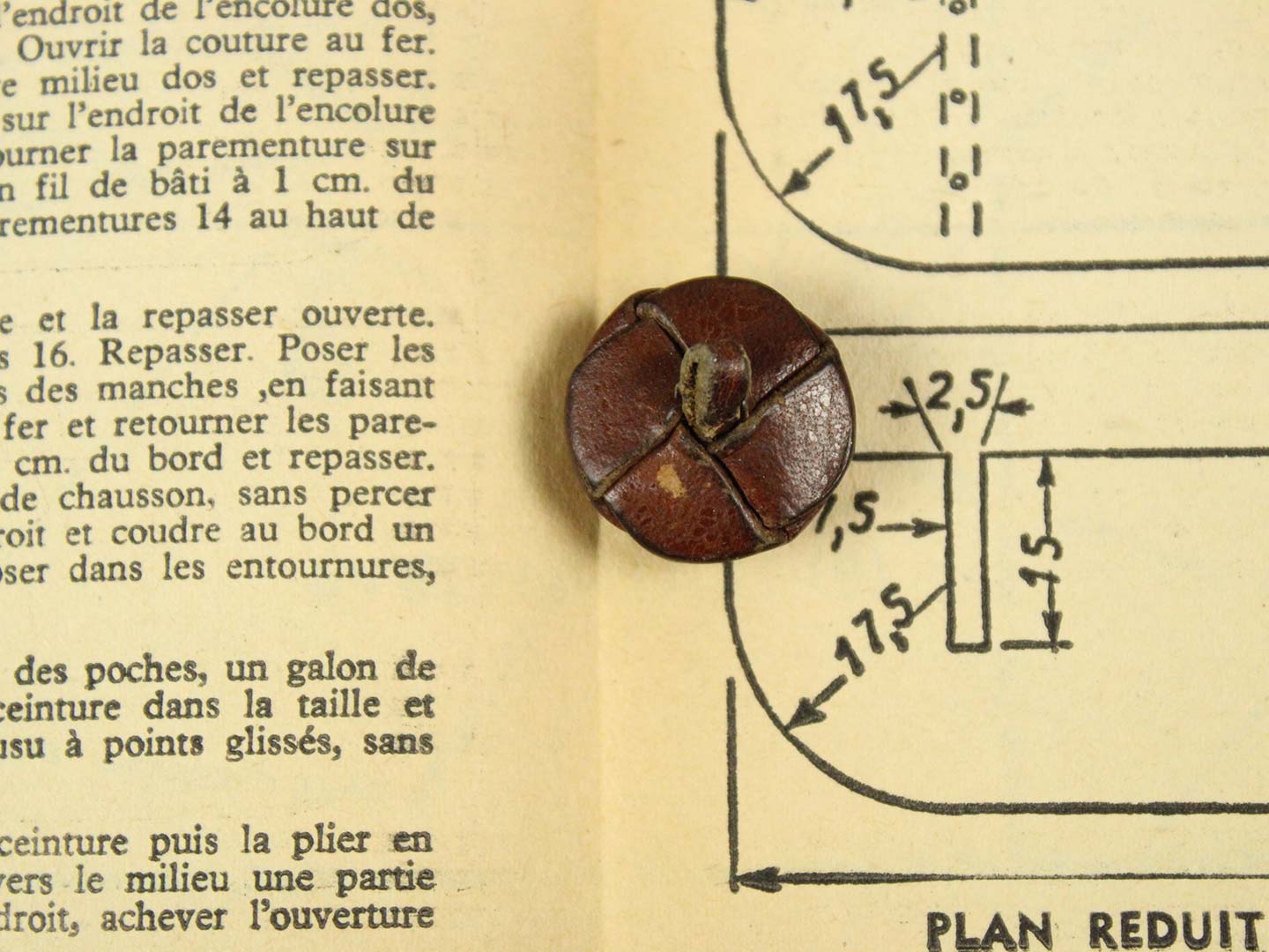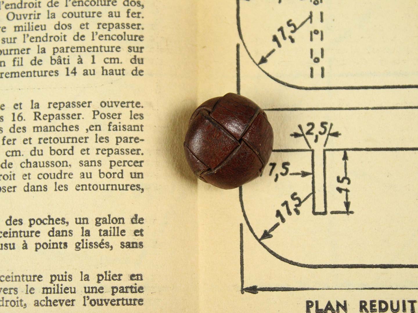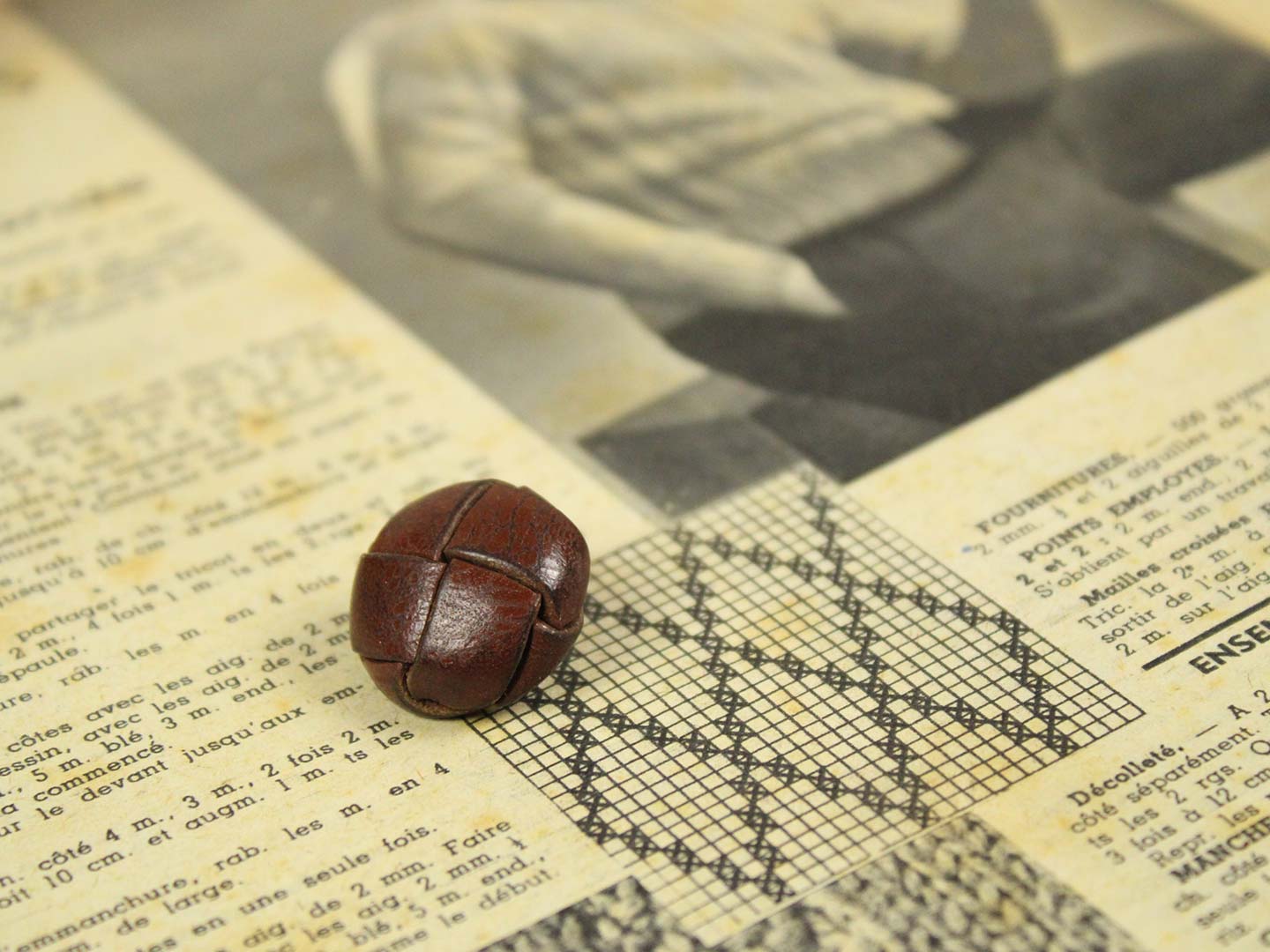 革を編んで形づくられた丸いボタンです。表面を濃茶でペイントされています。足も革製です。