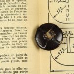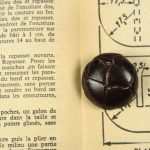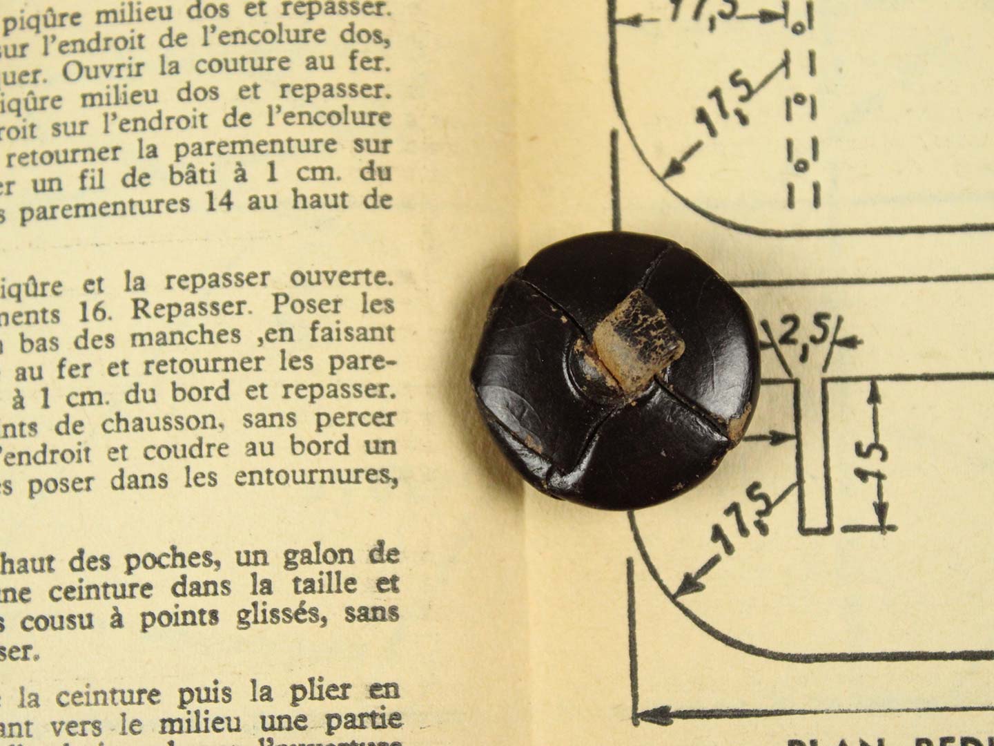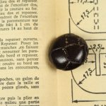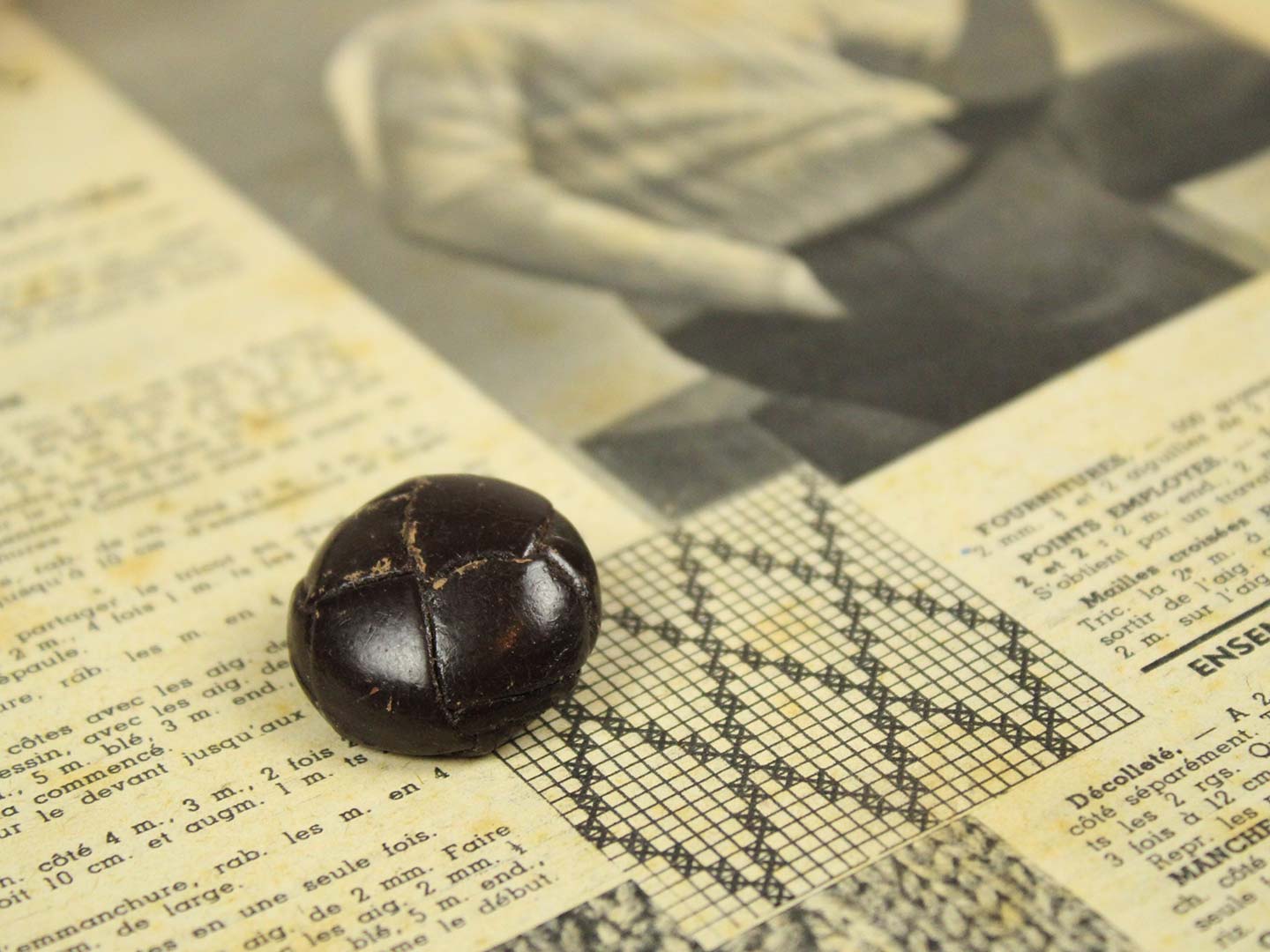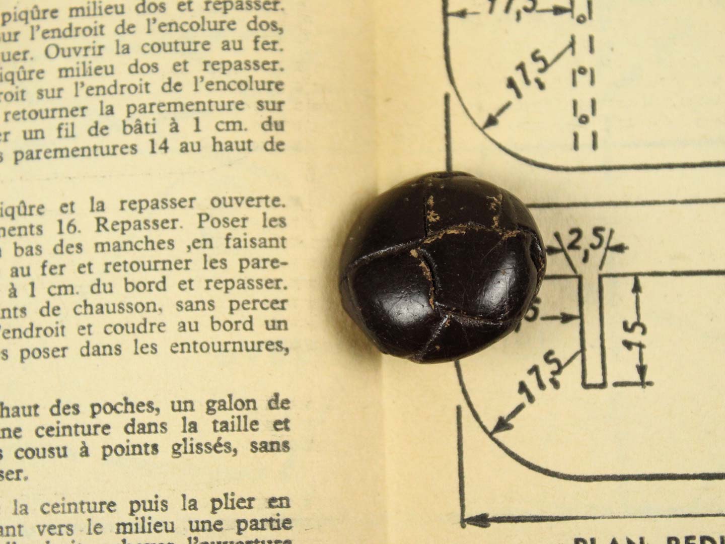 革を編んで形づくられた丸いボタンです。表面を濃茶でペイントされています。足も革製です。