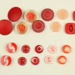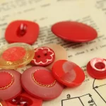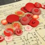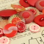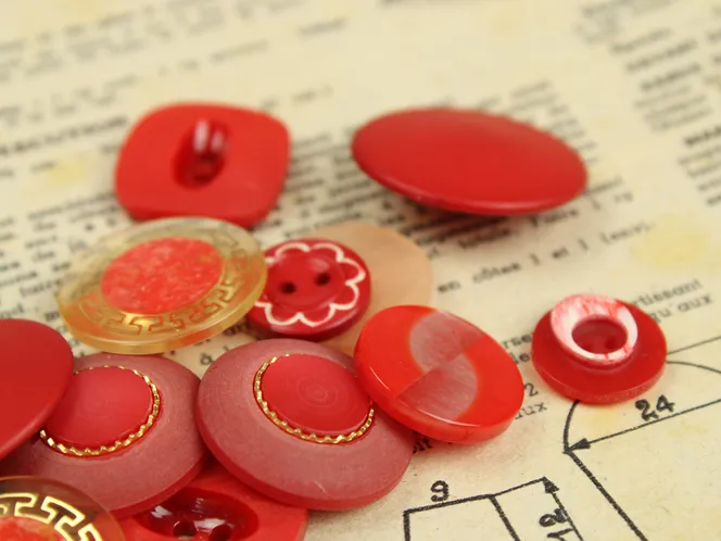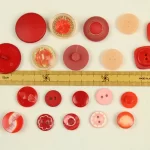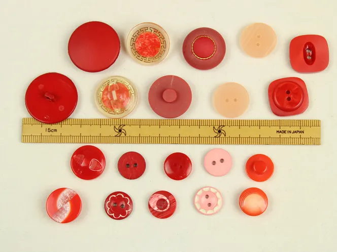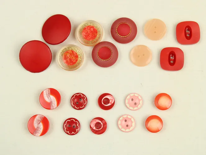 様々な形の赤い樹脂製ヴィンテージボタン。10種類、各2つずつの20個セットです。