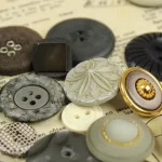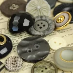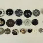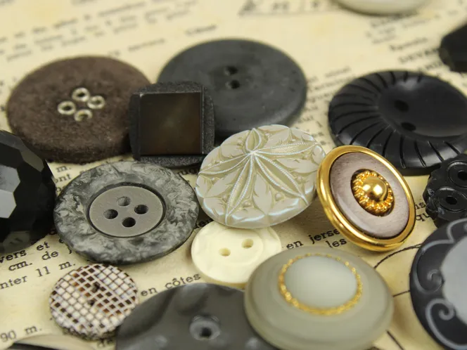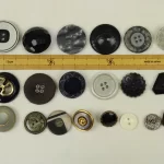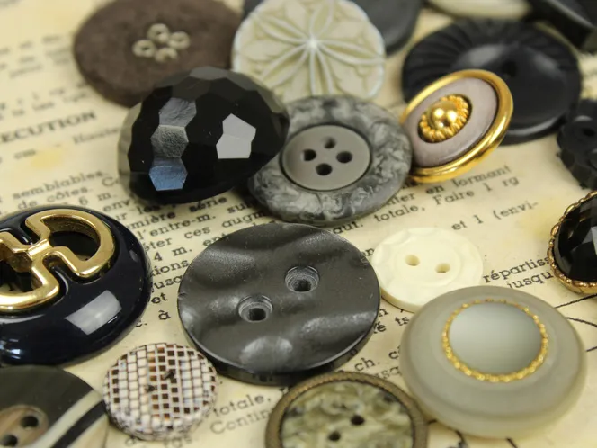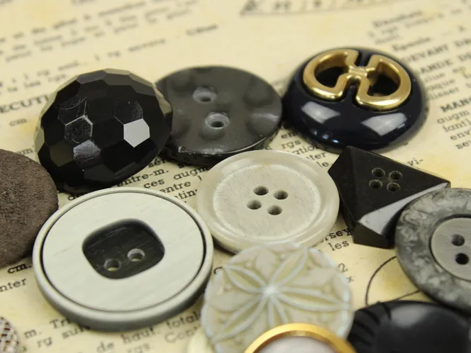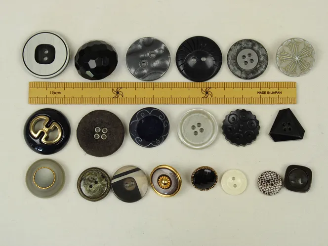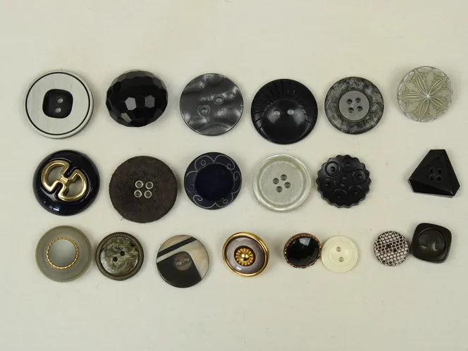 様々な大きさ、形の白、灰色、黒の樹脂製ヴィンテージボタン。全て異なる20個セットです。