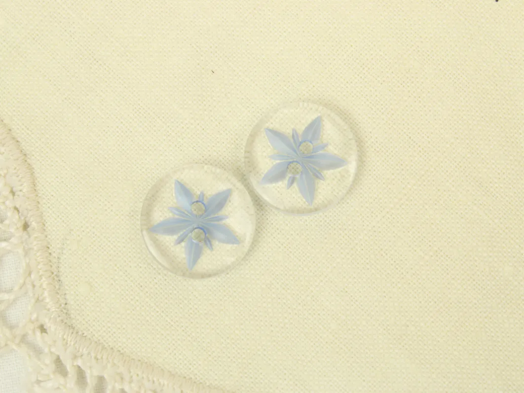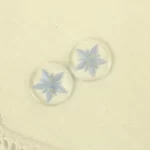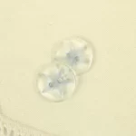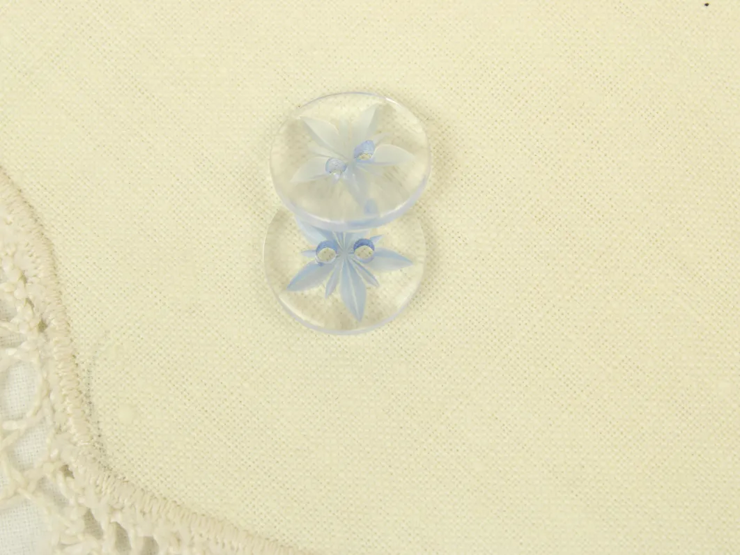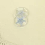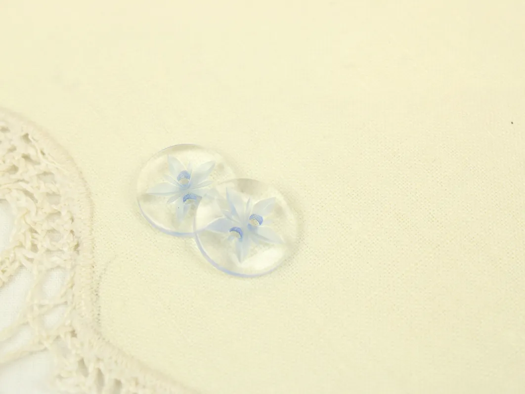 水色の花のような彫り模様の入った、透明な2つ穴ボタンです。