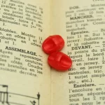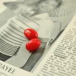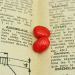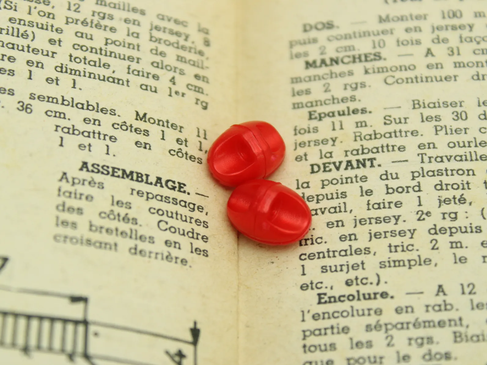 光沢のある赤色の楕円形ボタン。表面には波模様が刻まれています。
