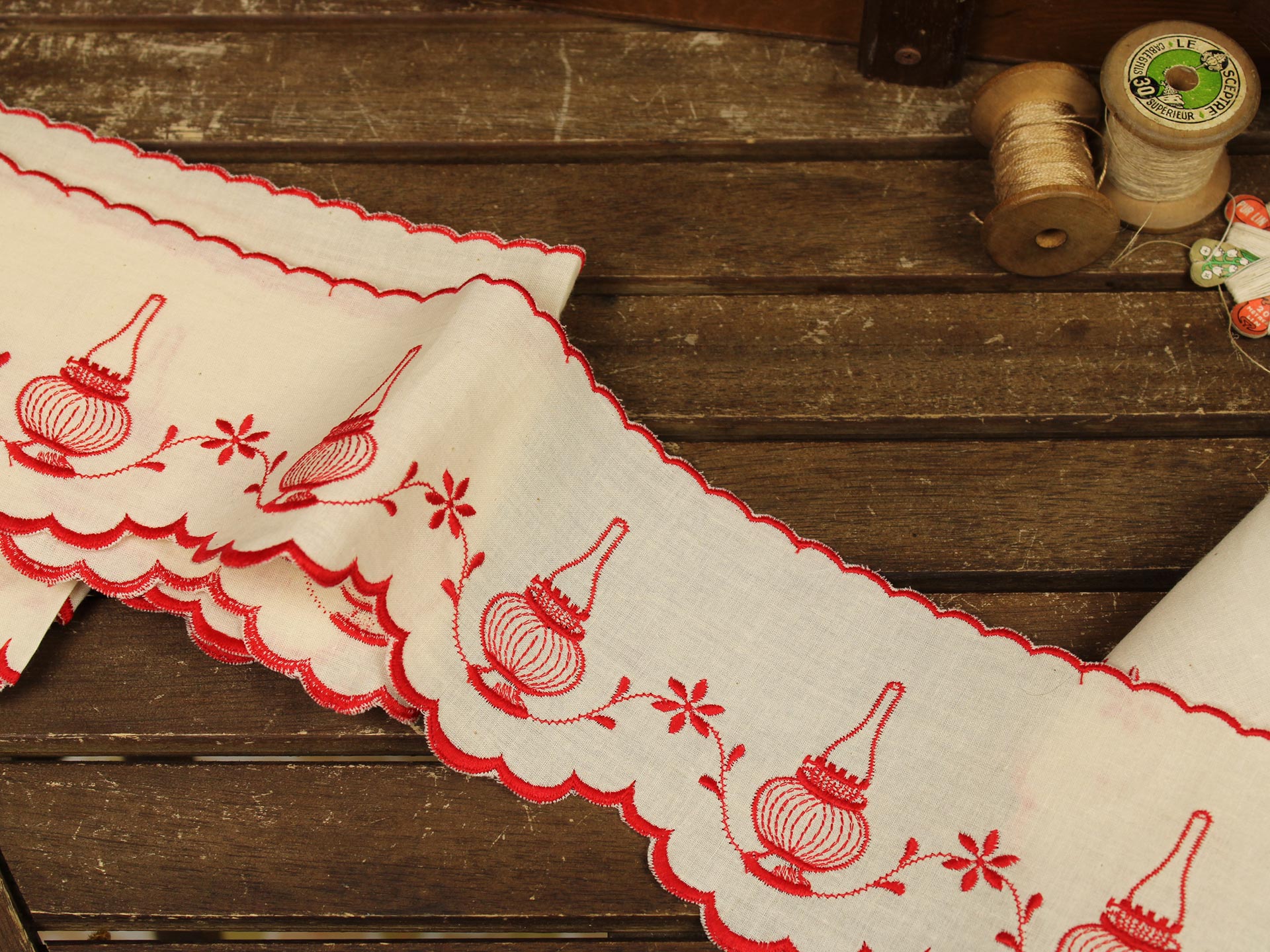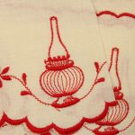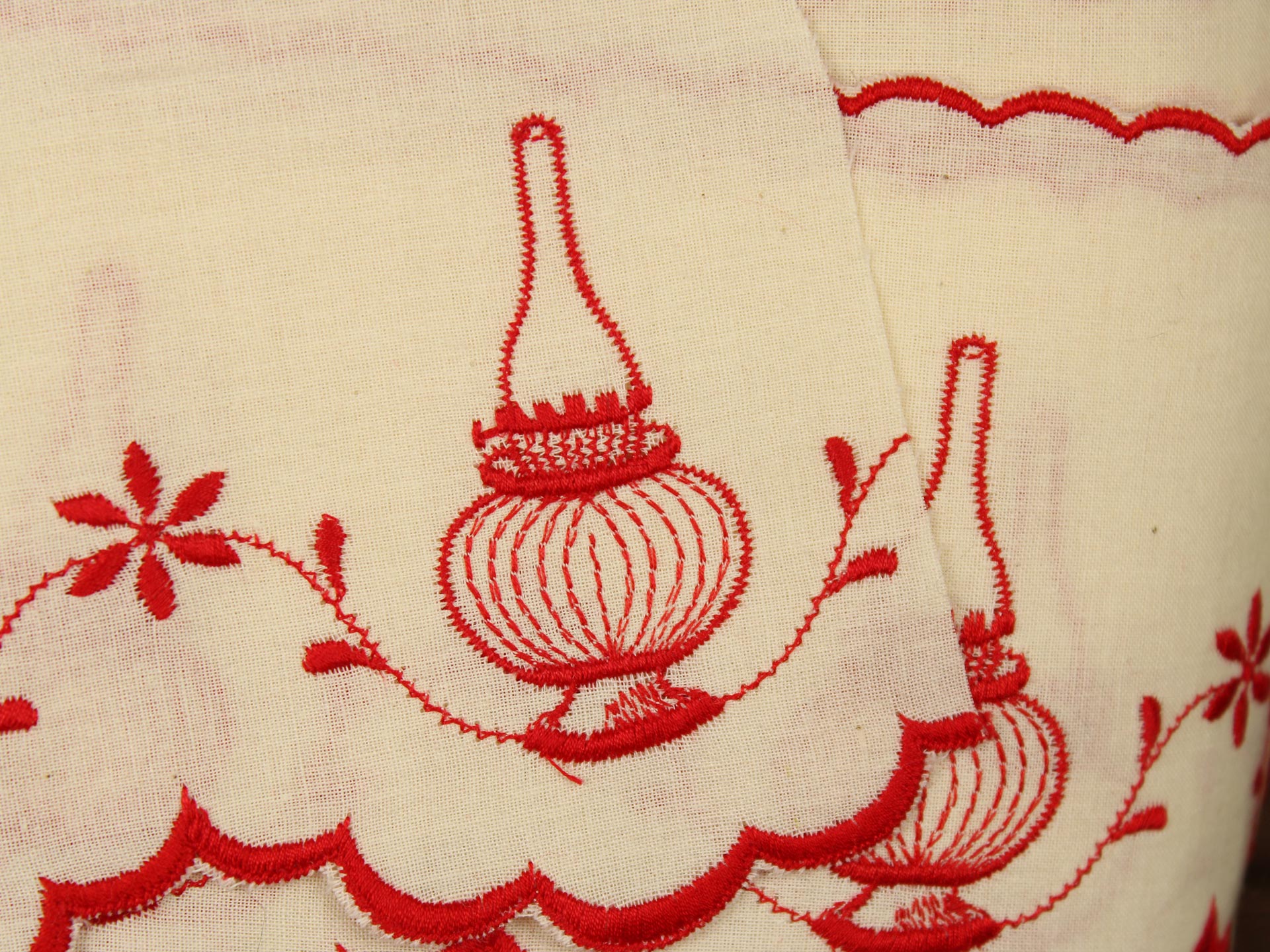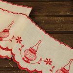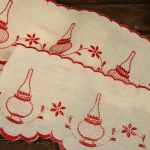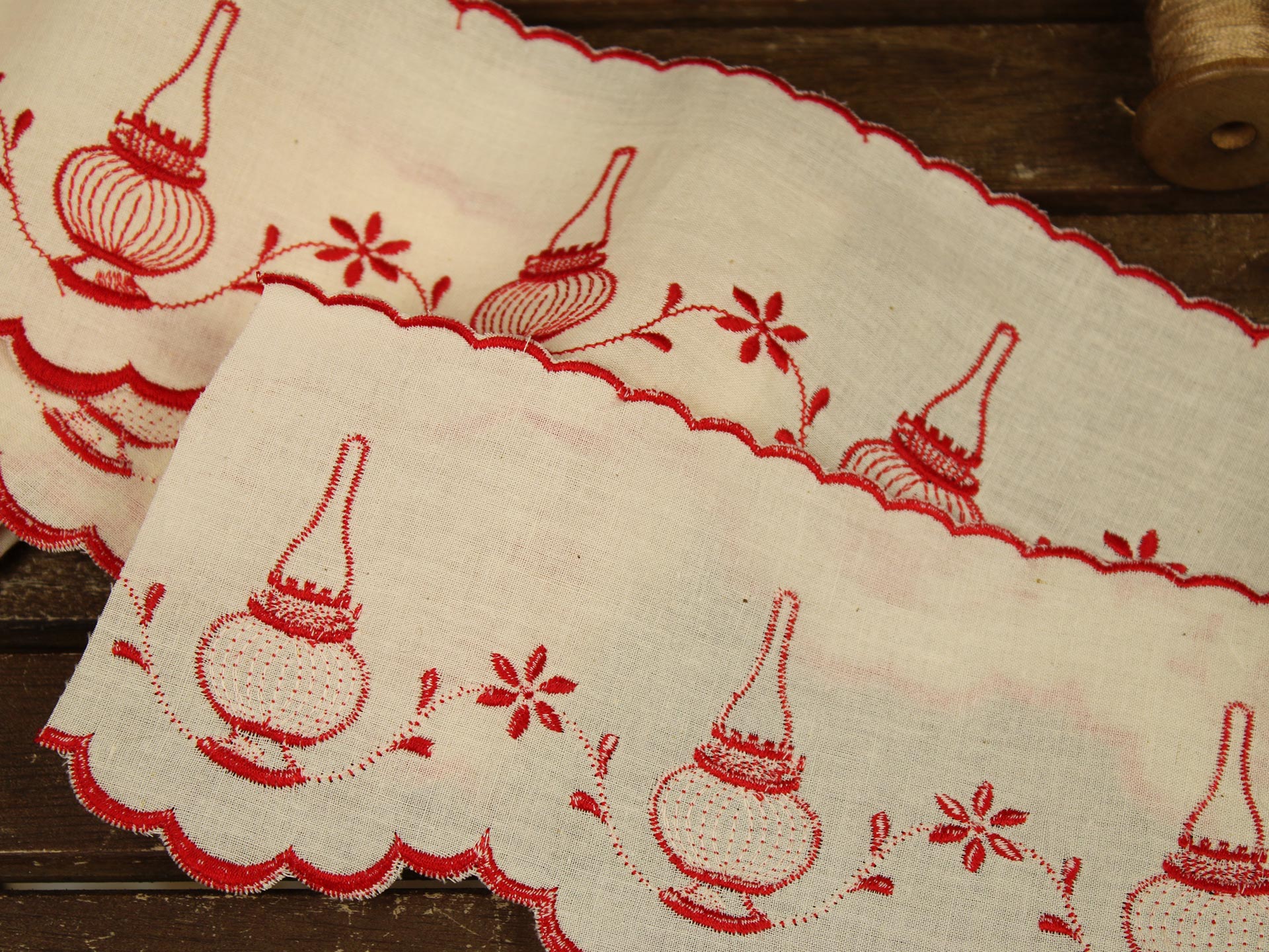 アンティークなランプ柄。上下スカラップ刺繍です。生成りのコットン地に赤糸のオーソドックスなスタイル。