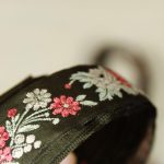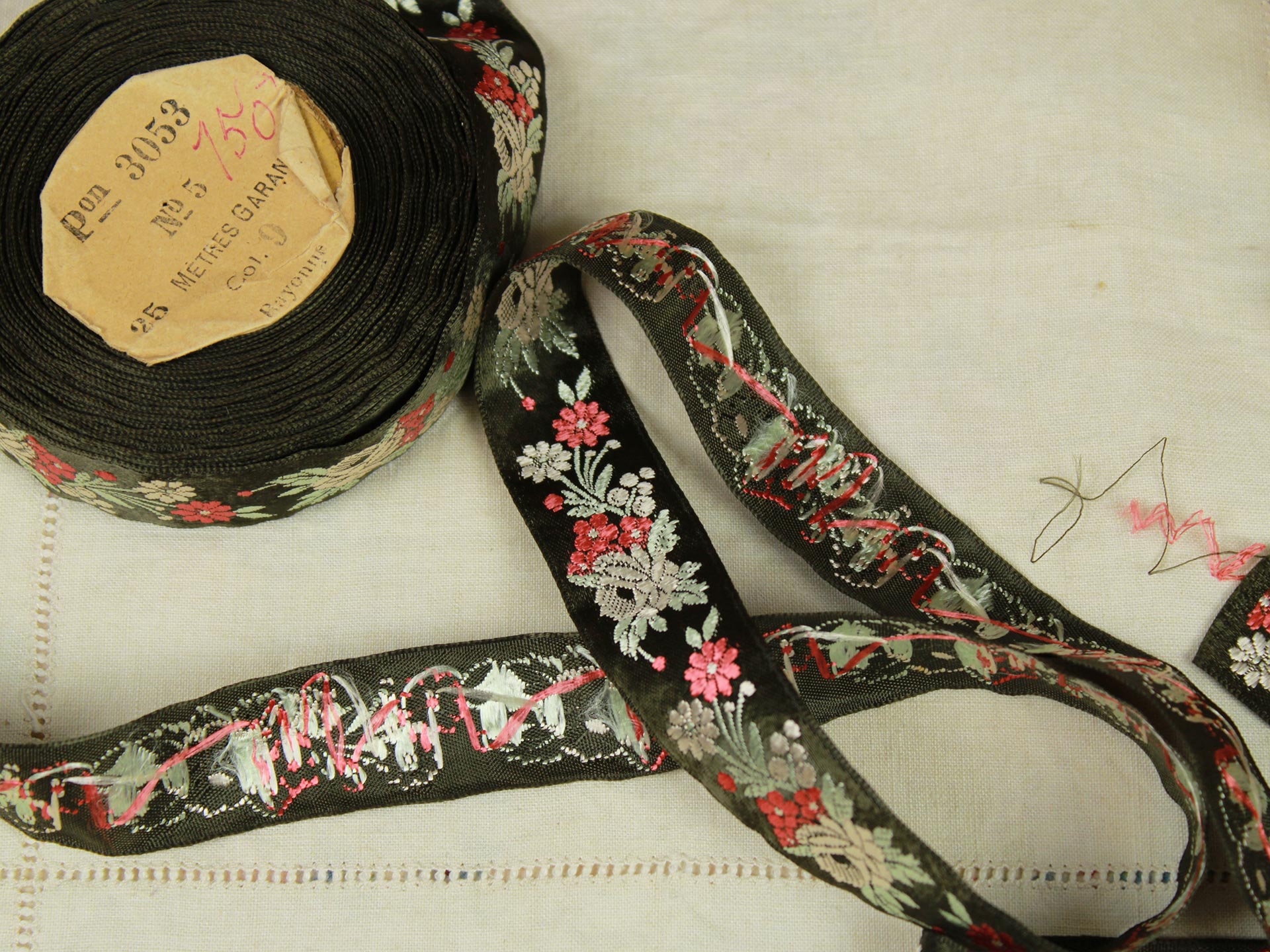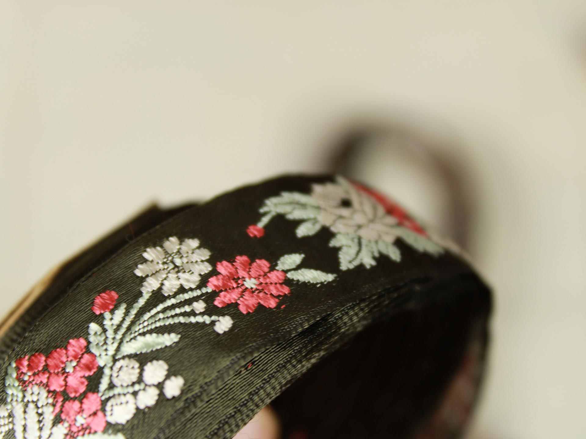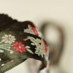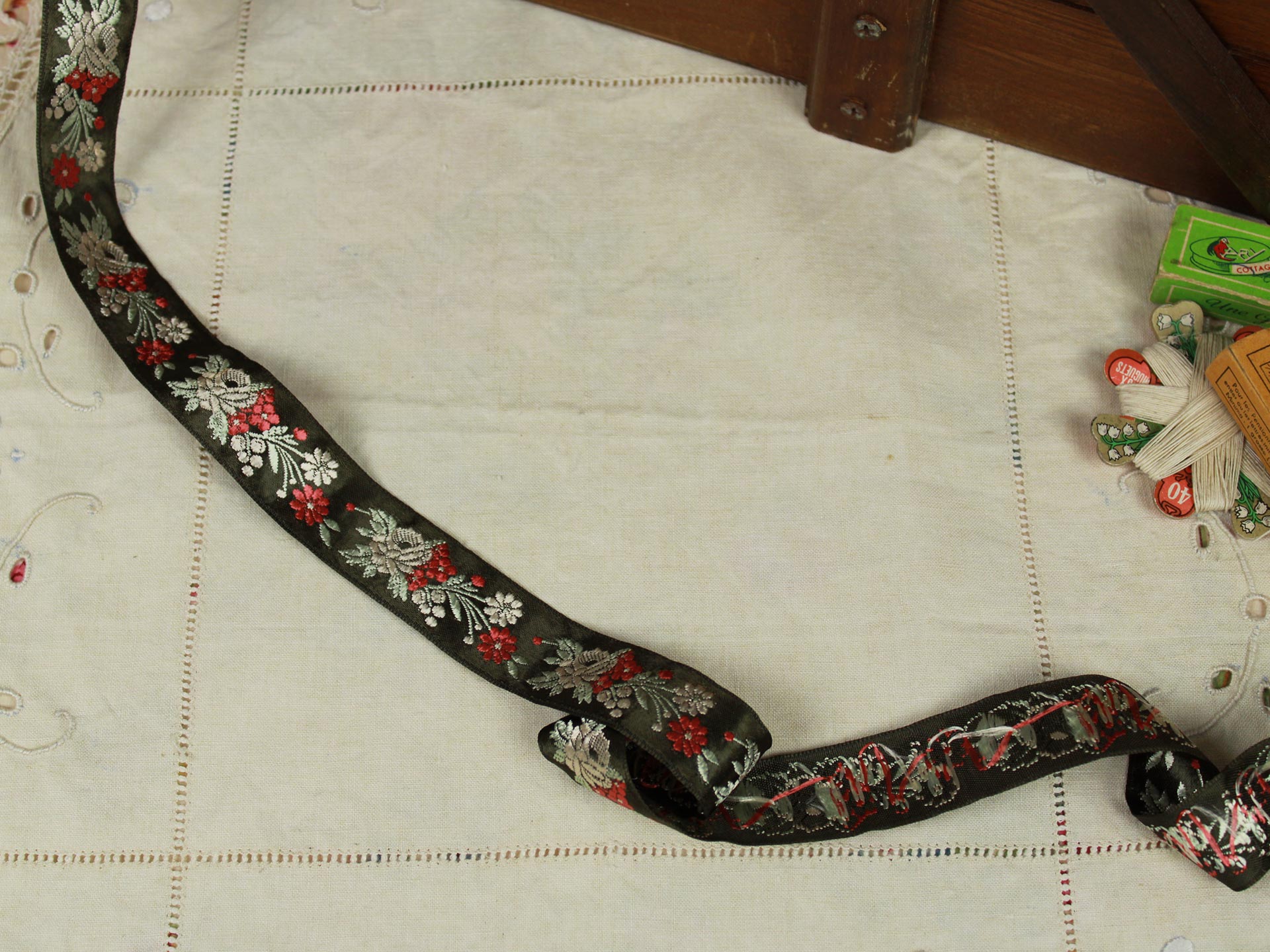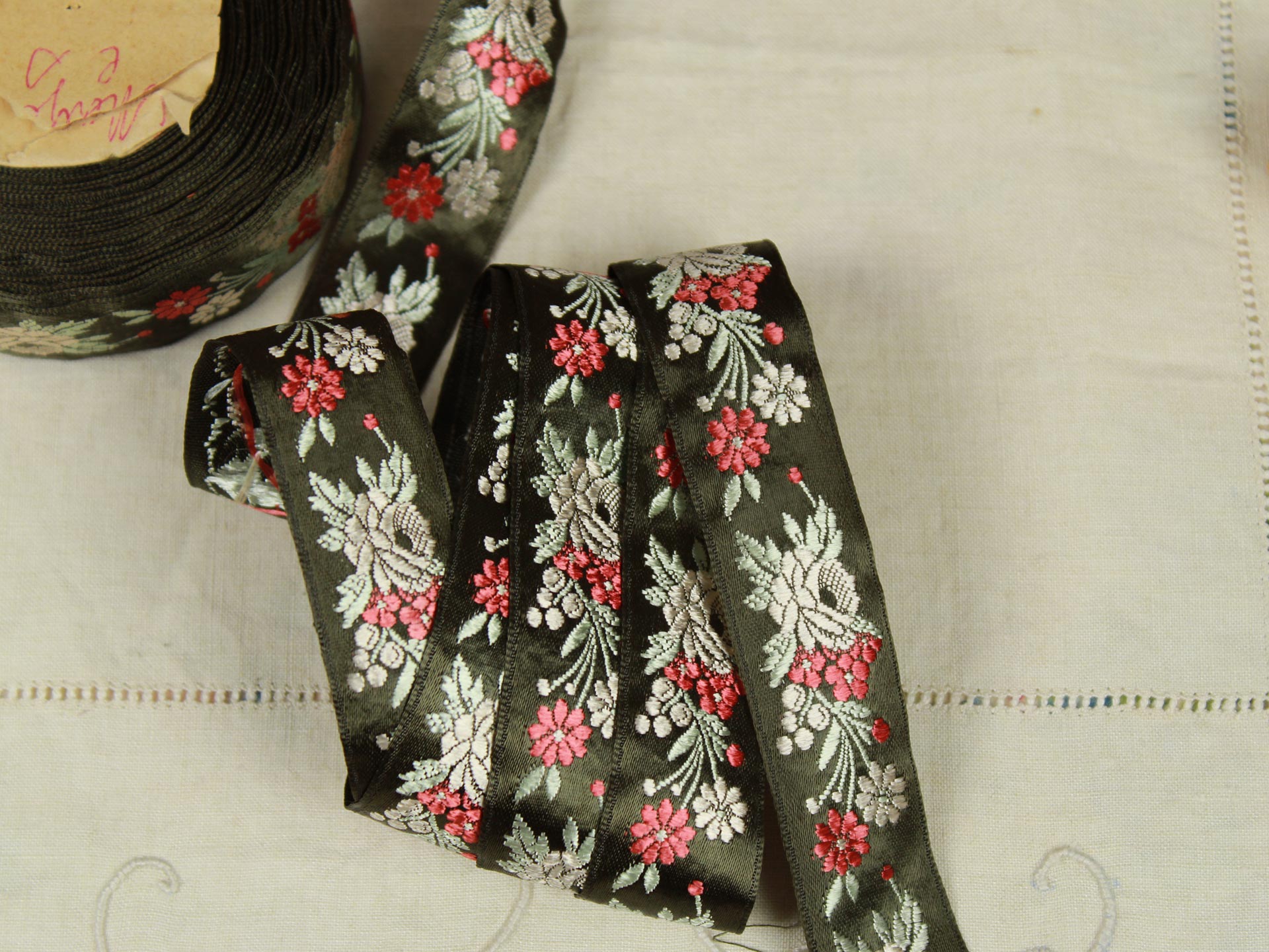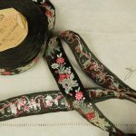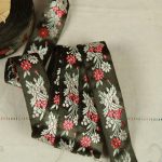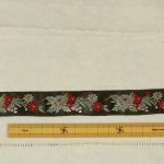 クラシックな花模様の刺繍リボンです。光沢のある深緑色にシルバー、赤の配色。シックでエレガントな印象です。レーヨンの滑らかな手触り。お洋服や小物づくりのアクセントにいかがでしょうか。