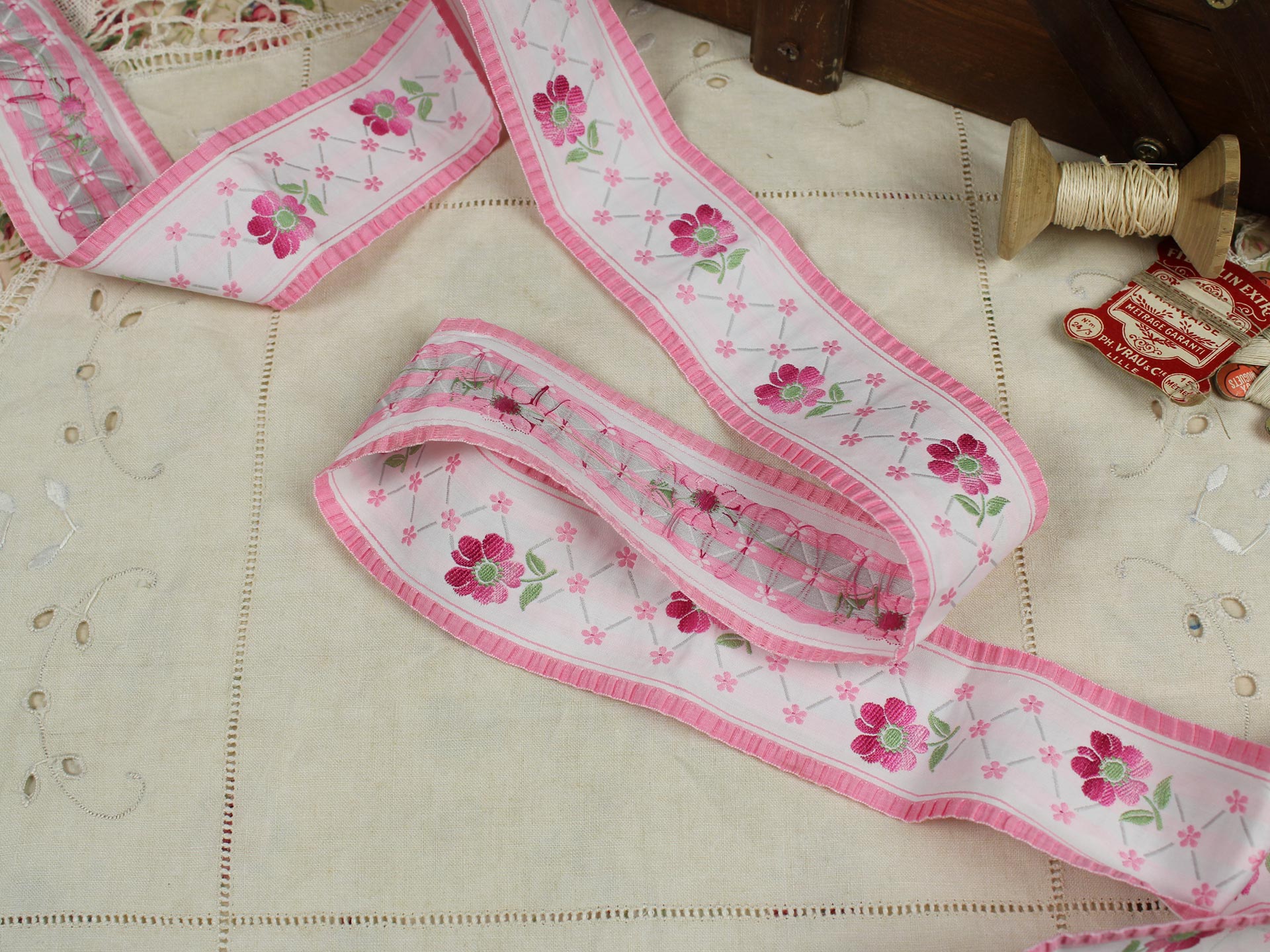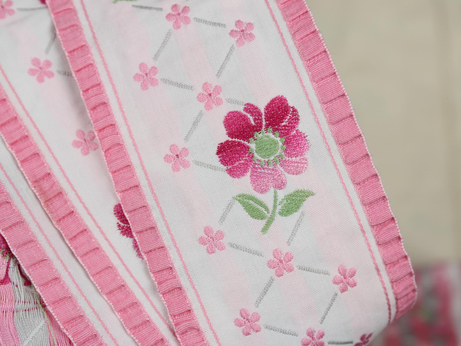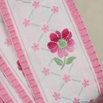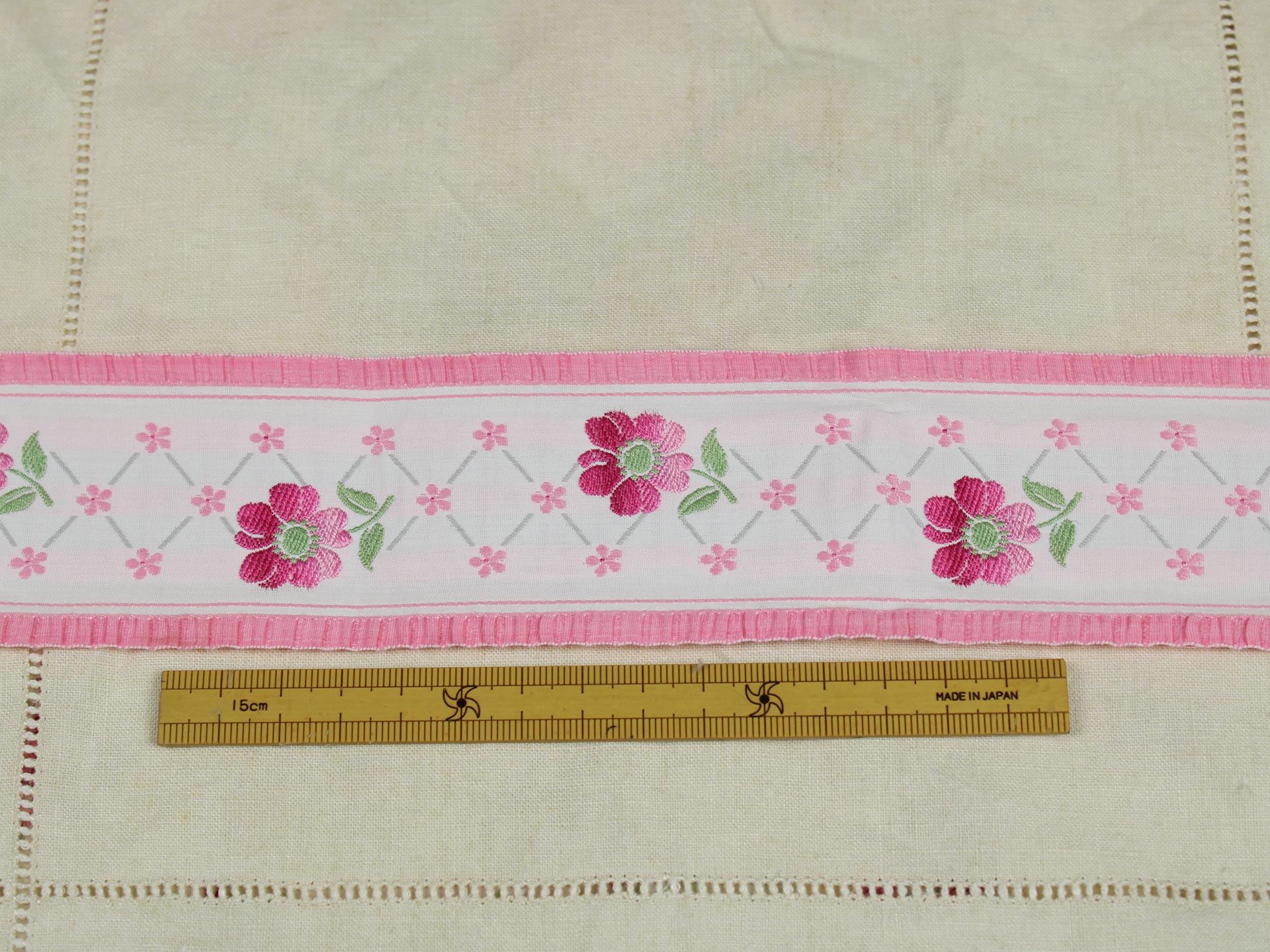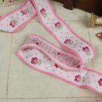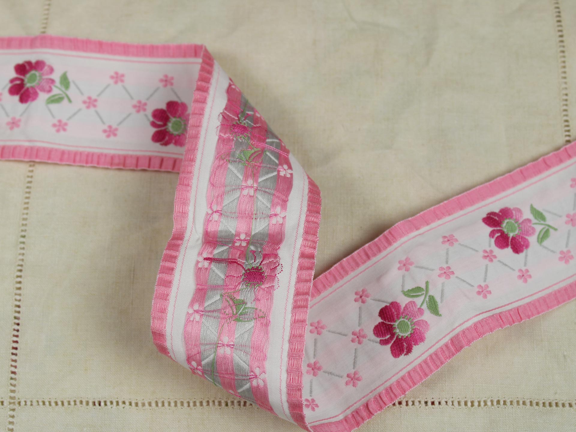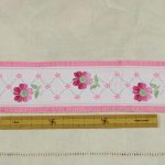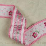 幅広、クラシックな花模様の刺繍リボンです。両端がフリル状の縁取りになっており、ピンクのグラデーションの花と小花の可愛らしいデザインです。地のリボンは化繊100%、または化繊混じりのようです。