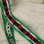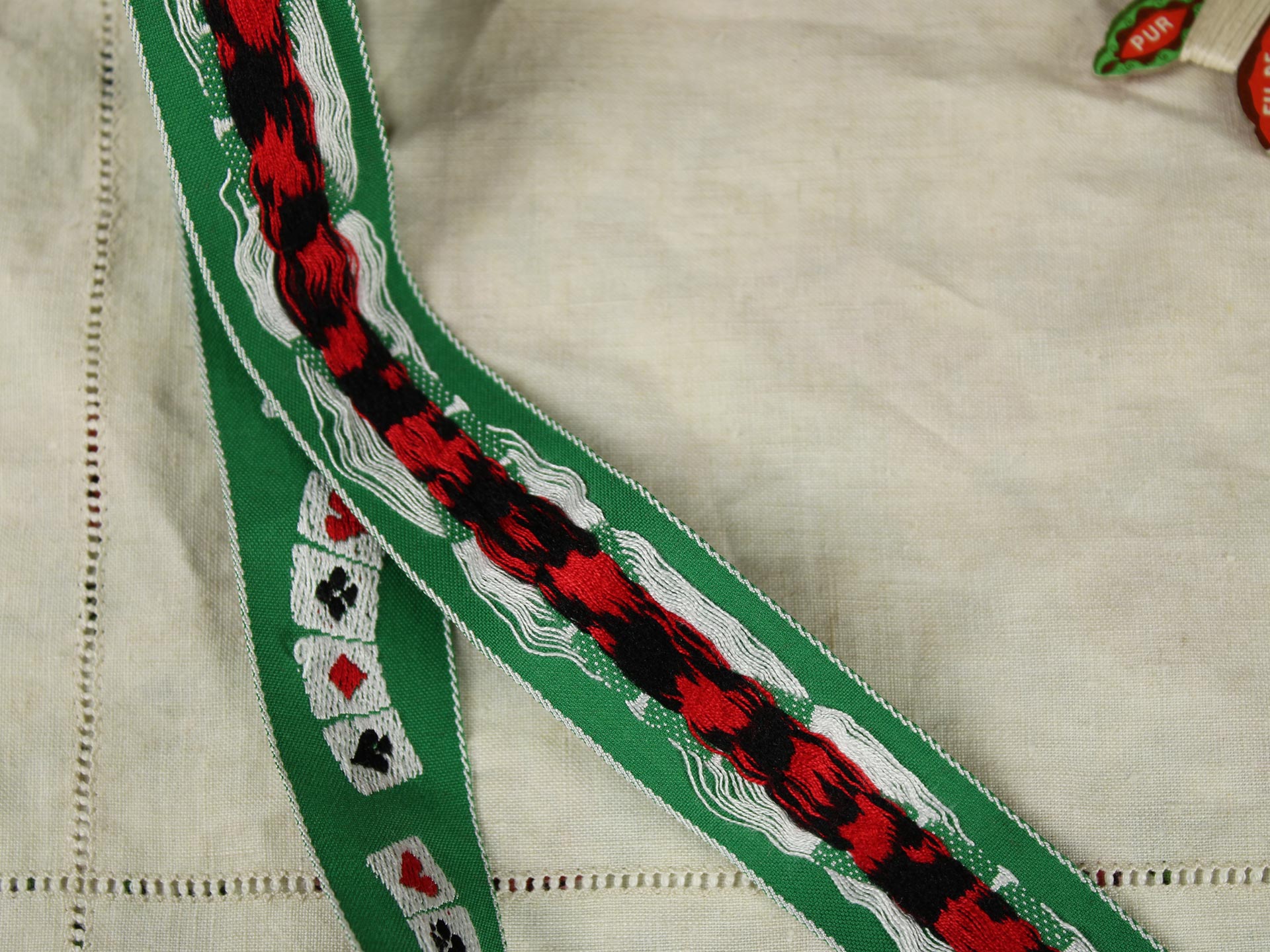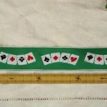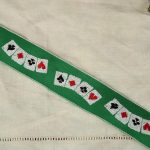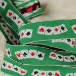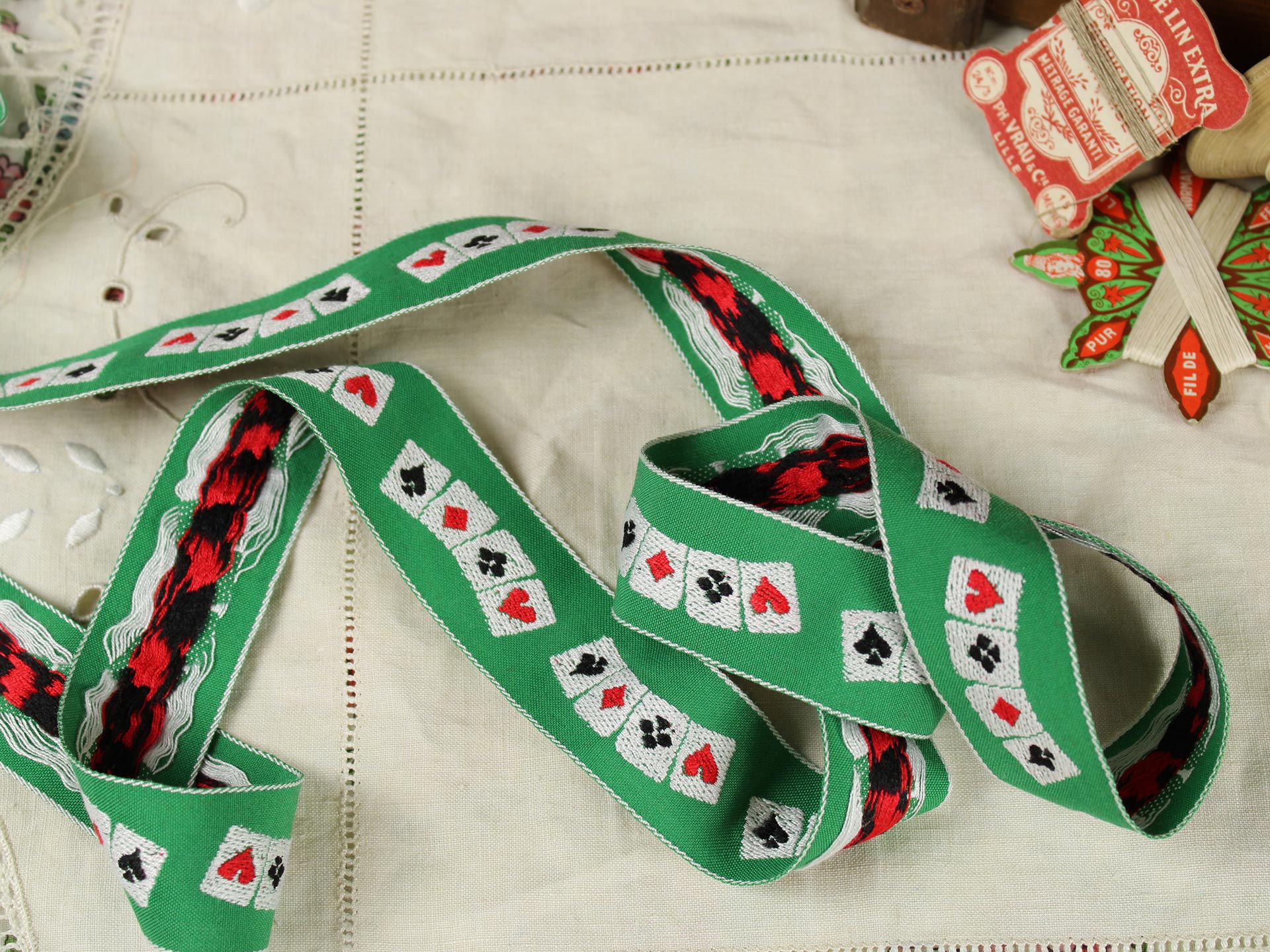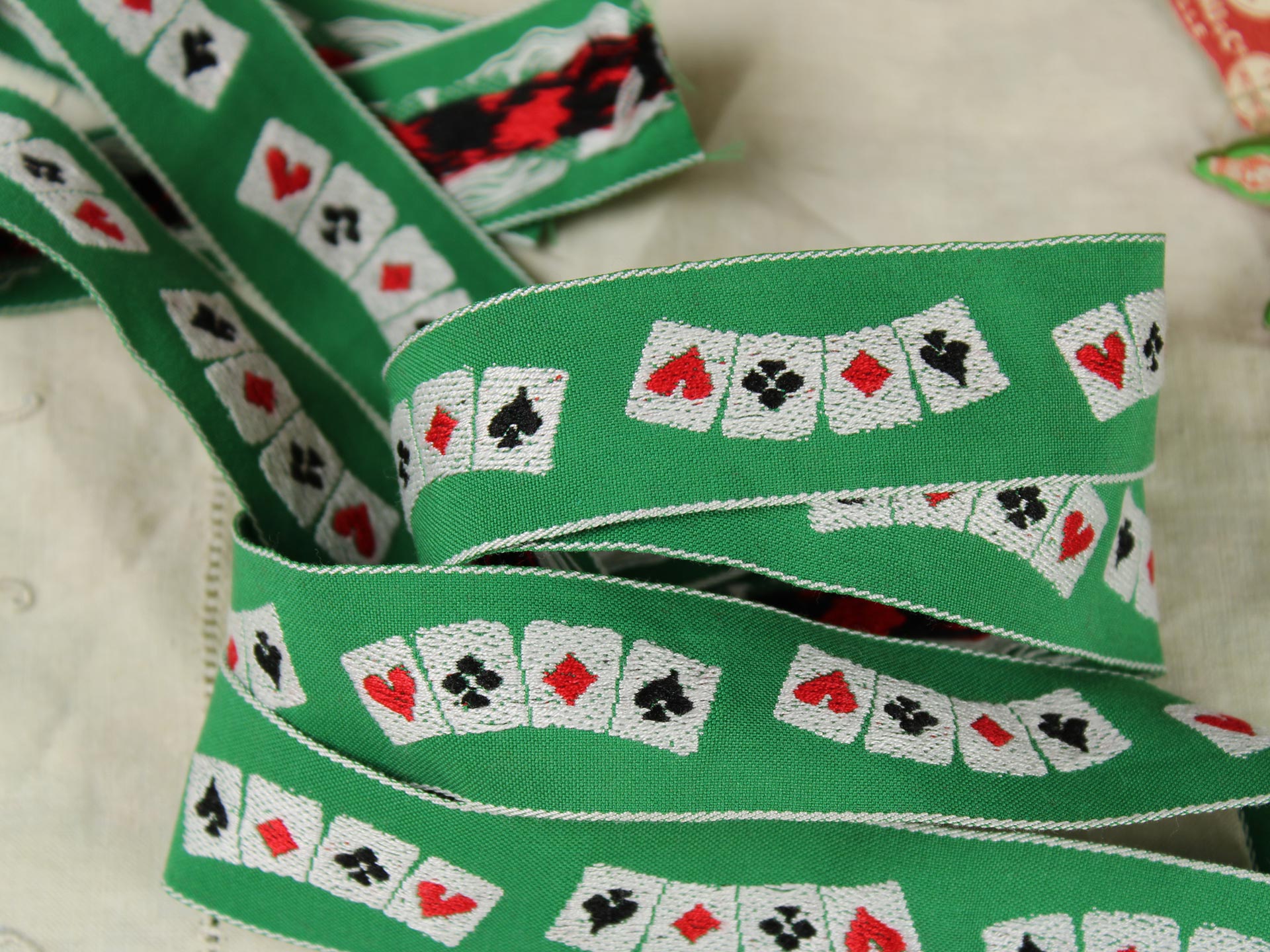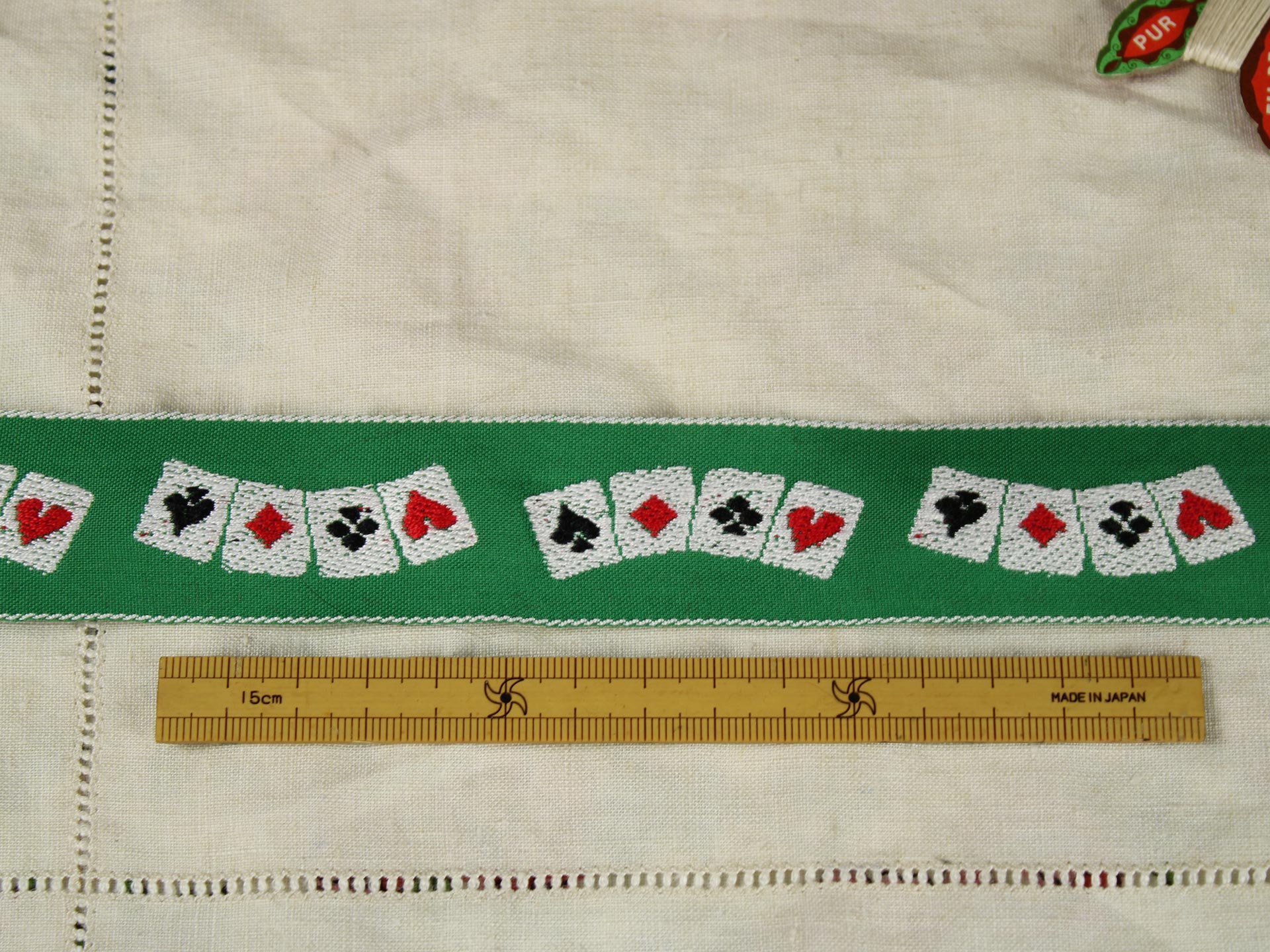 ユニークなトランプモチーフの刺繍リボンです。緑地、太め幅。地のリボンは化繊100%のようです。