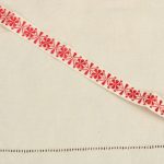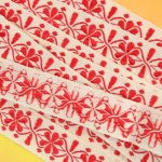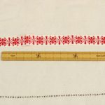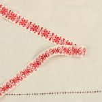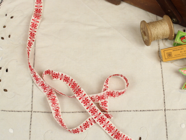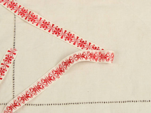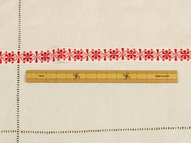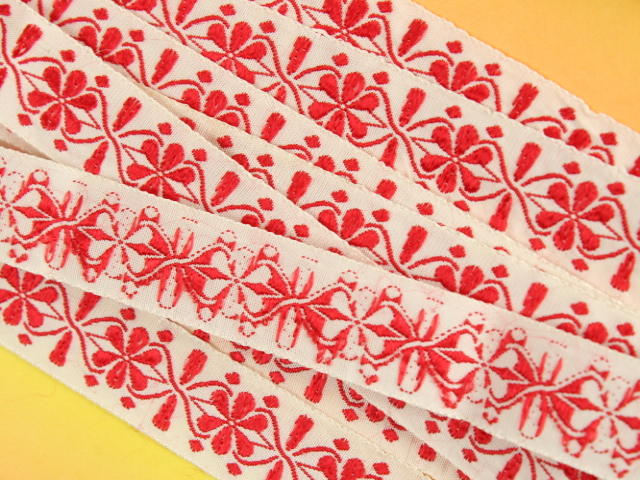 幾何学的な花模様が刺繍されたリボンです。シンプルな赤の刺繍。地のリボンは化繊製のようです。