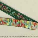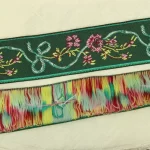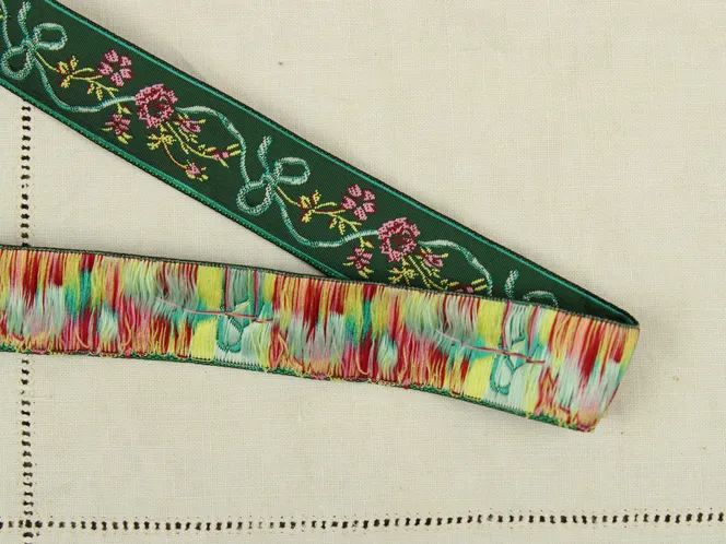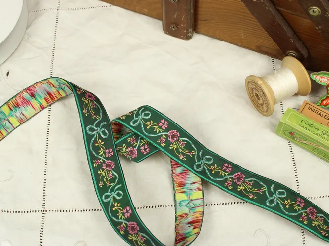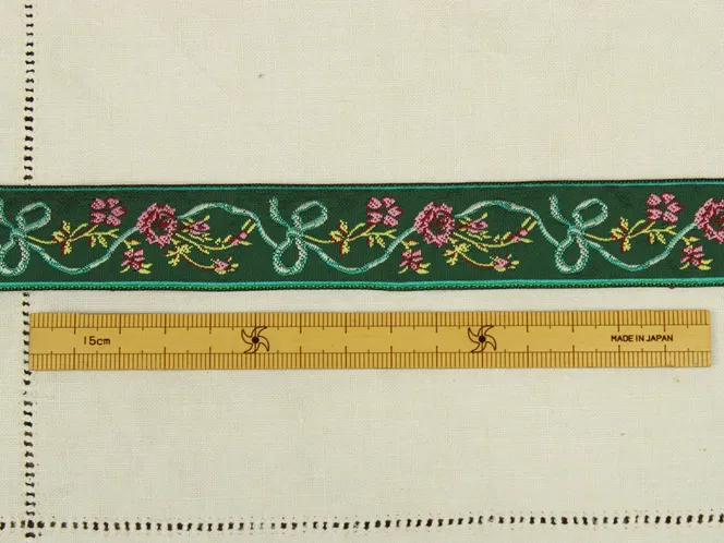 軽い光沢のある化繊製の刺繍リボンです。