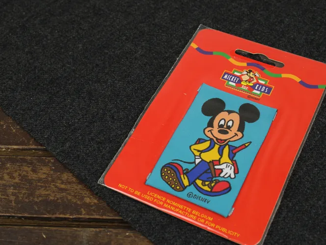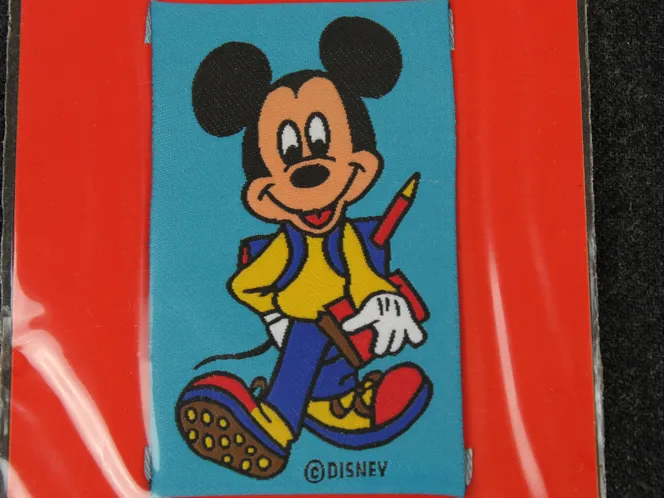 ディズニー、ミッキーのスクール柄、ヴィンテージ刺繍ワッペン。上下端の折られた刺繍ワッペン、縫い付けるタイプです。