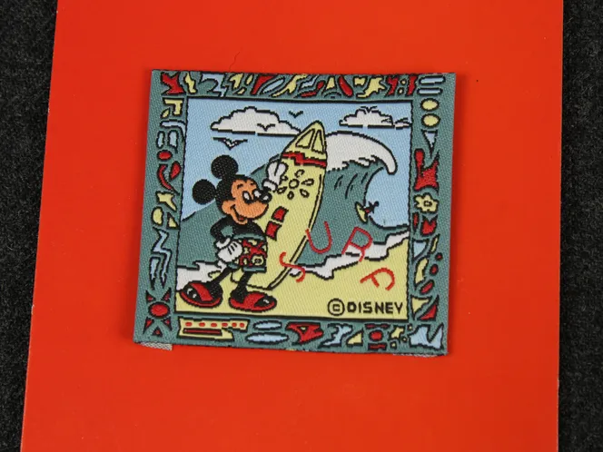 ディズニー、ミッキーのサーフィン柄、ヴィンテージ刺繍ワッペン。上下端の折られた刺繍ワッペン、縫い付けるタイプです。