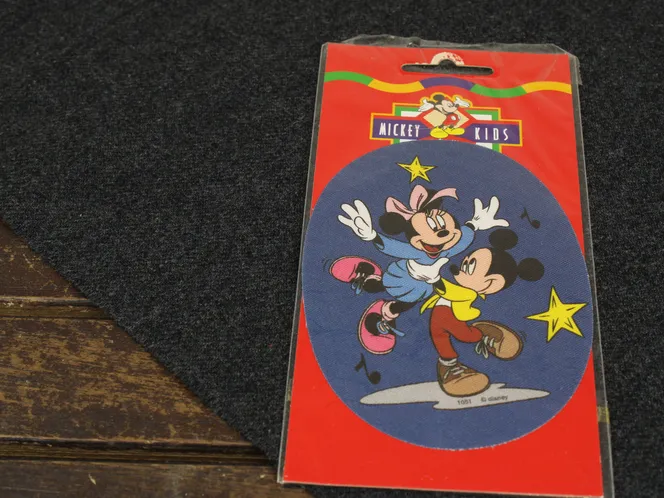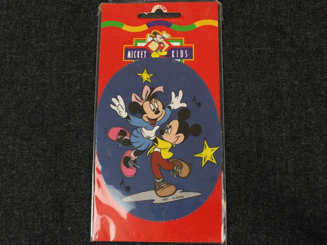 ディズニー、ミッキー&ミニー、ヴィンテージアイロンワッペン。楕円形のプリントワッペン、アイロン接着タイプです。