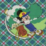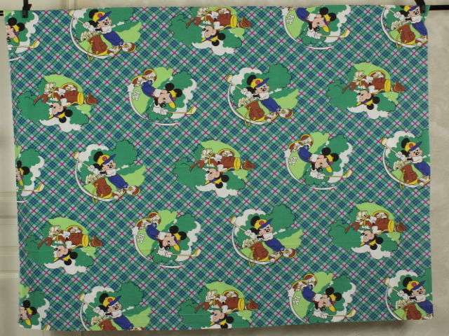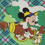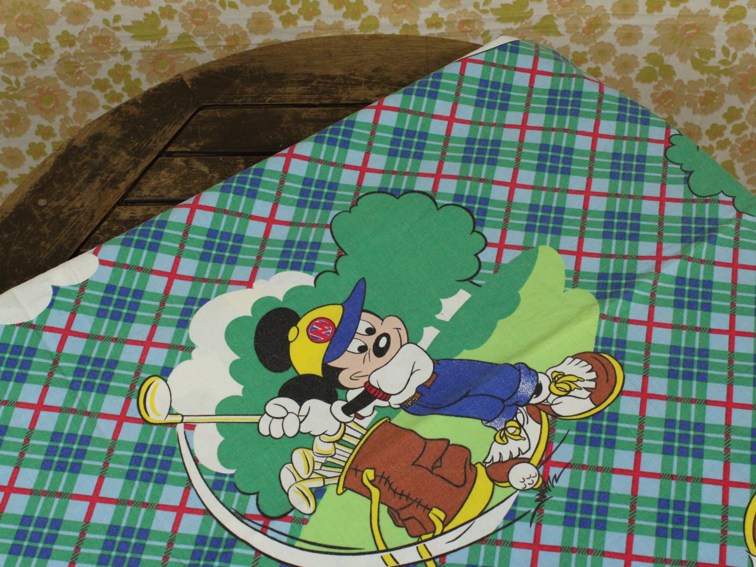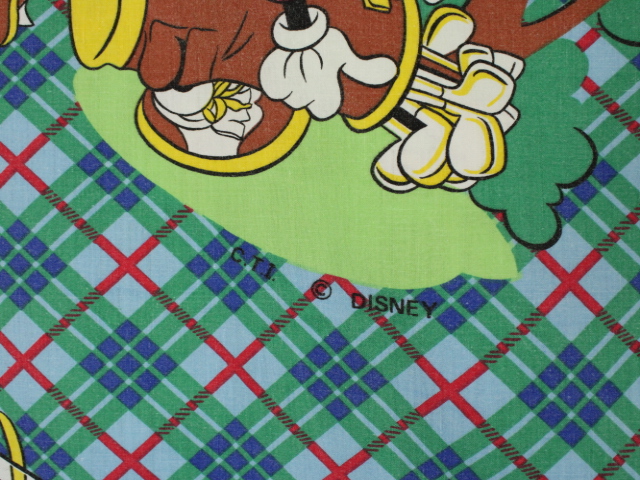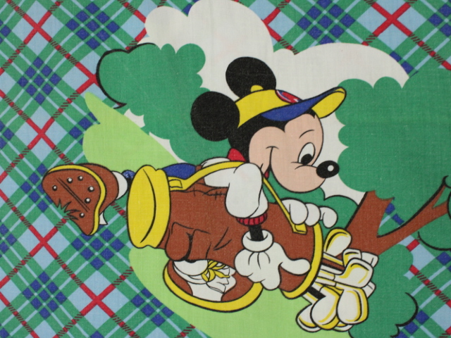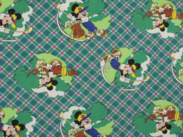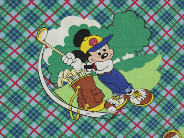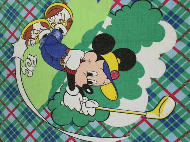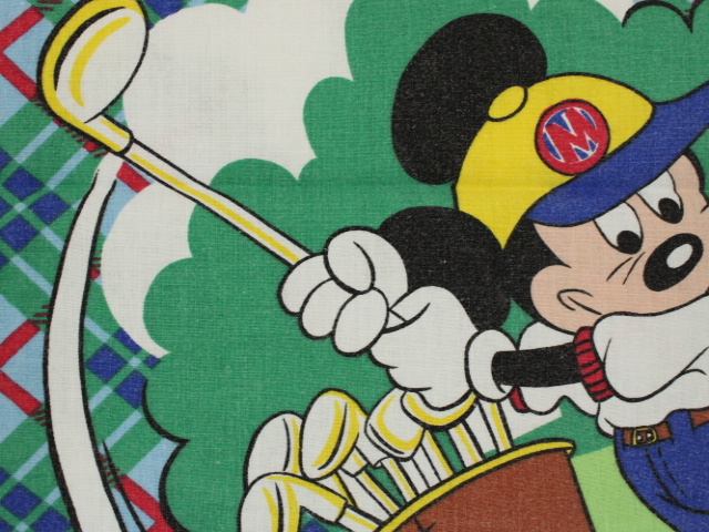タータンチェックの背景にレトロ顔のミッキーがかわいい、ゴルフ柄のフラットシーツです。シーツは1枚もの。全体画像(画像1,2)はそれぞれシーツを2つ折りにしています。