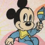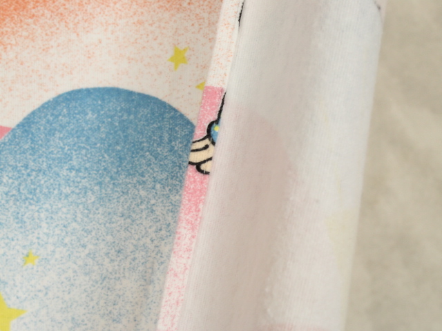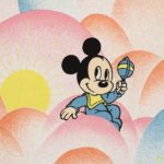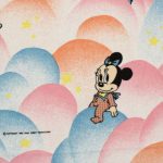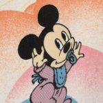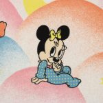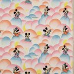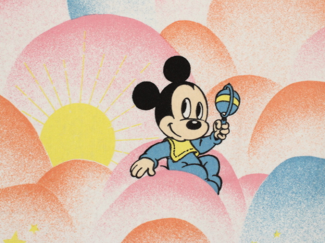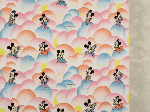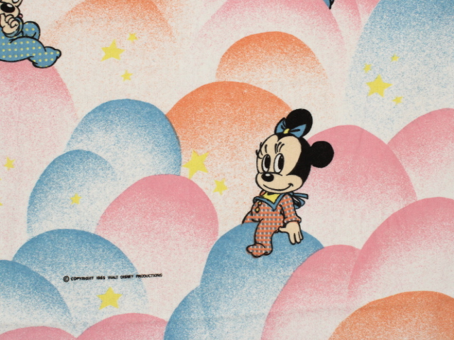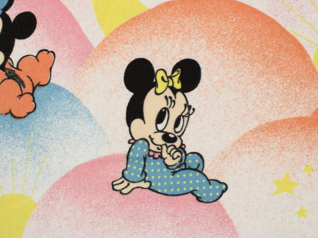 パステルカラーのもこもこ背景、ミッキー&ミニー、ベビーサイズのフラットシーツです。画像1枚めが全体です。レトロなお顔のベビーミキミニが可愛らしいデザイン。薄手のコットンフランネル生地です。
