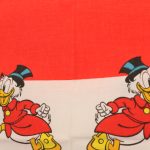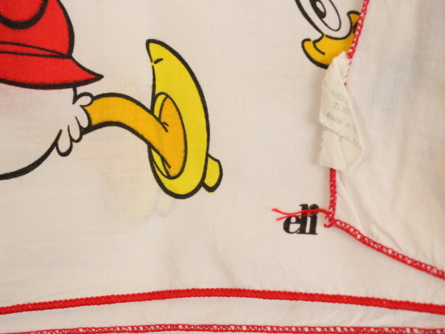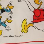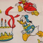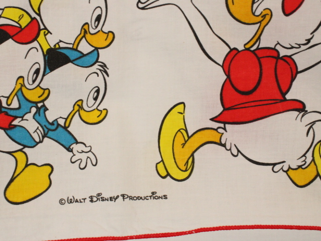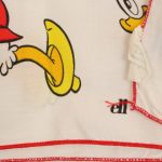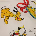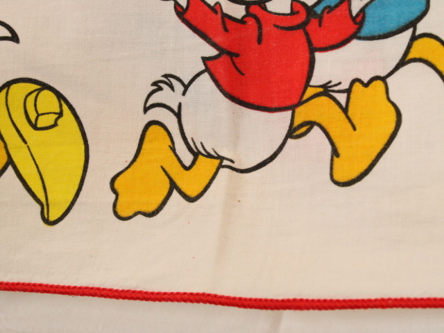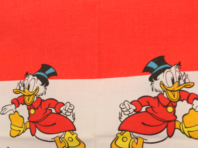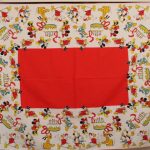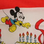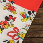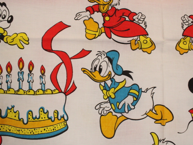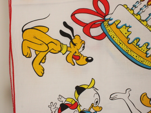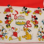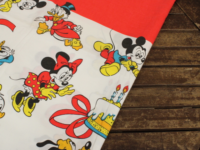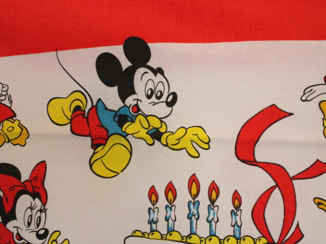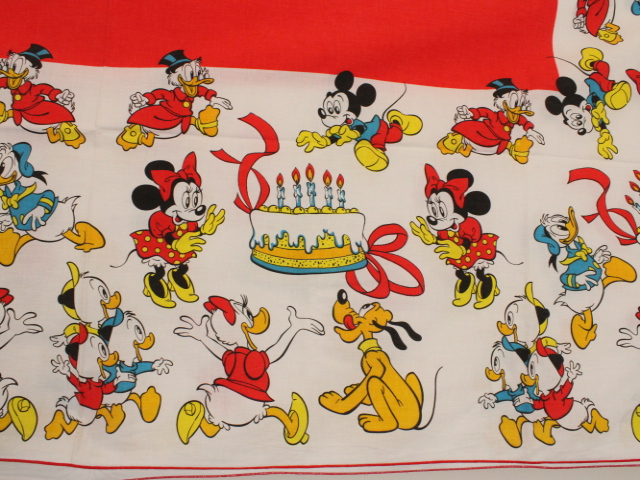 ケーキを囲んでお祝いしているようなミッキー、ミニーと仲間たち。中心が真っ赤でとても華やかなデザインです。布製、長方形のテーブルクロスです。レトロな絵柄を活かしたリメイクにもいかがでしょうか。