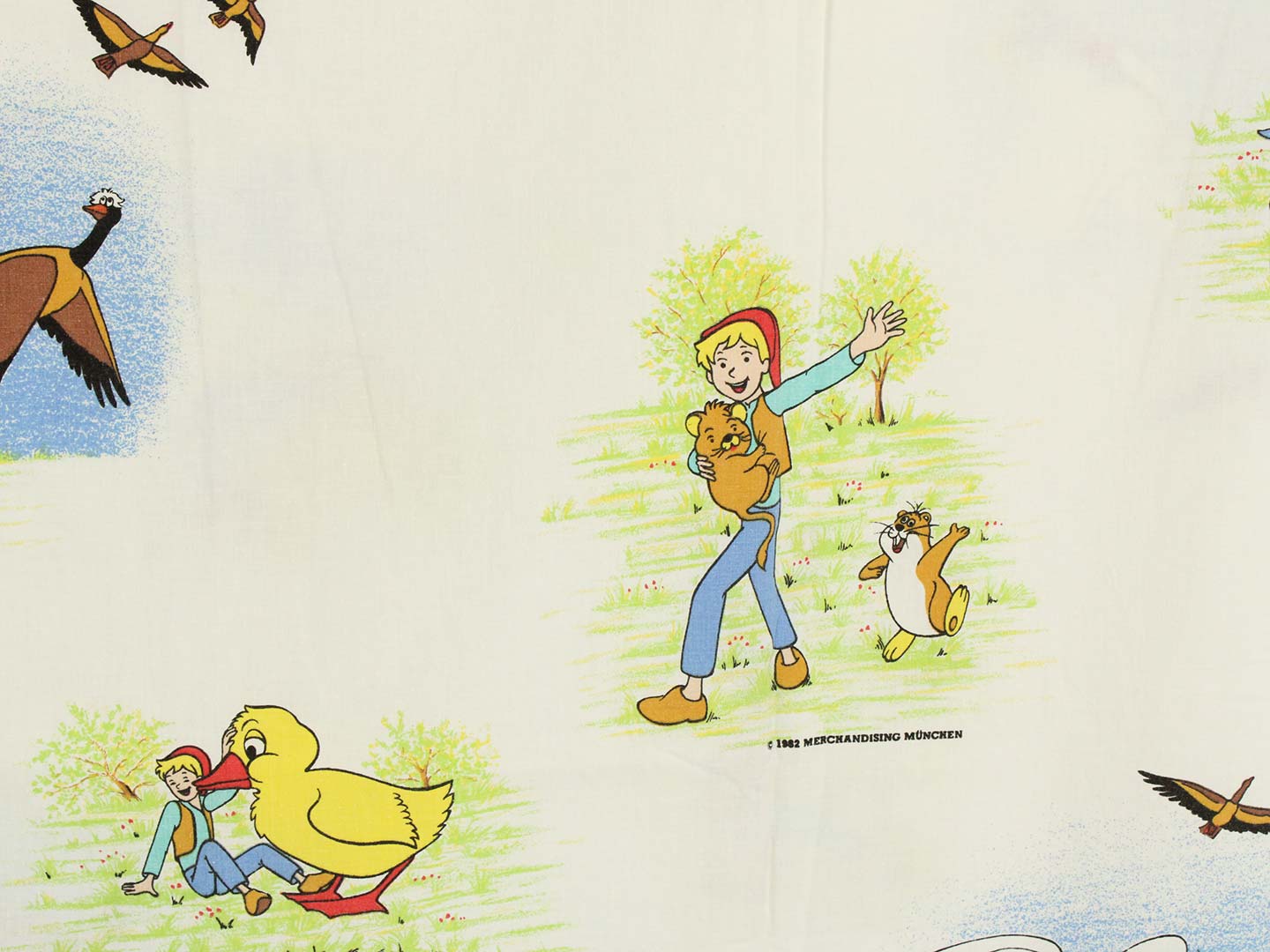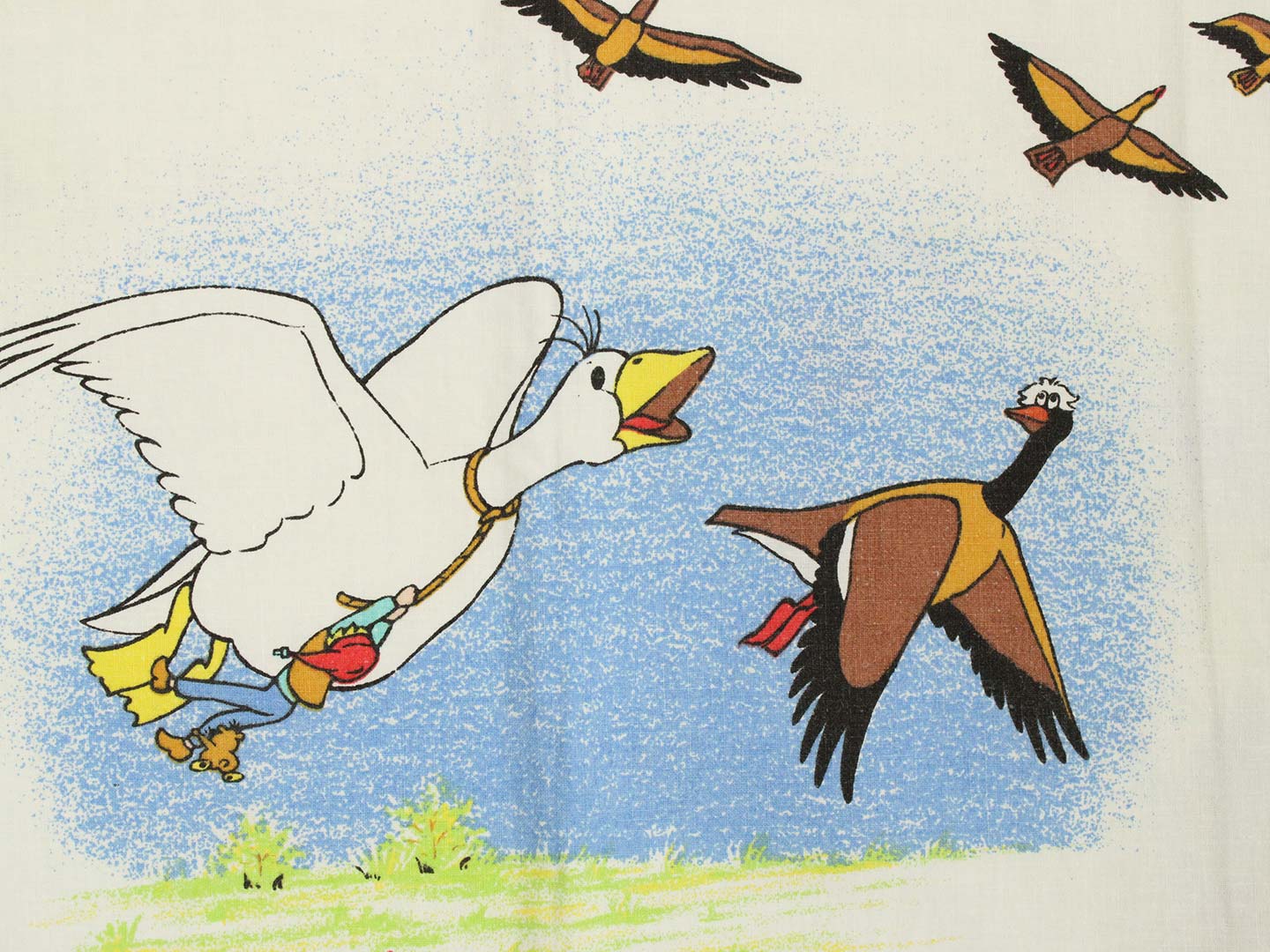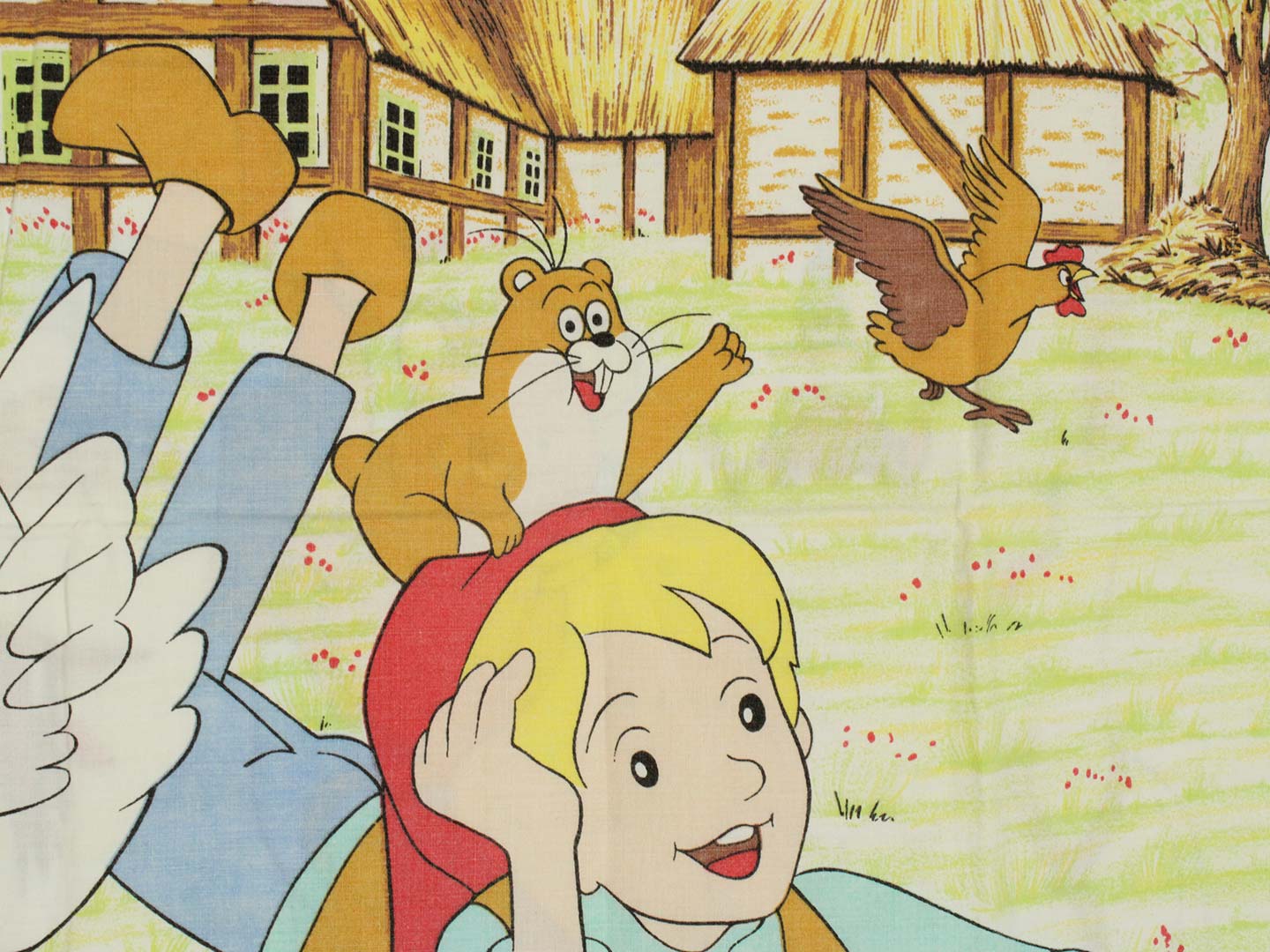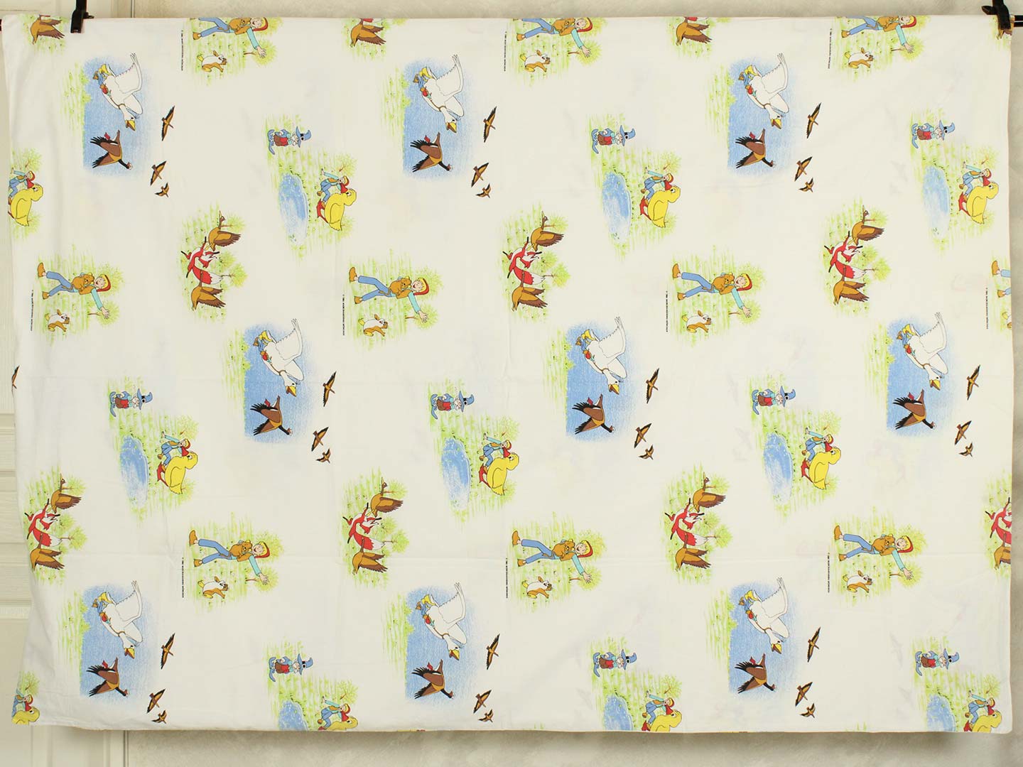 そのアニメ版ニルスのキャラクターや名場面が描かれたお布団カバー&ピローカバーのベッドセットです。お布団カバーは両面同じ絵柄。ピローカバーは別柄です。