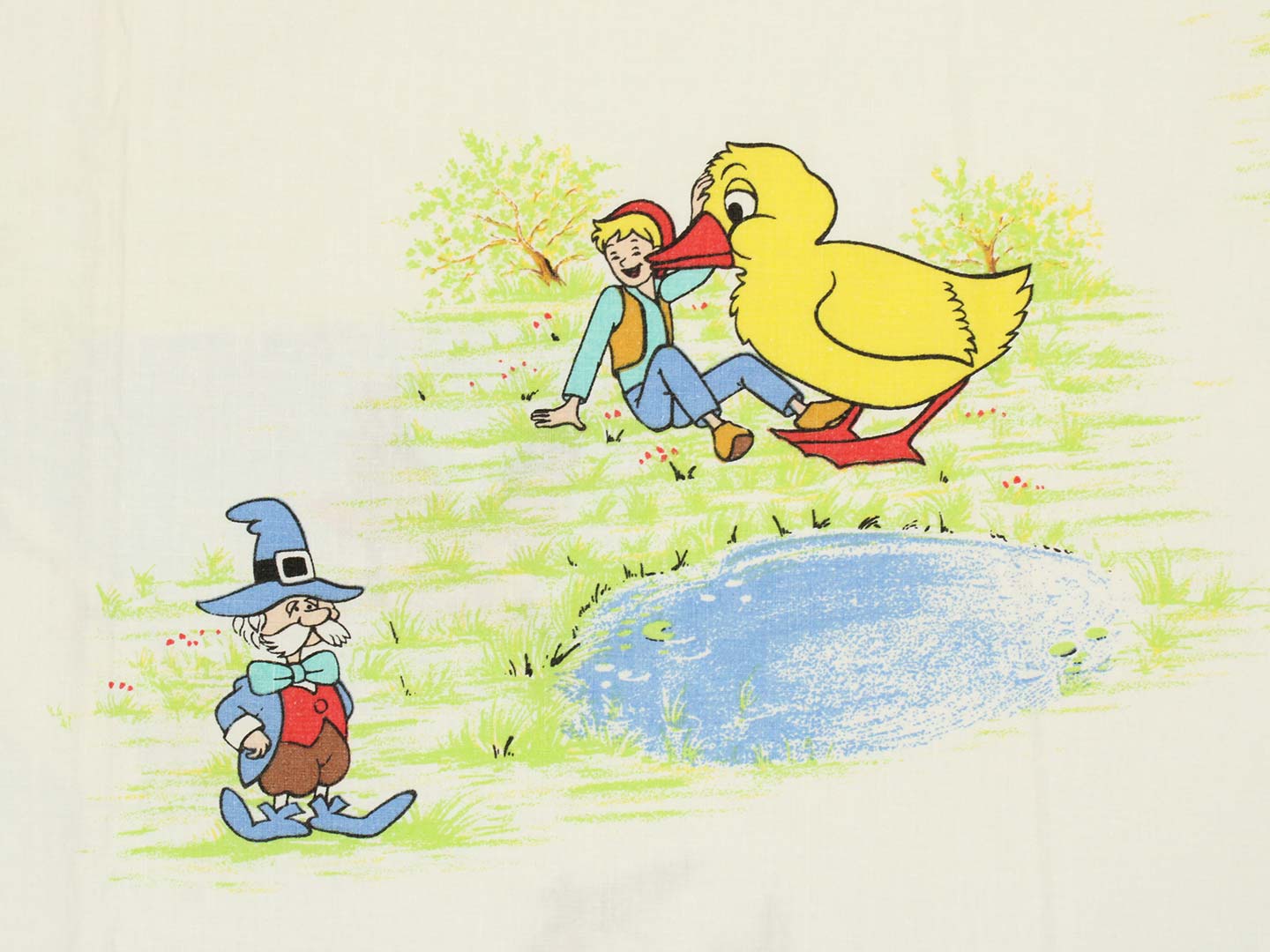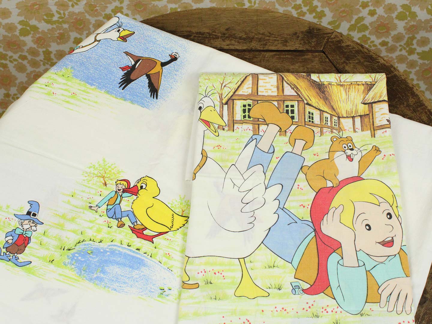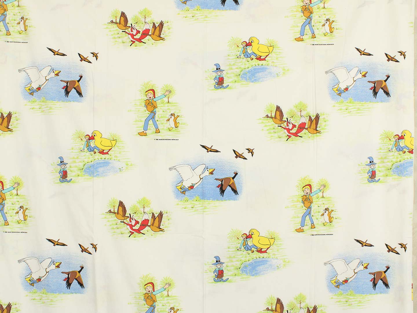 そのアニメ版ニルスのキャラクターや名場面が描かれたお布団カバー&ピローカバーのベッドセットです。お布団カバーは両面同じ絵柄。ピローカバーは別柄です。