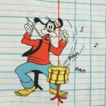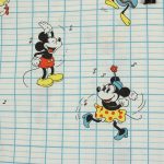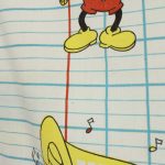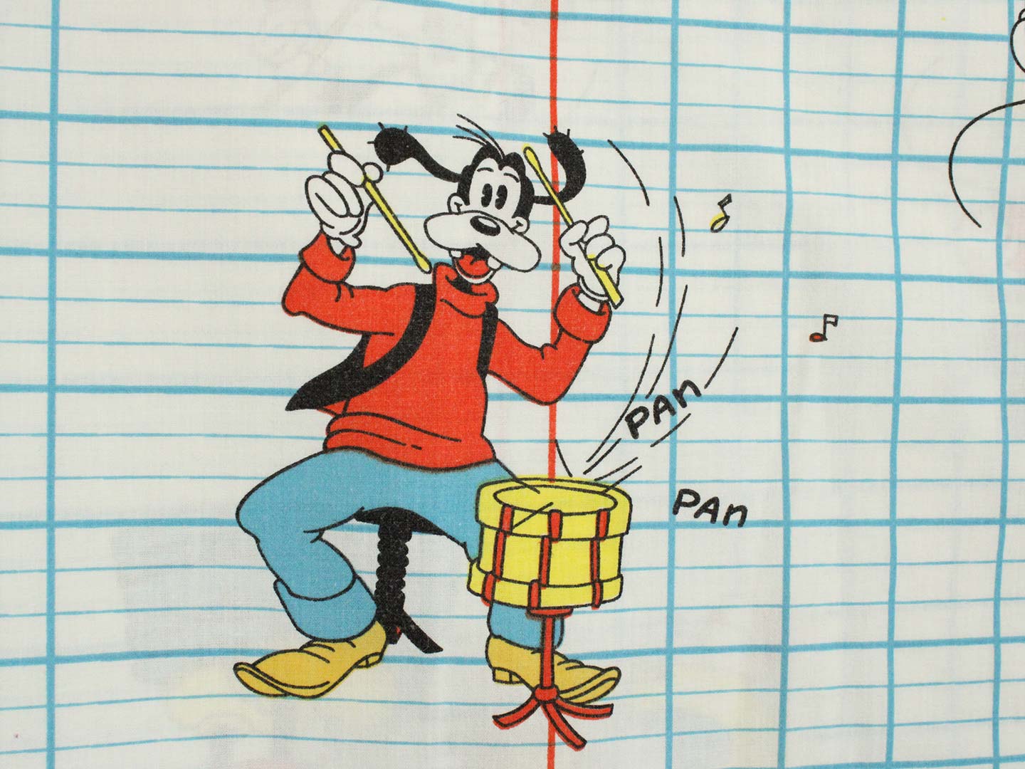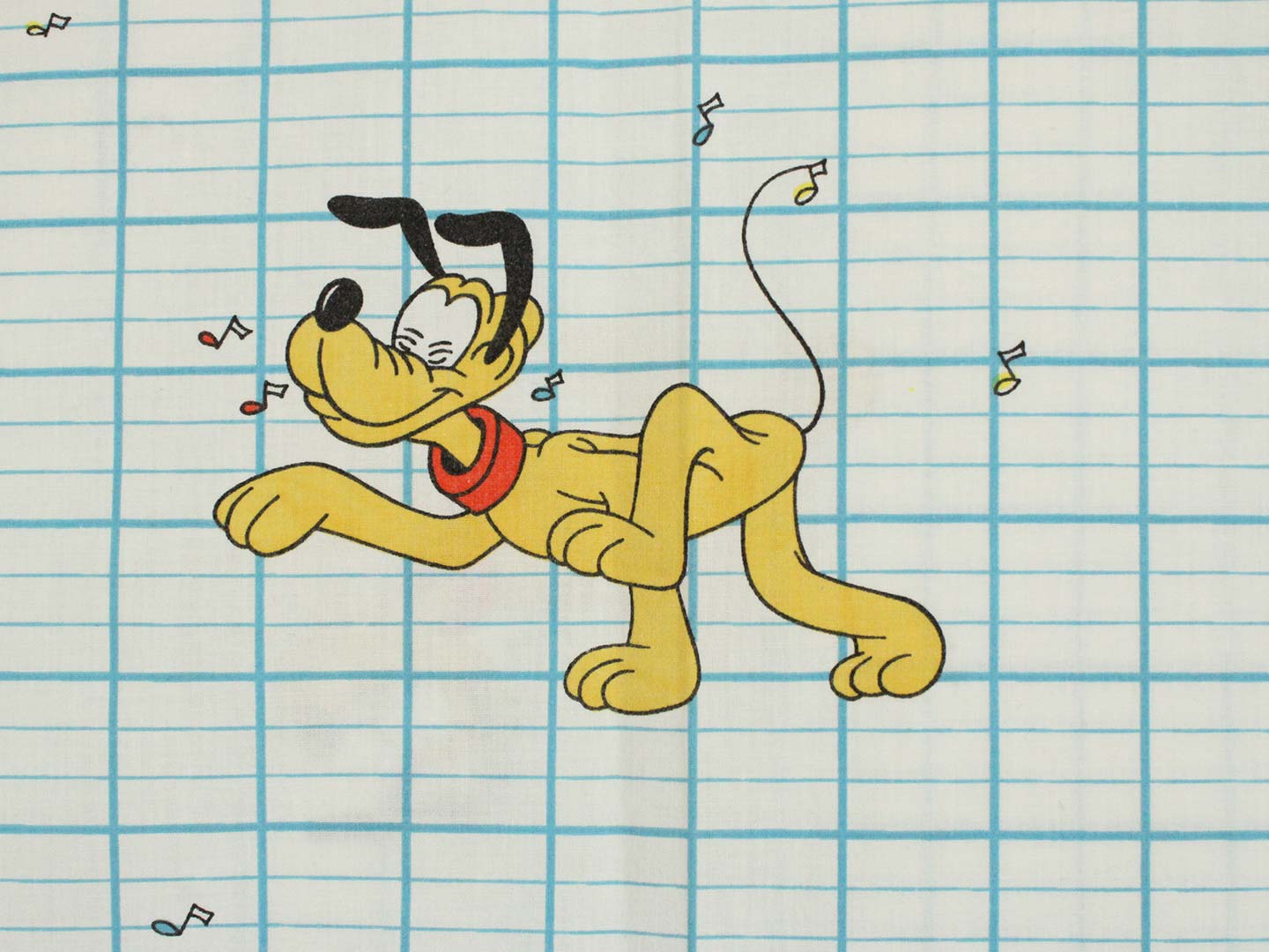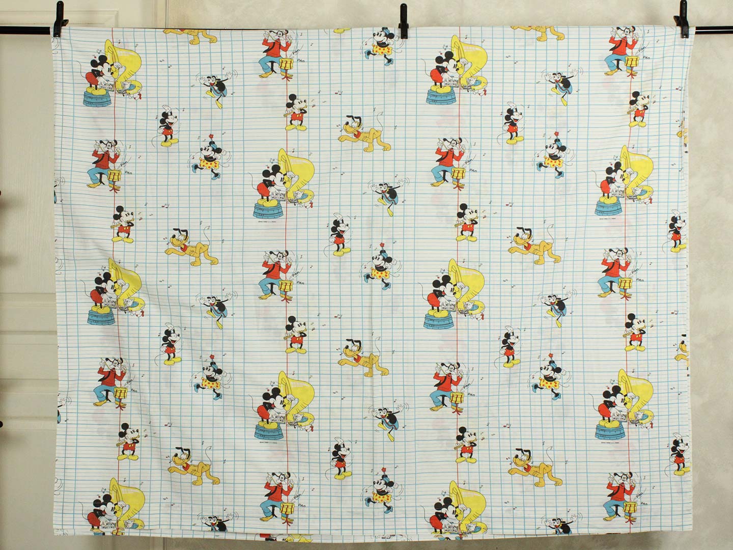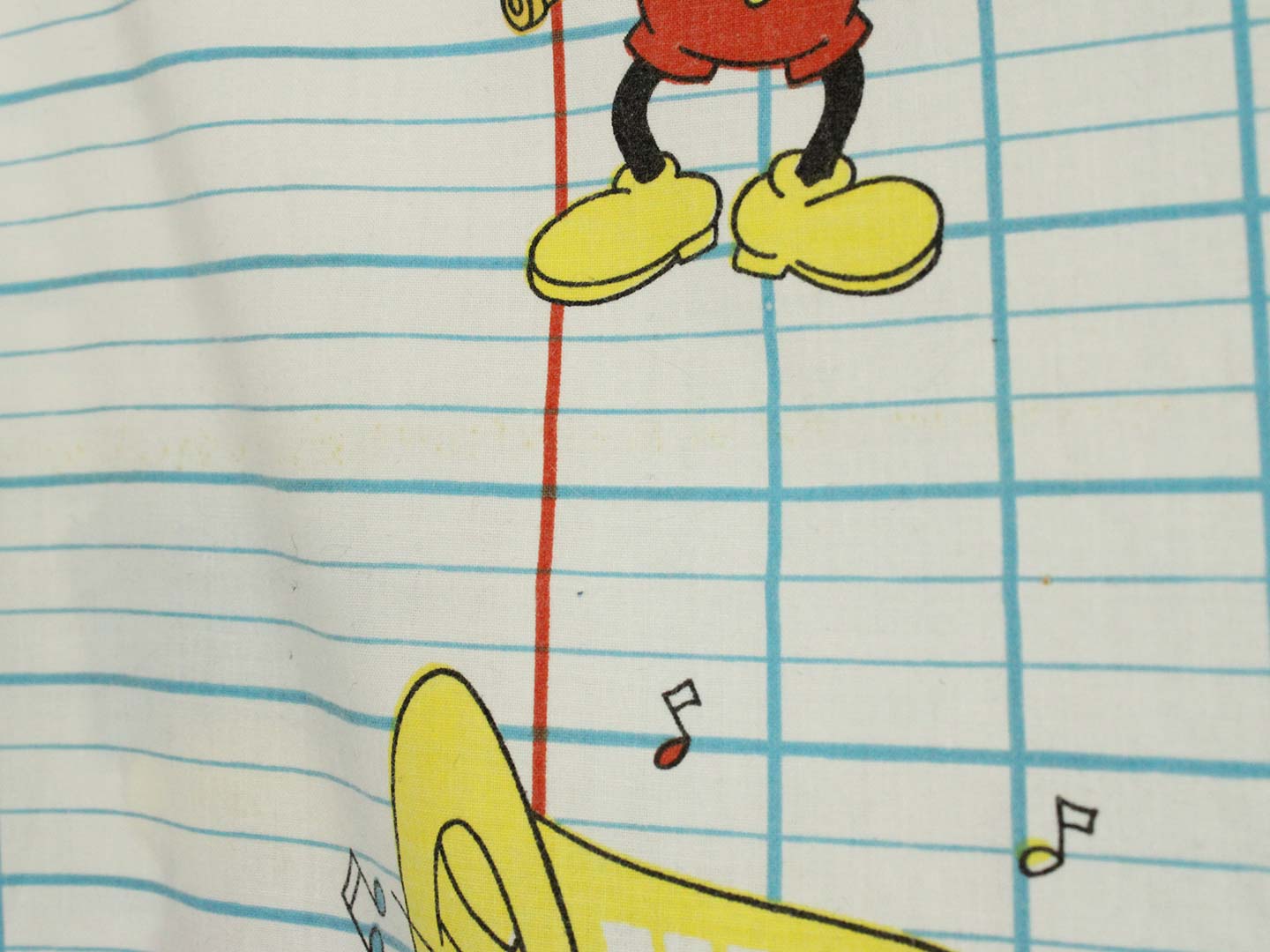 ミッキー、ミニー、グーフィーやプルート。シンプルな絵柄のキャラクターたちが可愛らしい、ミュージック柄のフラットシーツです。1枚もののシーツです。全体画像(1,2枚め)はそれぞれシーツを2つ折りにして撮影しています。化繊混じりのサラッとした手触りの生地です。
